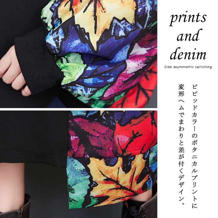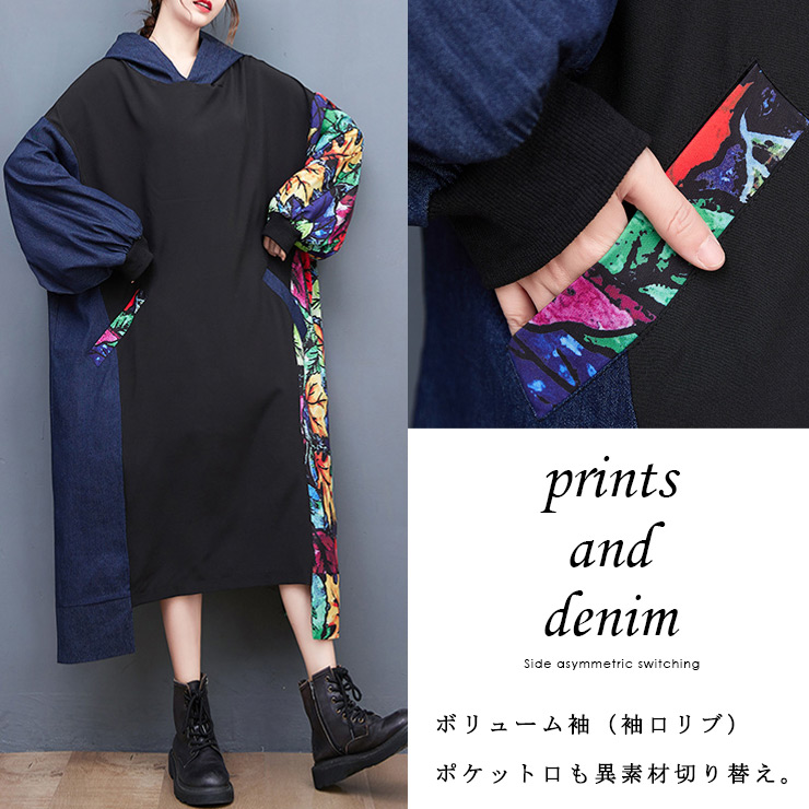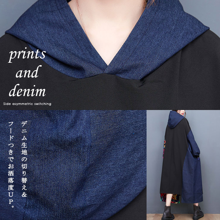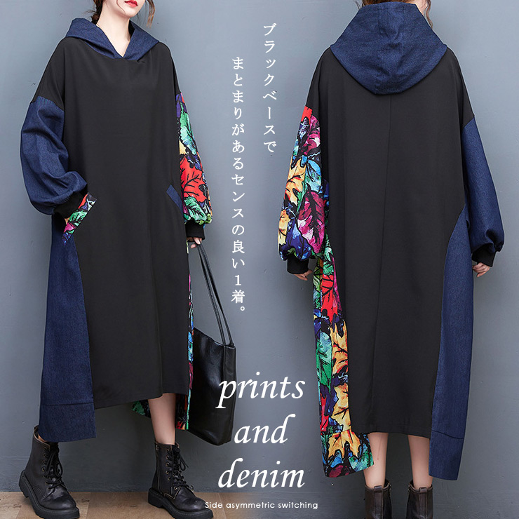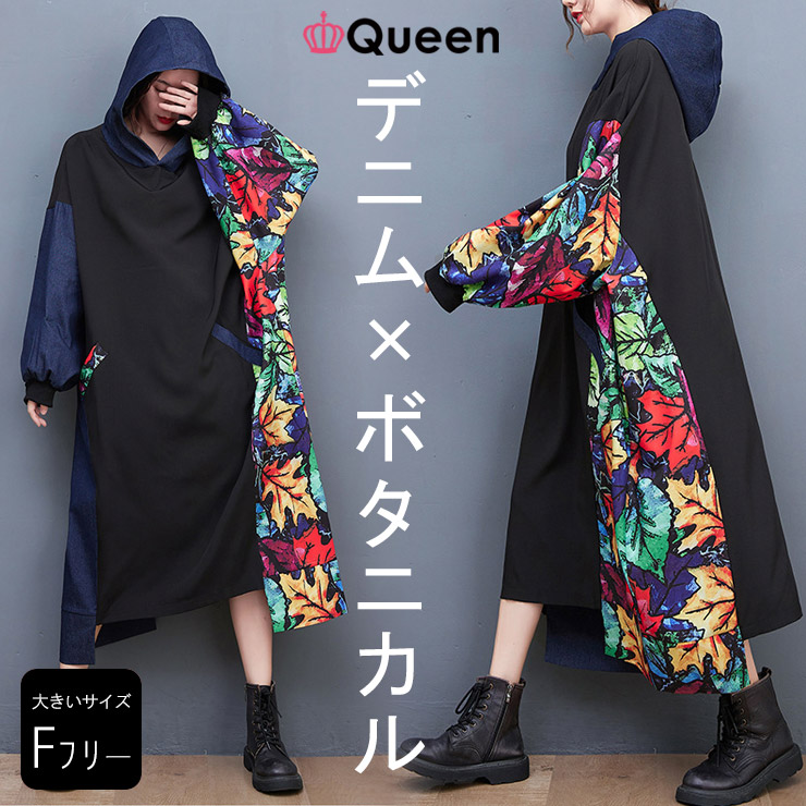 ★☆大きいサイズ レディース パーカーワンピース オーバーサイズ 長袖 ボタニカル柄 デニム 春 秋 LL 3L 4L 5L ブラック 新入荷 。不可☆★