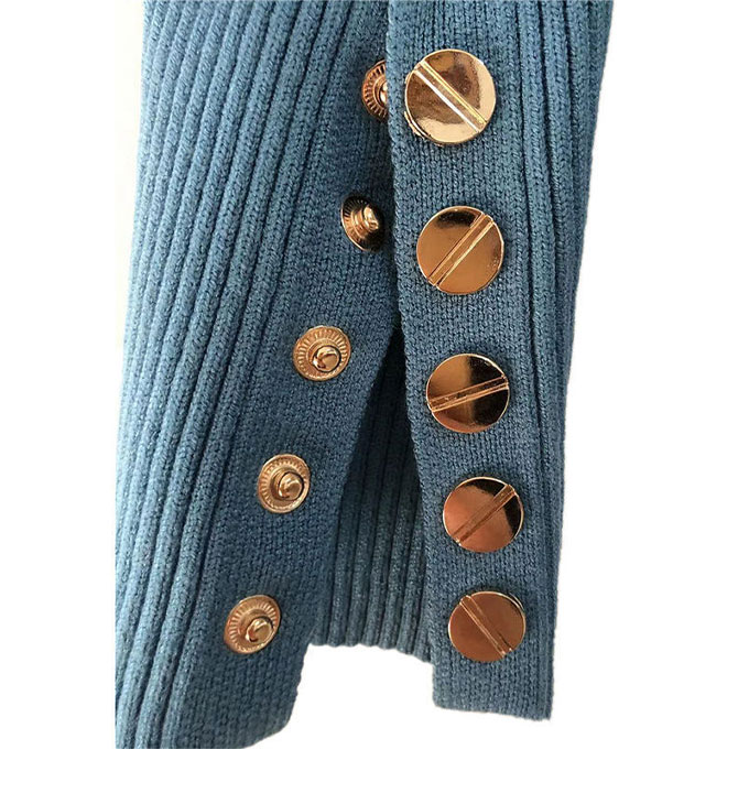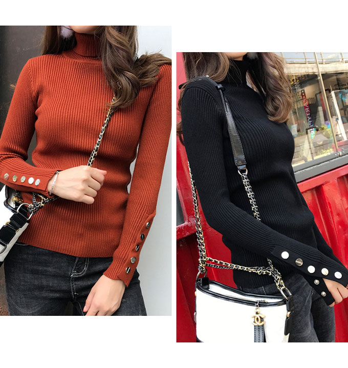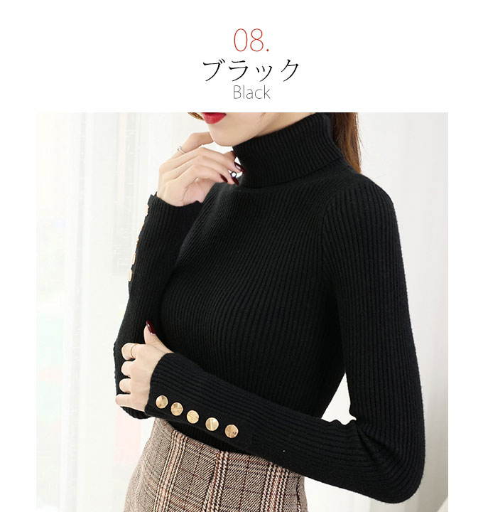 秋冬の定番、タートルネックニットも袖のゴールドボタンがポイントに!