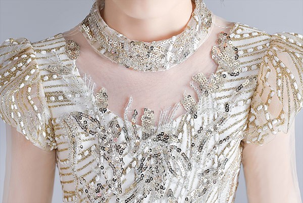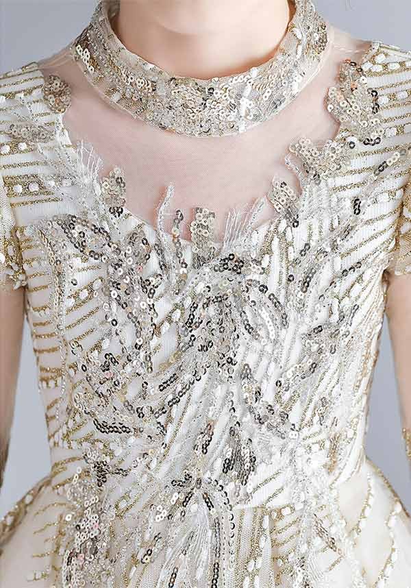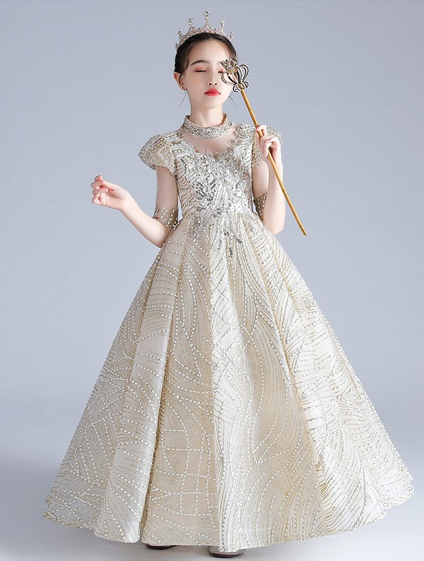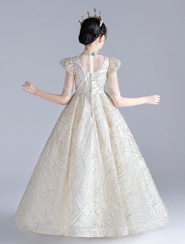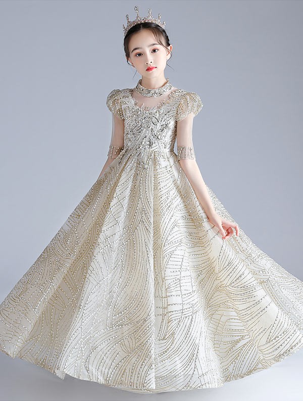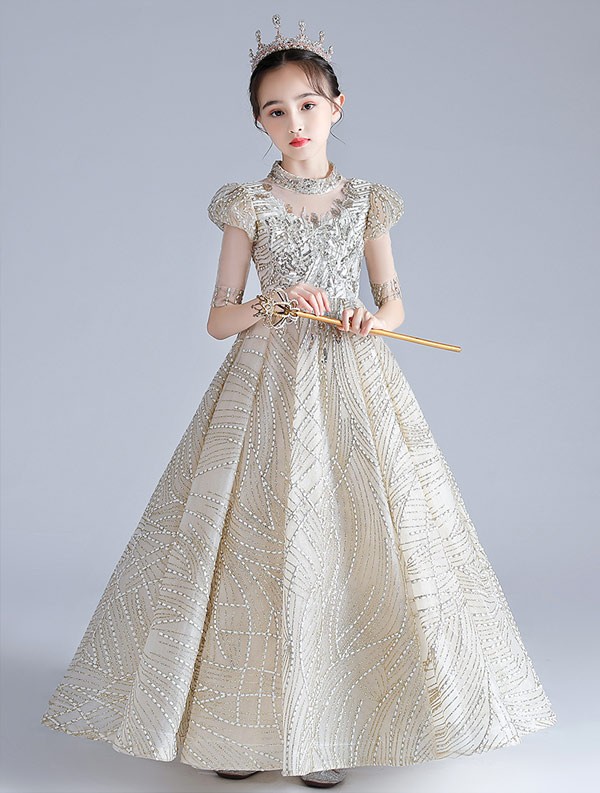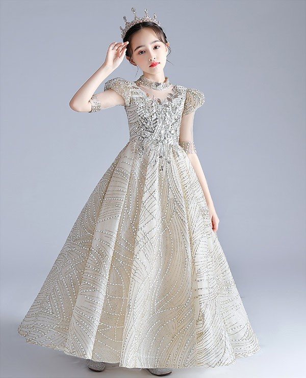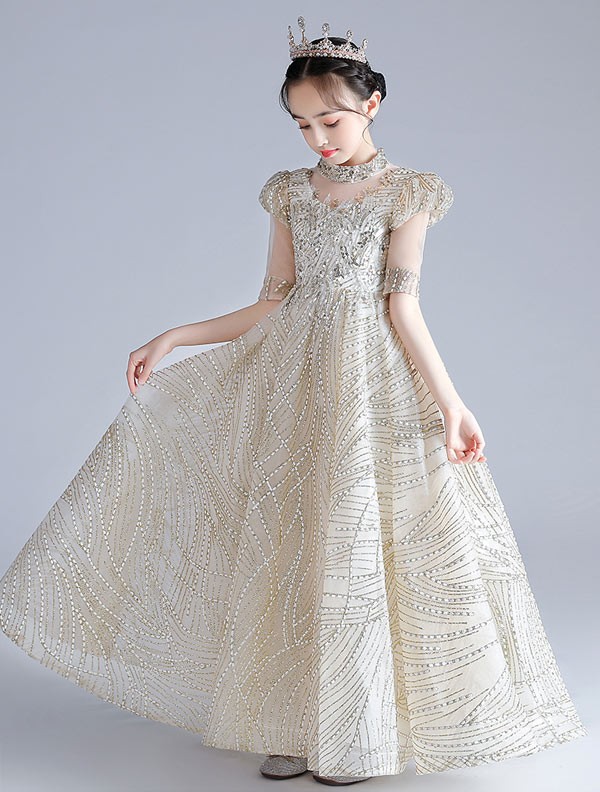 キッズドレス キラキラ ハイネック ファスナータイプ シンプル 袖あり ボリューム袖 パフスリーブ パフ袖 五分袖 ロング丈 ドレス ロングドレス ピアノ 発表会 子供ドレス パーティードレス カラードレス ワンピース プリンセス風 お姫様 上品 エレガント 女の子 ゴージャス 結婚式 子供 フォーマル かわいい 豪華 誕生日 七五三 ブライズメイド 演出 イベント 司会 写真用 大きいサイズ 110 120 130 140 150 160