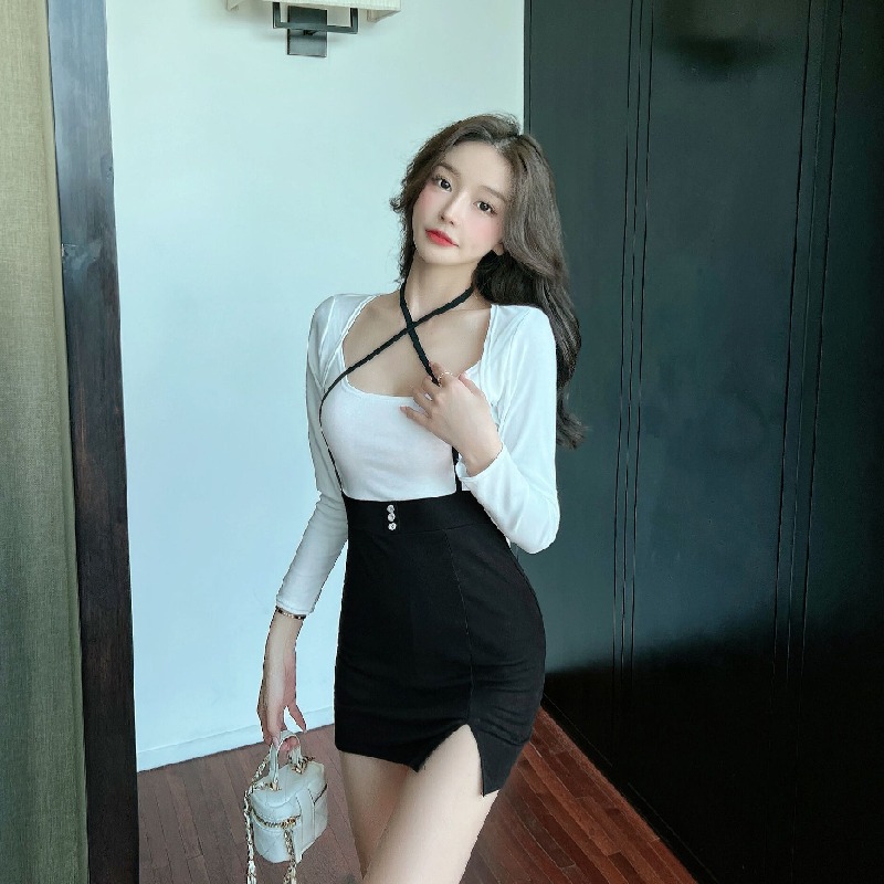 タイトワンピース レディース 長袖 裾スリットUネック 胸元 フェイクレイヤードデザイン セクシー タイト スリム フィット ストレッチ ボディコン きれいめ