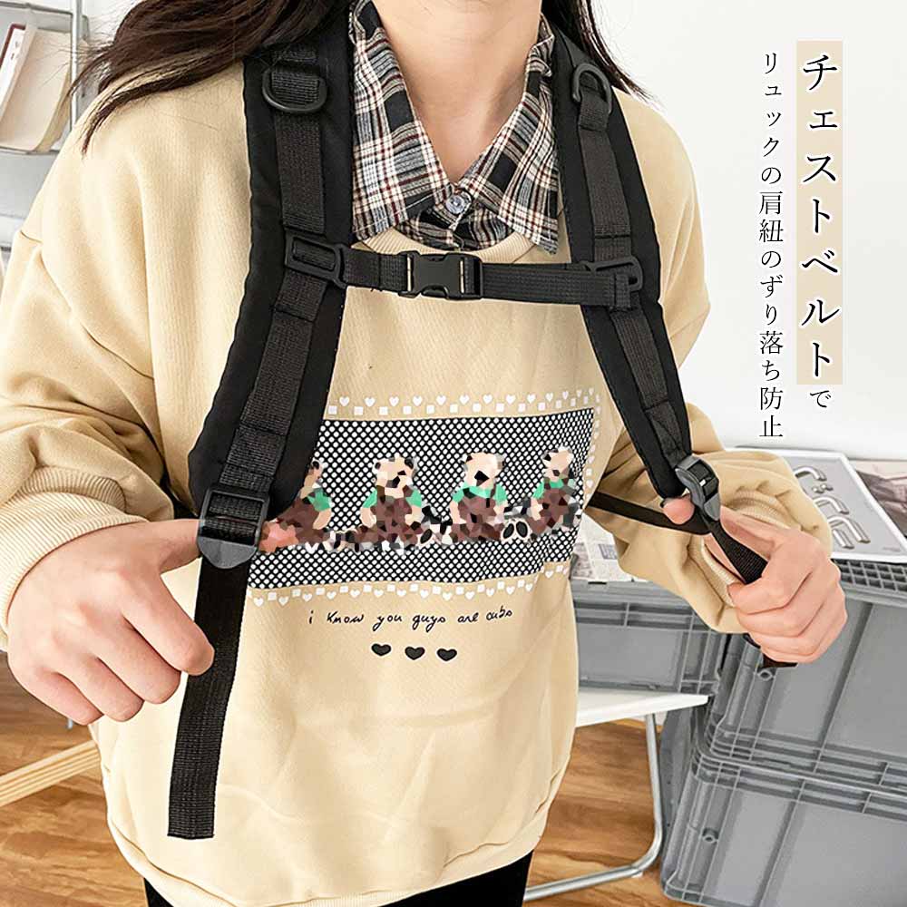 チェストベルトでリュックの肩紐のずり落ち防止、両手が解放されてとても便利。