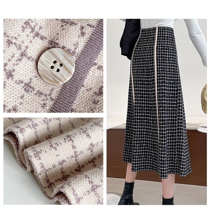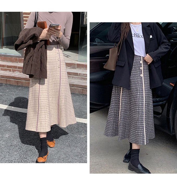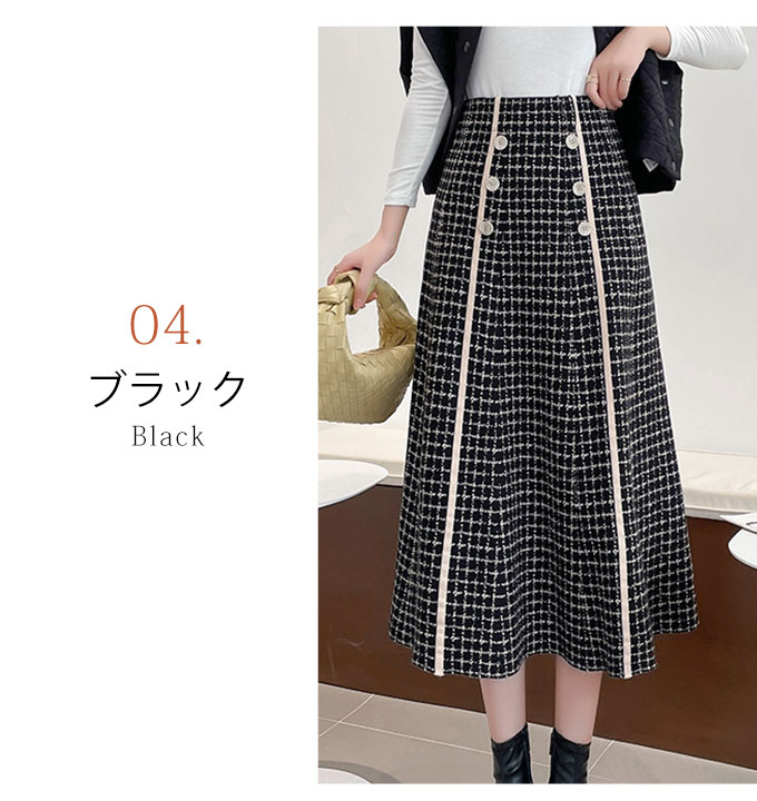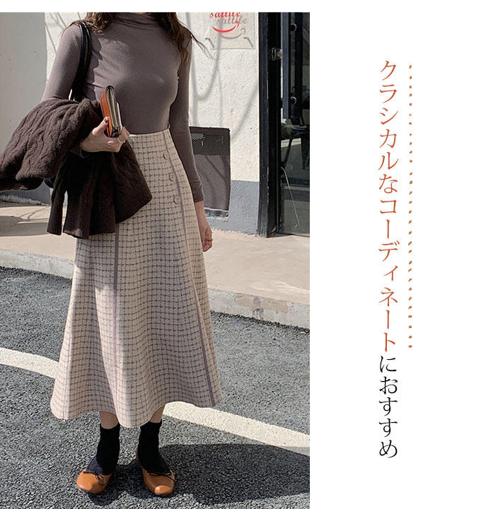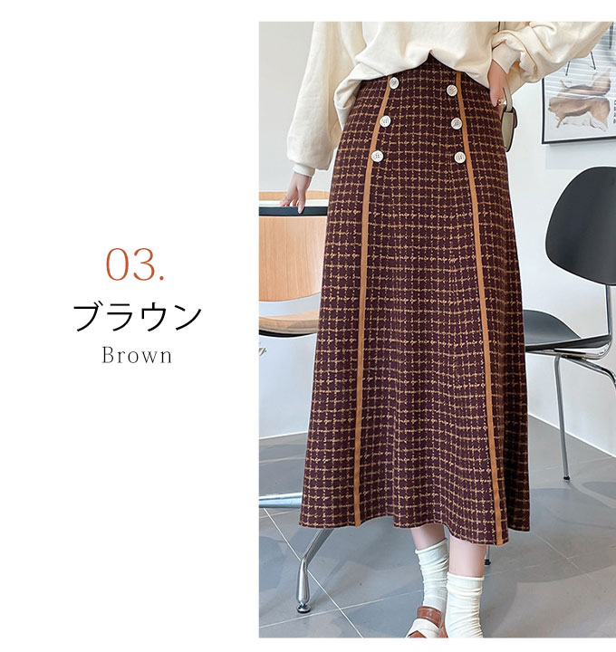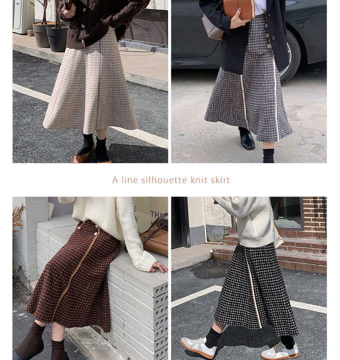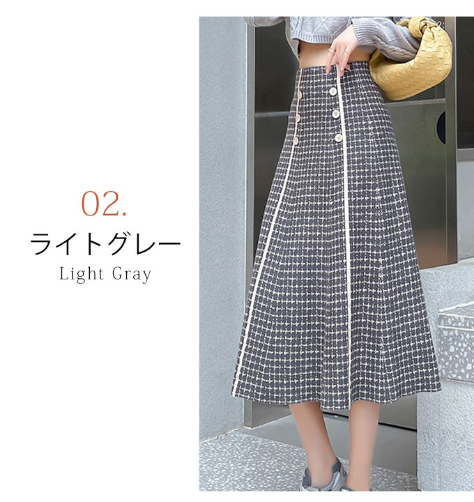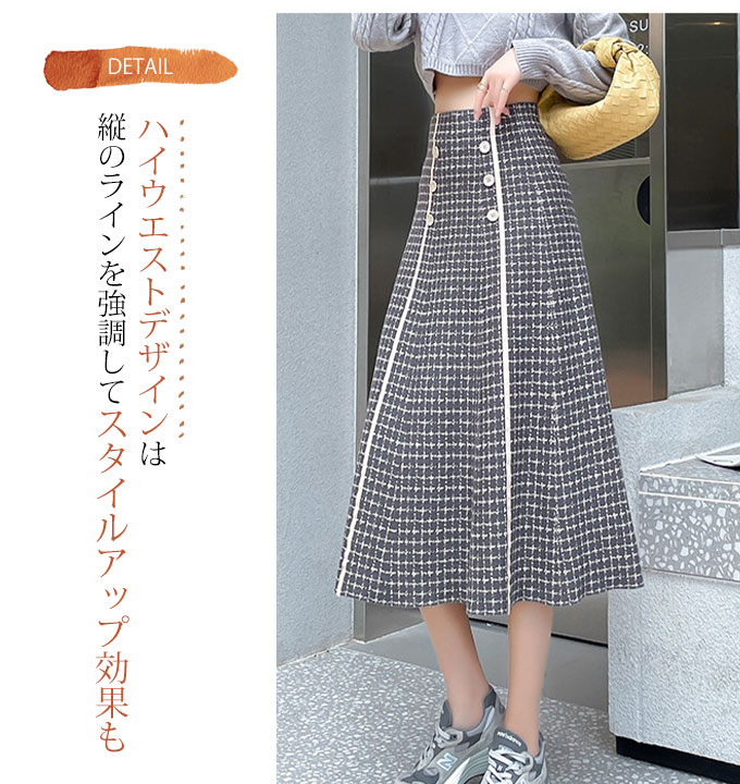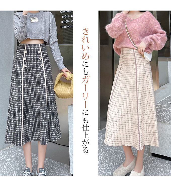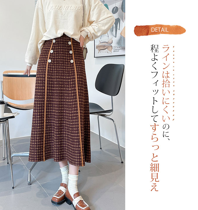 フロントのボタンデザインがかわいい、Aラインのニットスカートです。