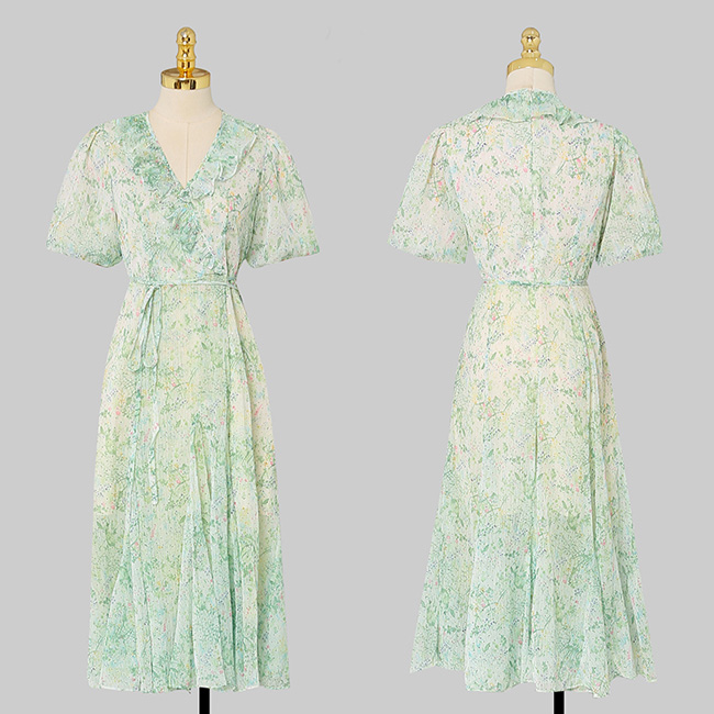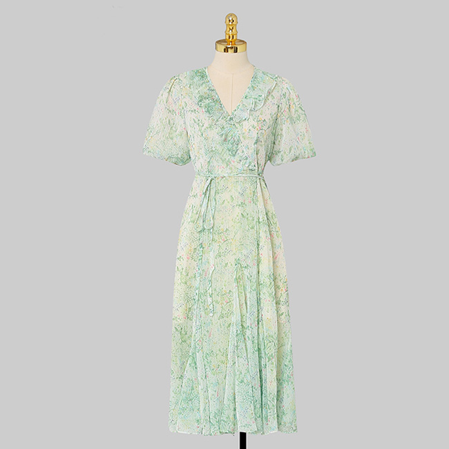 ドレスキャバ。花柄。上品でエレガントな半袖ドレスです。デザインポイントは胸元のVネットフリルラインです。