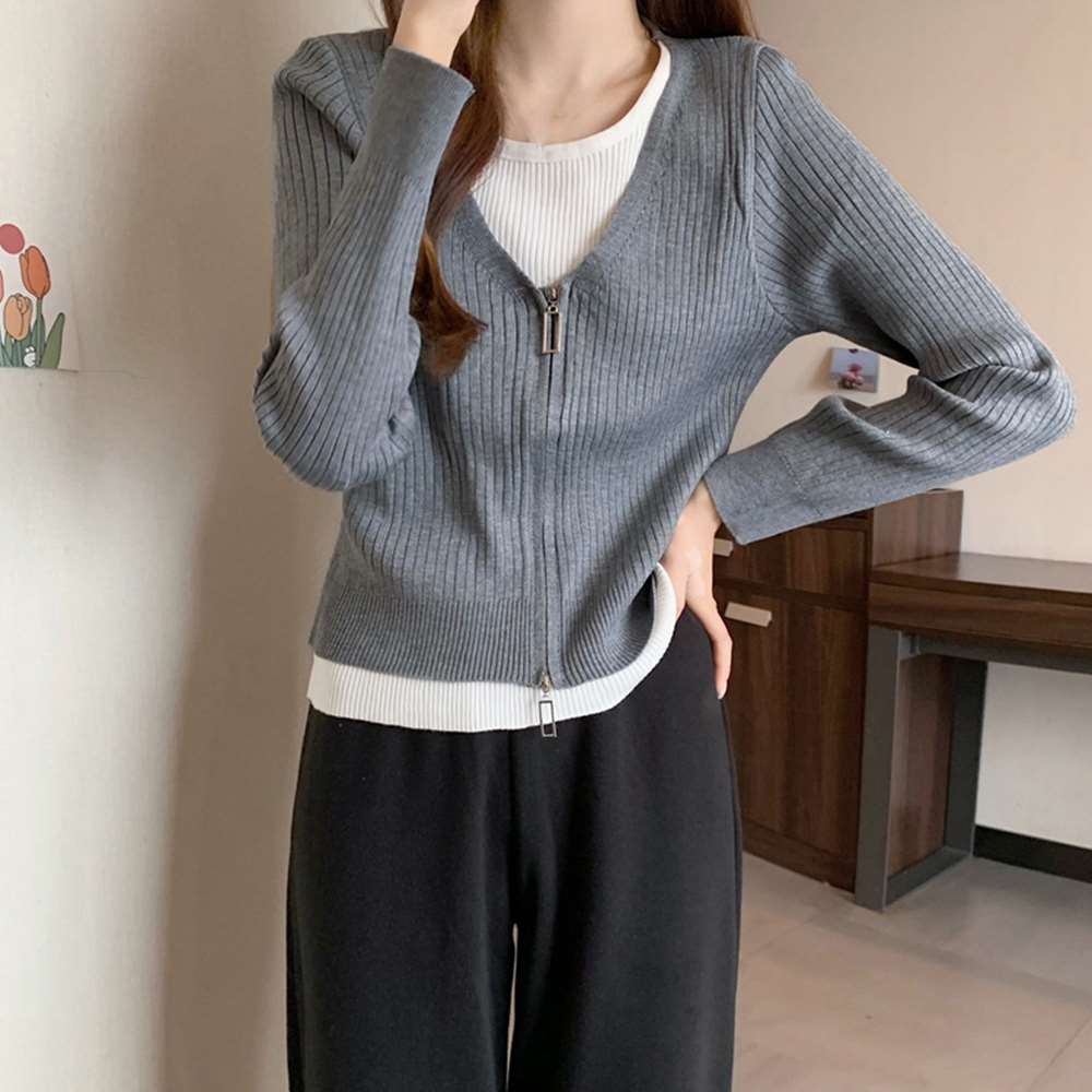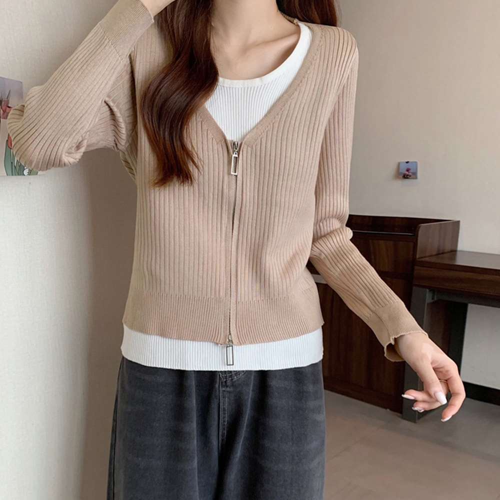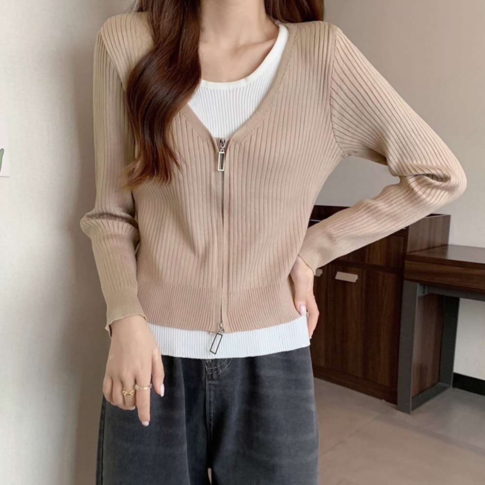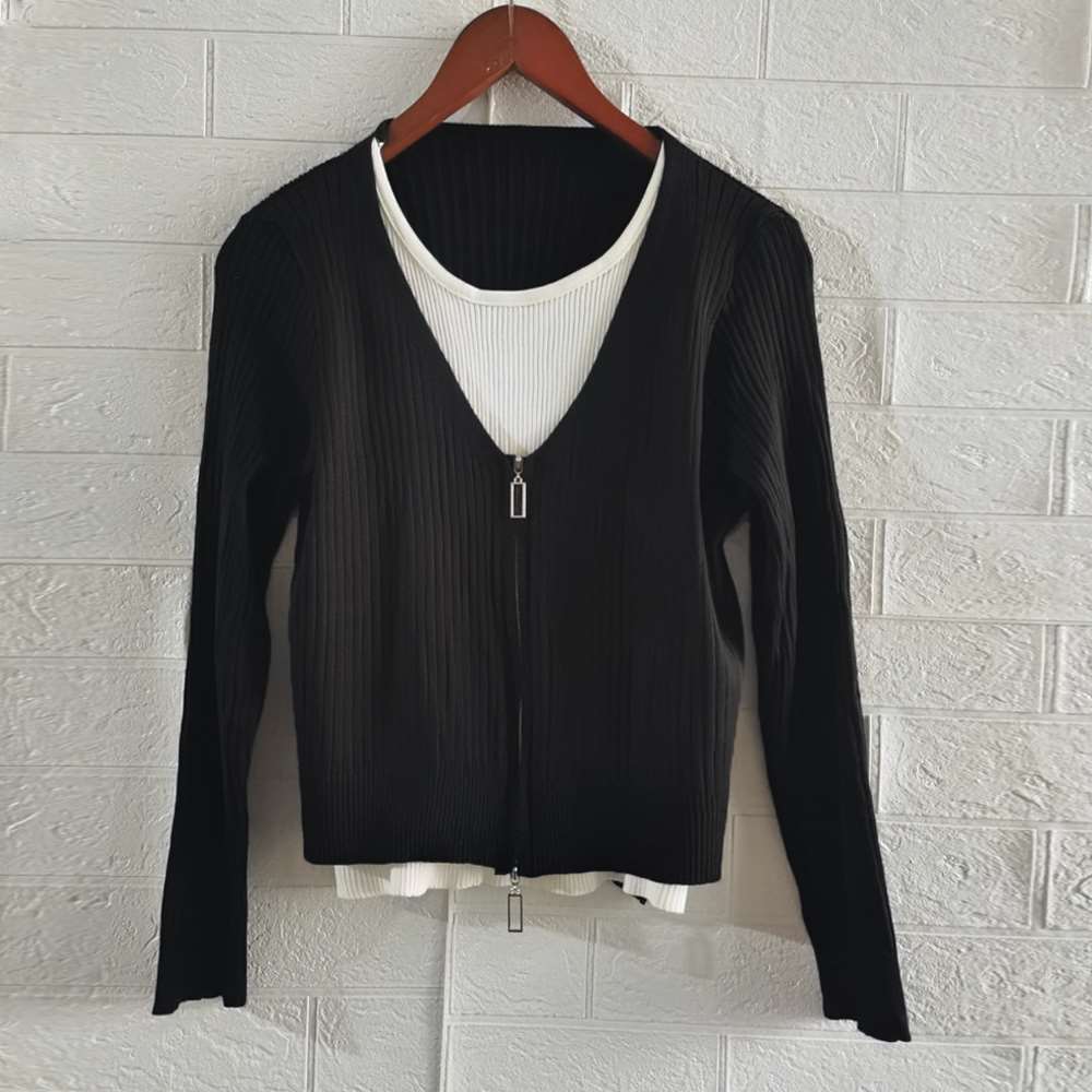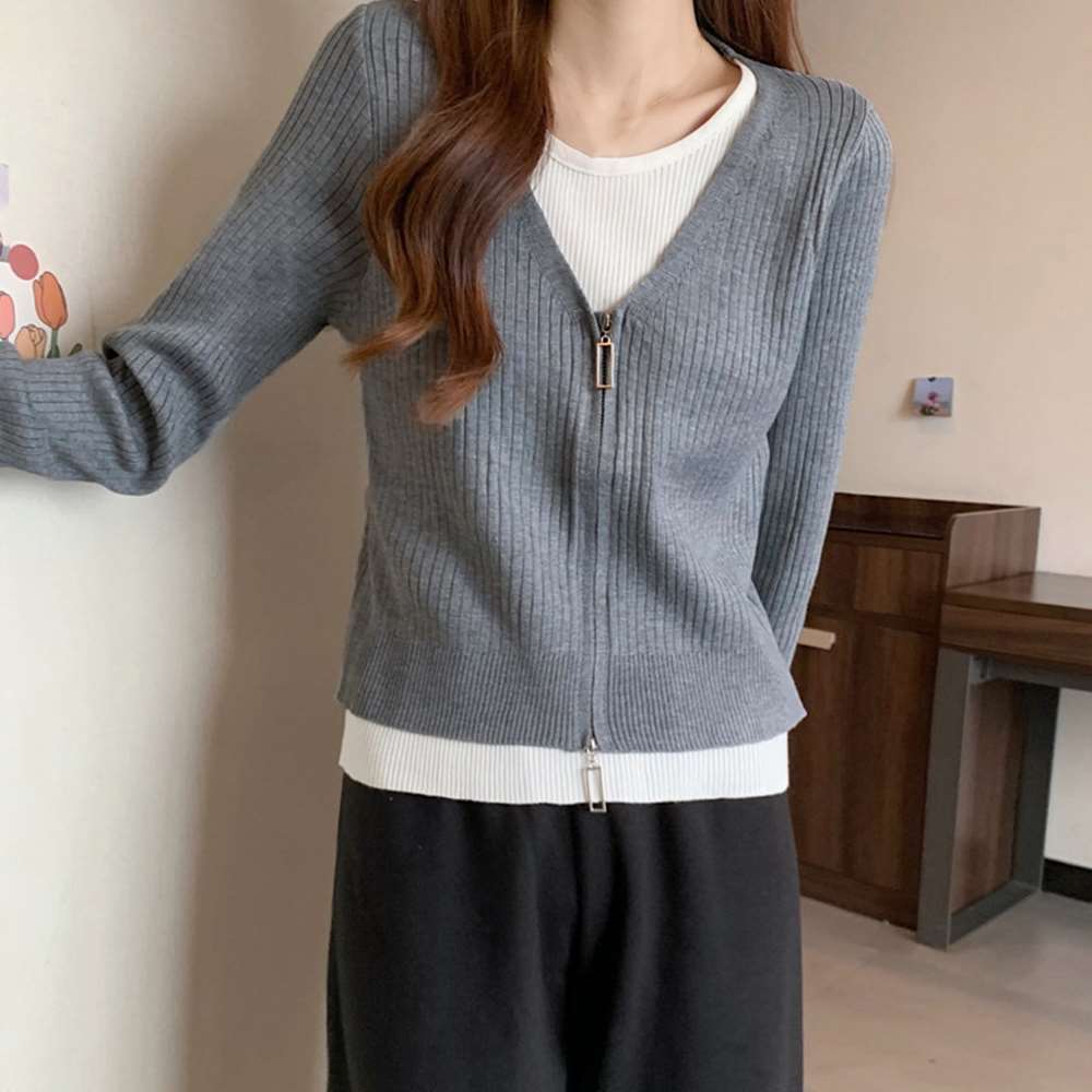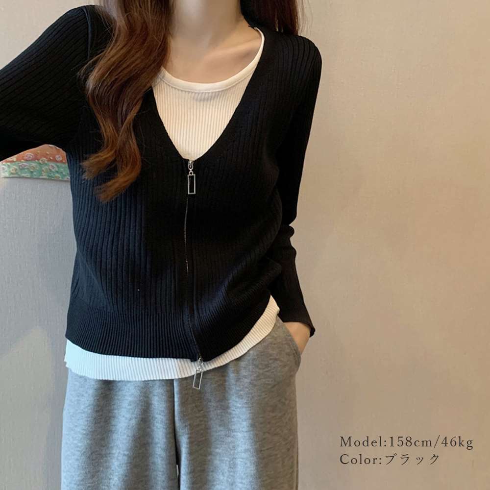 二枚重ねたように見えるバイカラーレイヤード風デザインのニットトップス
