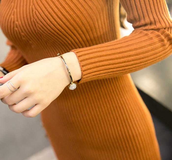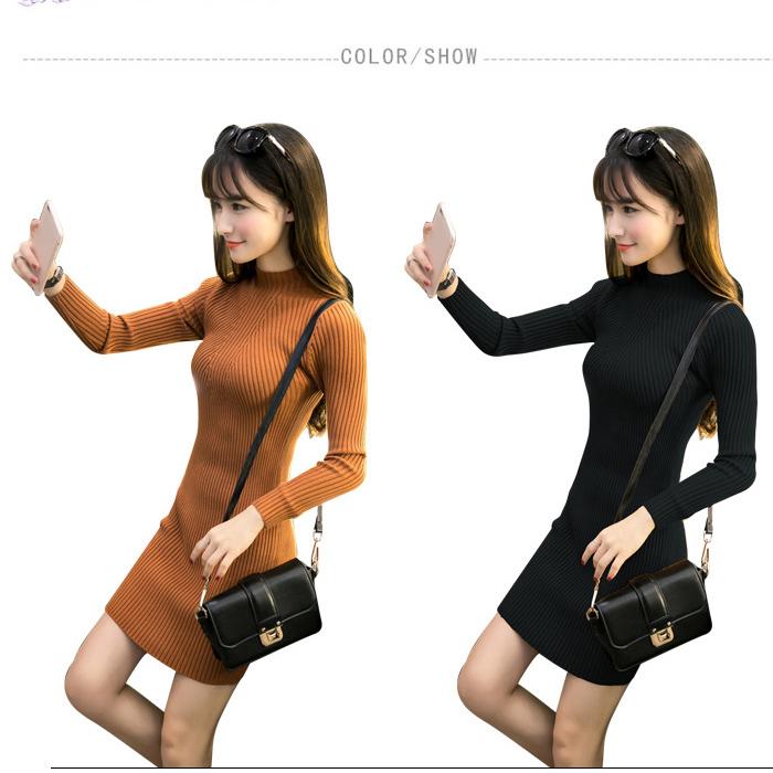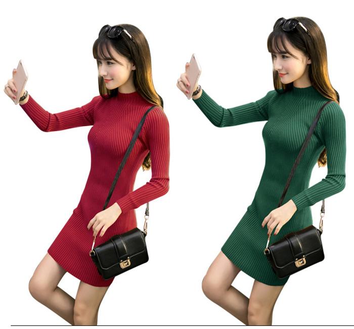 短納期!ハイネックニット ワンピース 秋冬 ニットワンピ 長袖 膝丈 無地 シンプル ひざ 洗える 洗濯 伸縮性 ロング 小顔