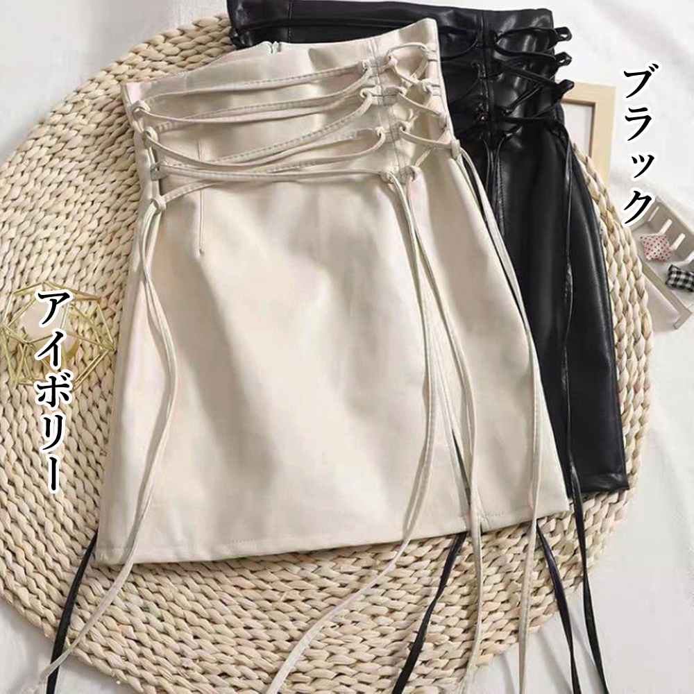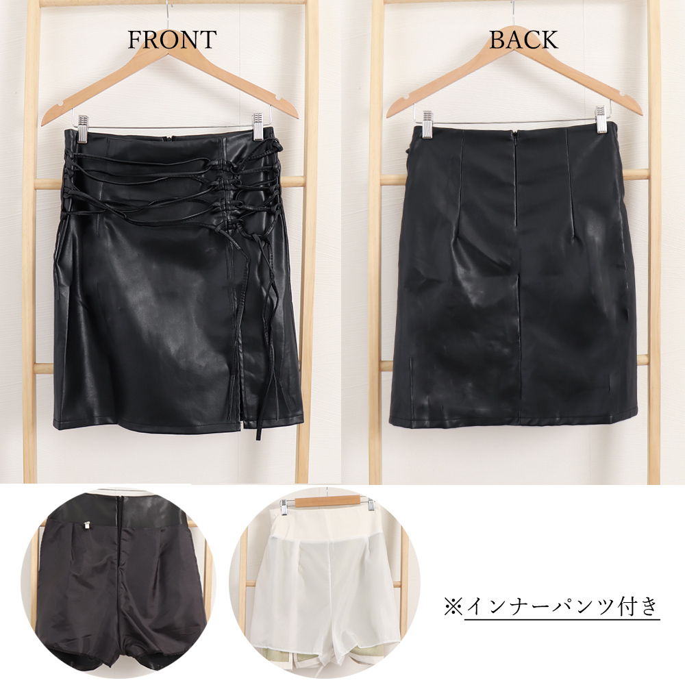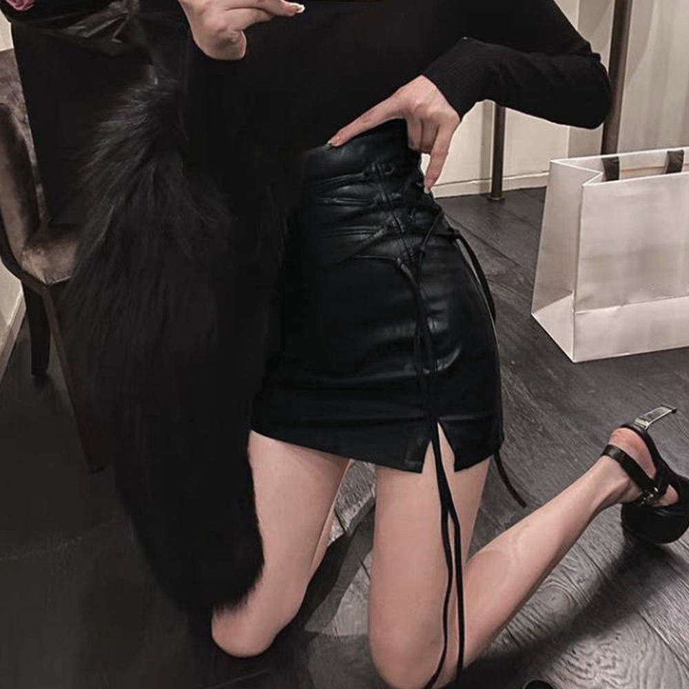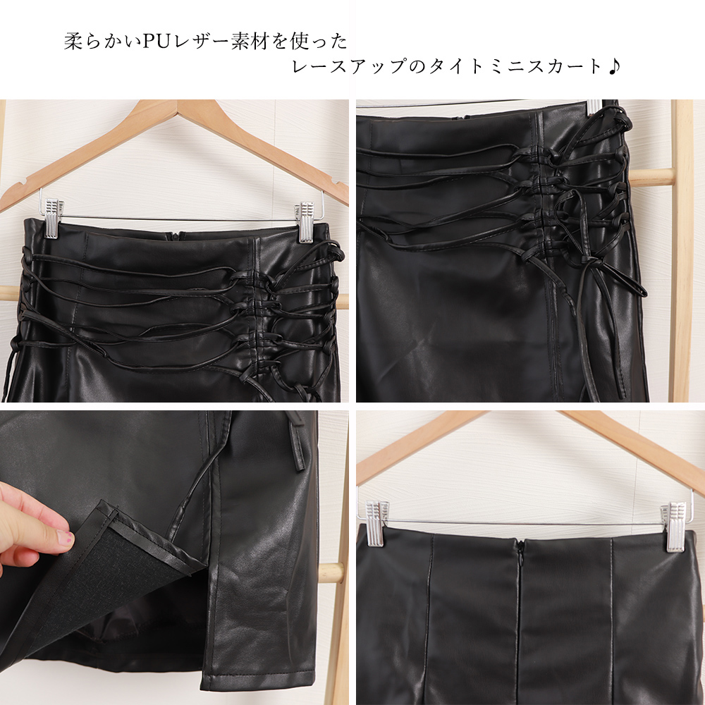 柔らかいPUレザー素材を使ったレースアップのタイトミニスカート