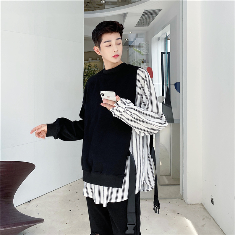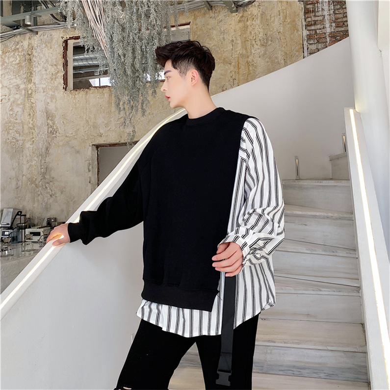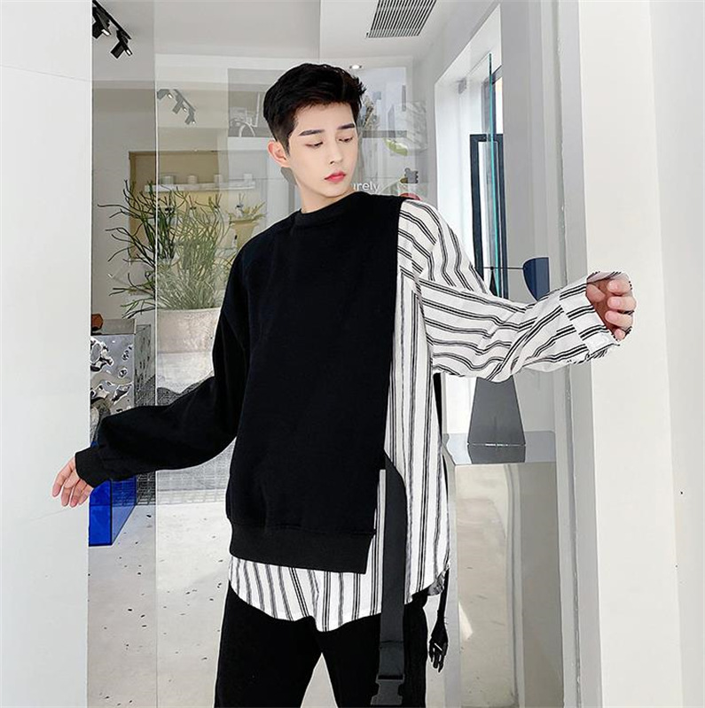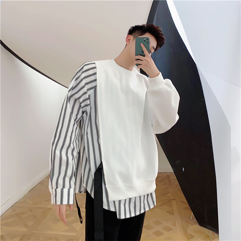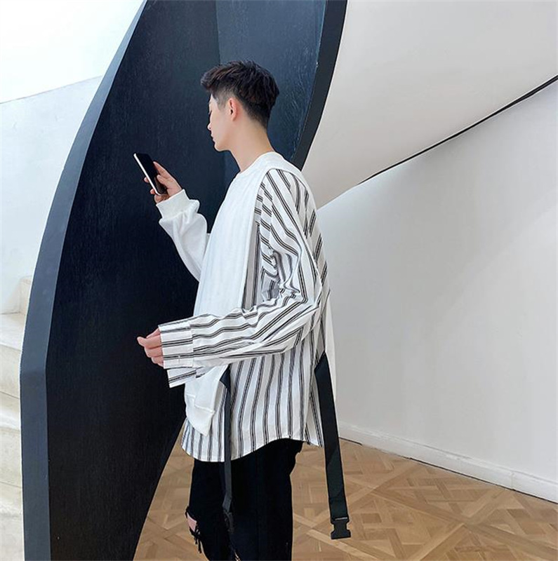 メンズ 丸首 カジュアル 長袖 シャツ 白黒 クラブ 発表会 公演 パーティー ダンスウェア 春秋 スタイリッシュ ワーク ストライプ 男子トップス