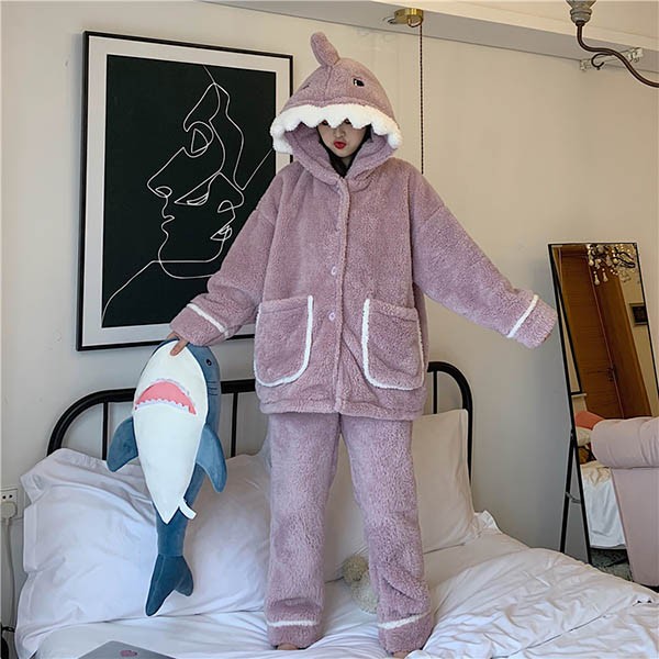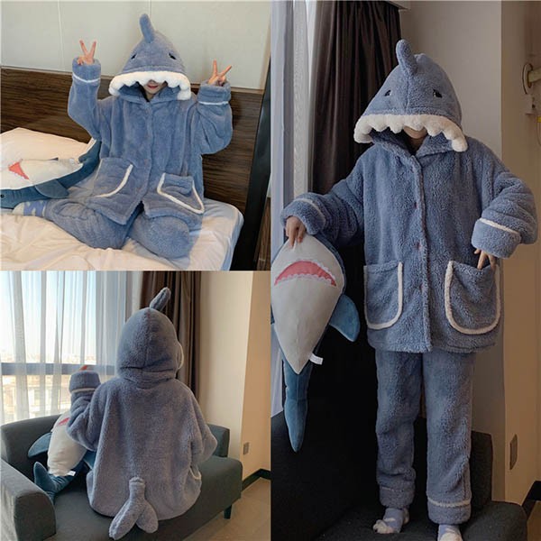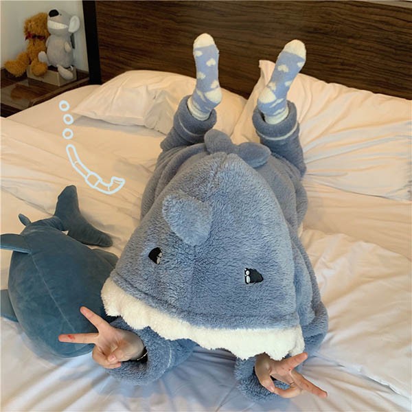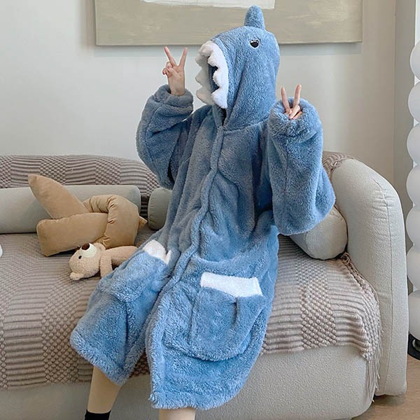 もこもこパジャマ ナイトガウン レディース サメ柄 冬 かわいい 上下ゼット 長袖 ルームウェア フード付き 着る毛布 もこもこ パジャマ 部屋着 寝間着 おうち時間 女性用 ふわふわ 前開き 韓国 暖かい モコモコ あったか プレゼント 結婚祝い ブルー 個性的 目立つ系 N1X0