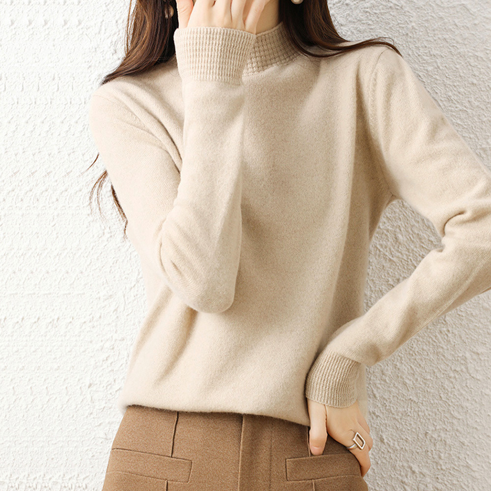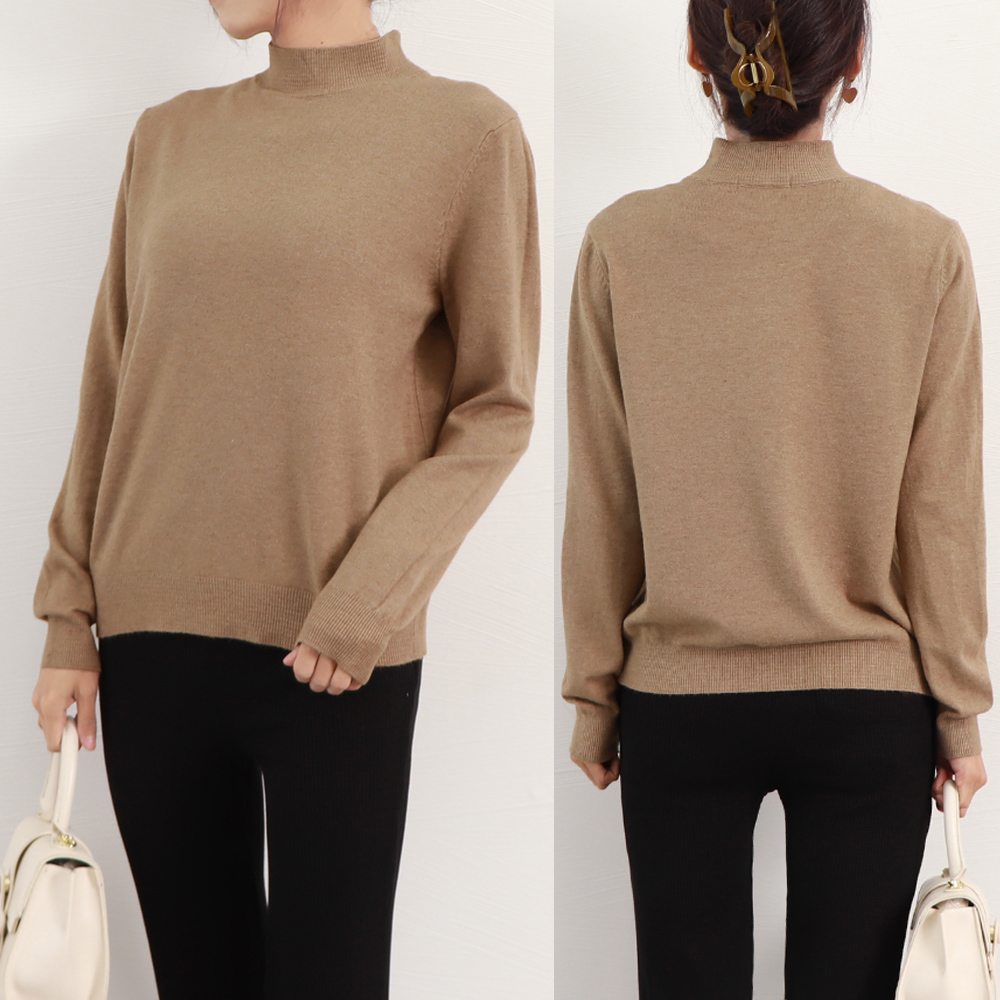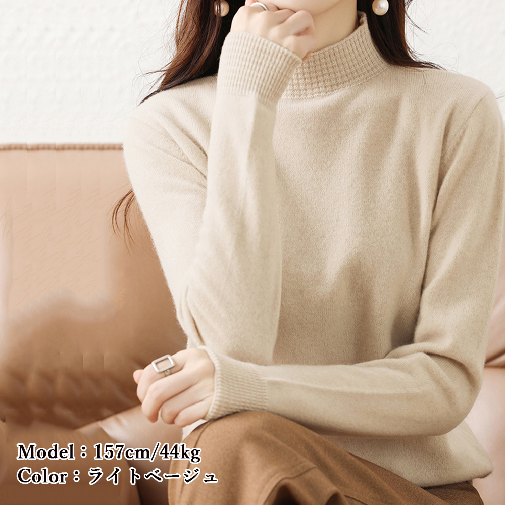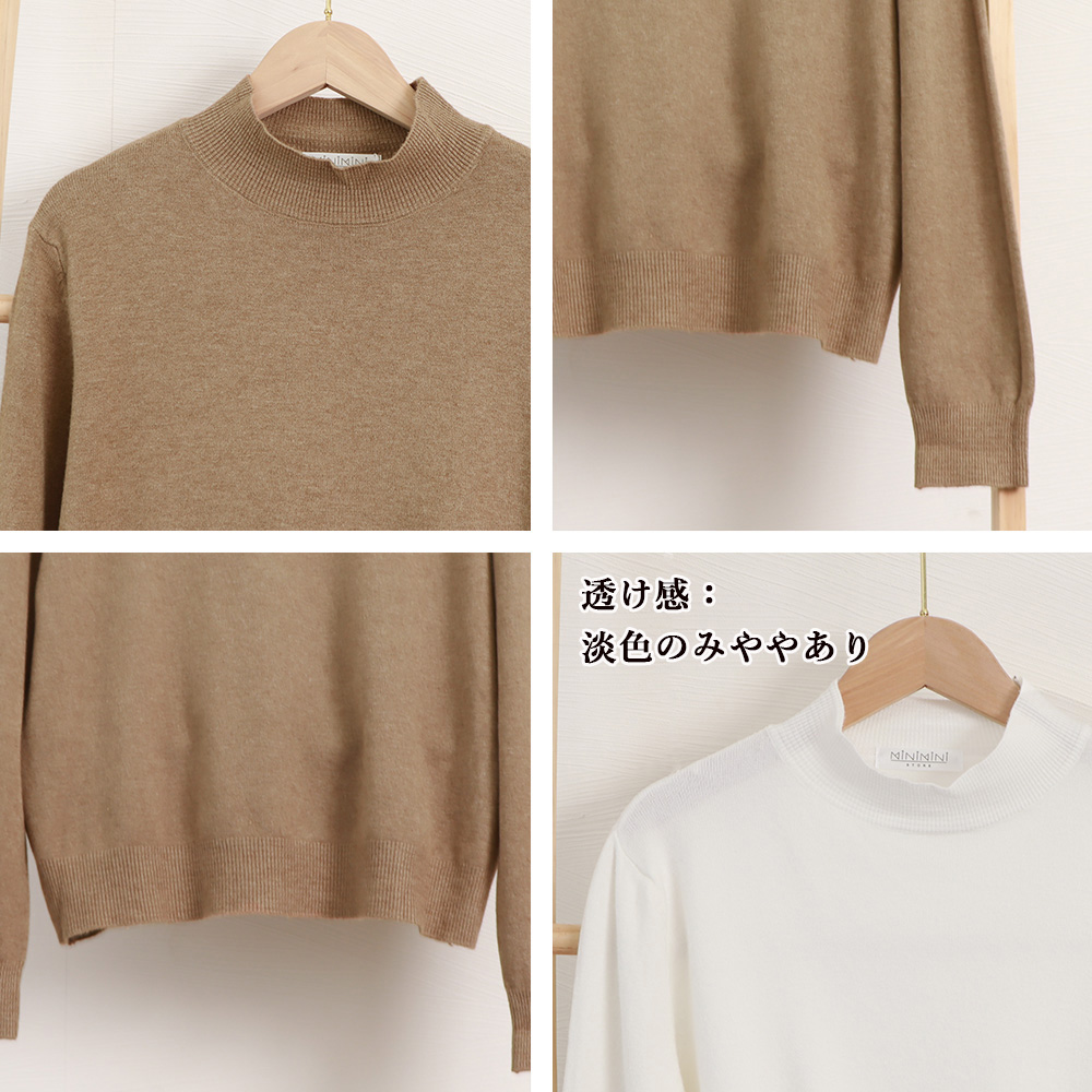 プチハイネックで女性らしい印象に仕上げたニットトップス
