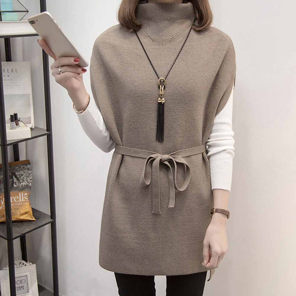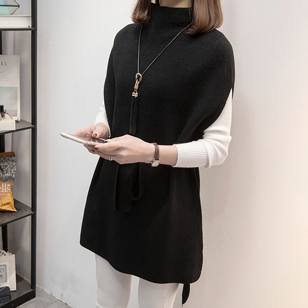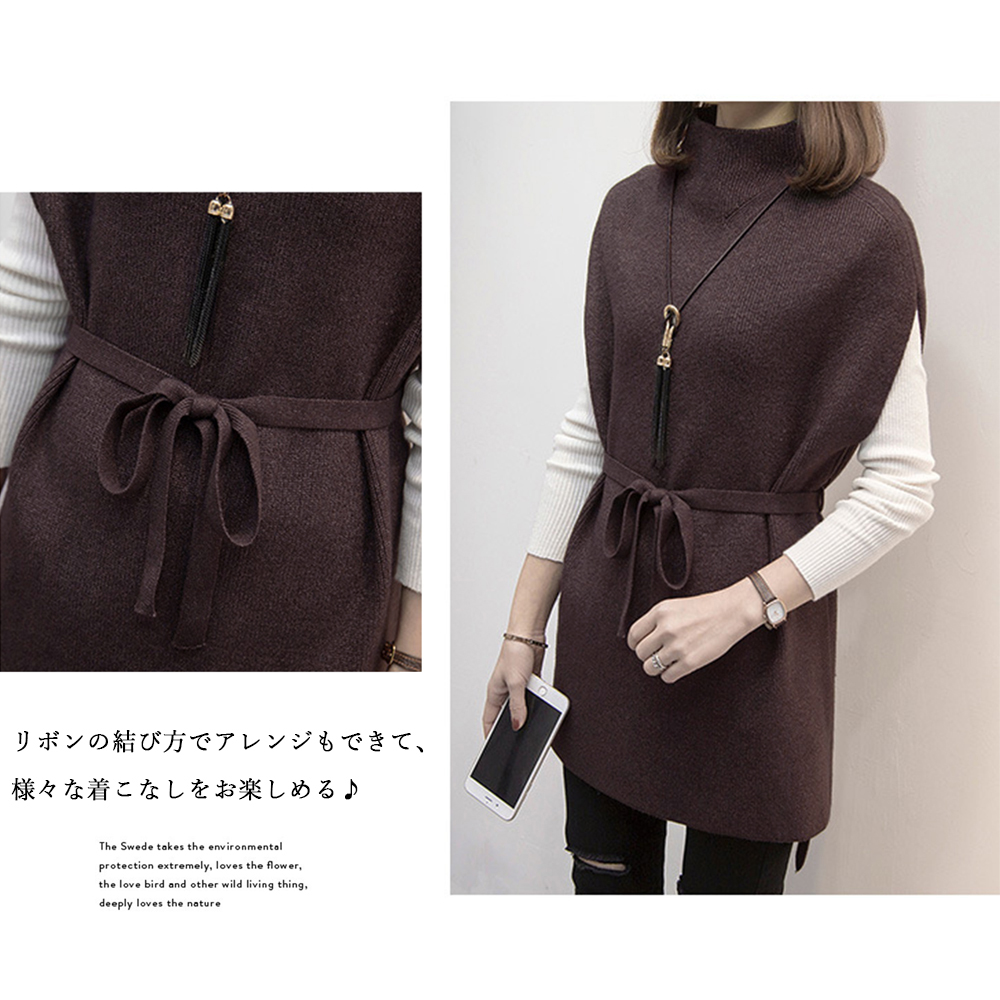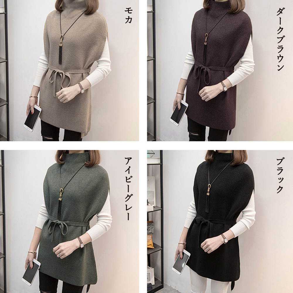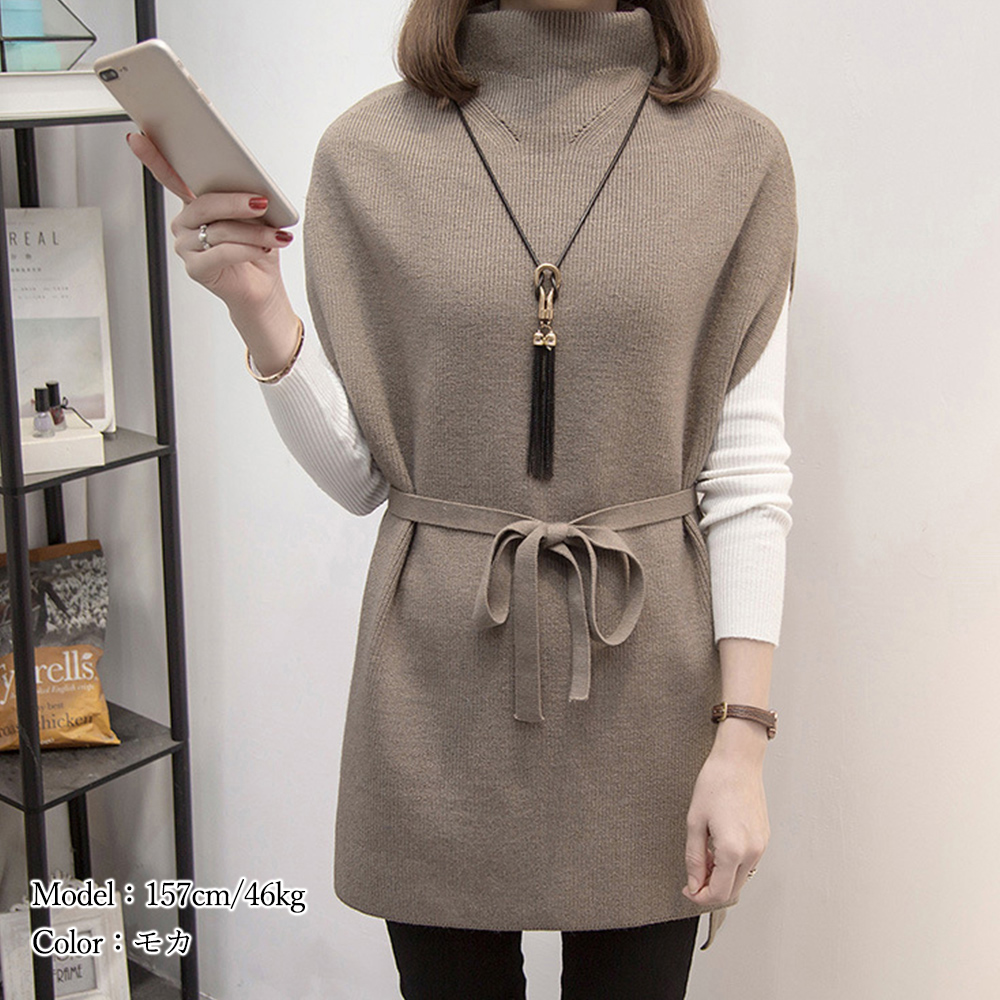 プチハイネック ニットトップス レディース 無地 体型カバー 重ね着 ロングニットベスト 秋冬服 30代40代カジュアル