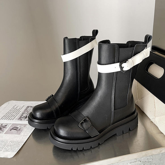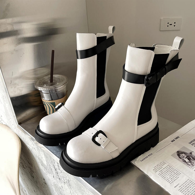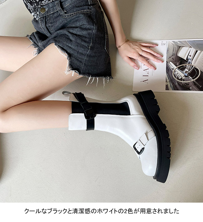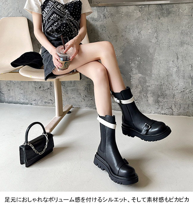 サイドゴアブーツ レディース ブーツ 秋 冬 ミドルブーツ サイドゴア レトロ 厚底 ローヒール ブーツ ピカピカ PUレザー 美脚 PUブーツ ボリューム感 滑り止め シューズ ワークブーツ エンジニアブーツ ホワイト ブラック