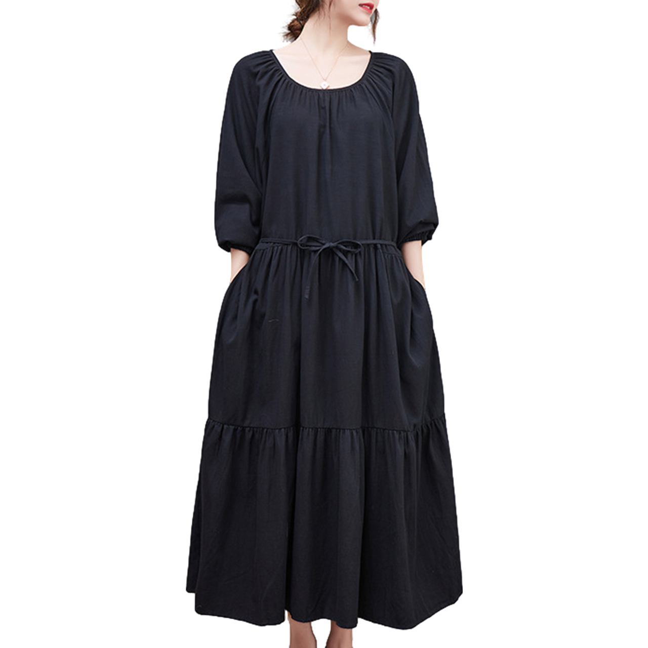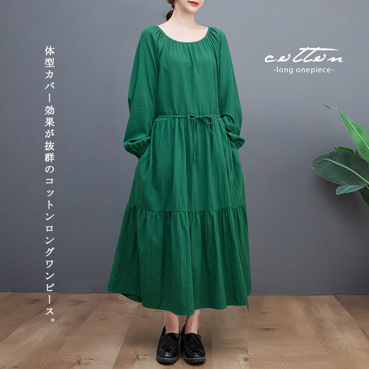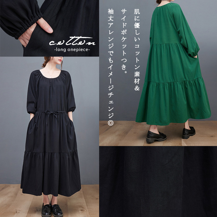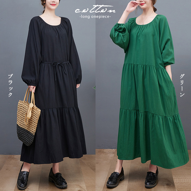 ★☆大きいサイズ レディース ティアードワンピース オーバーサイズ 無地 長袖 リボンベルト 春 秋 LL 3L 4L 5L 6L ブラック グリーン 新入荷 。不可☆★