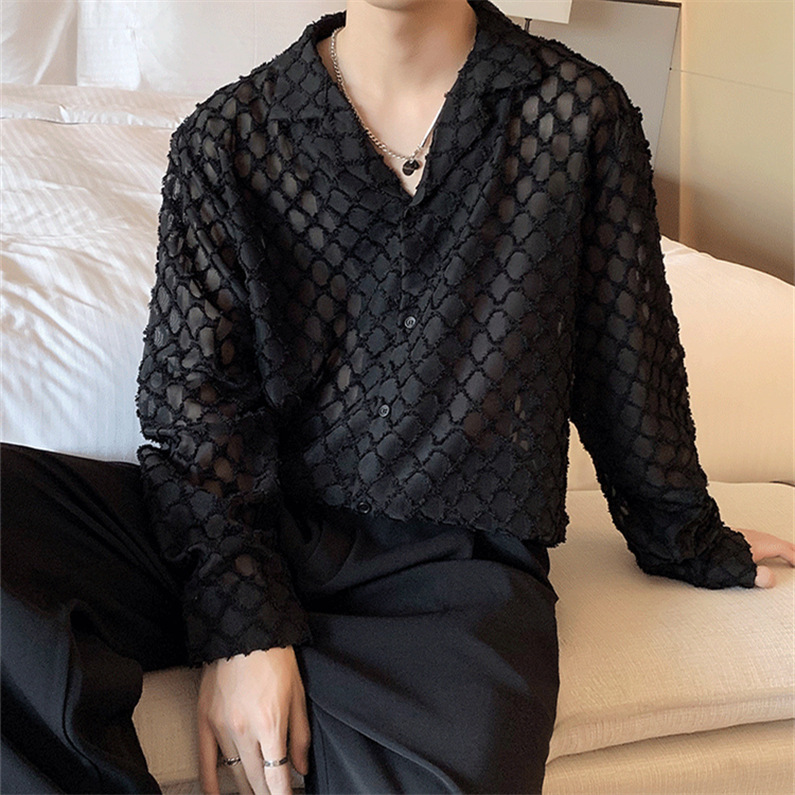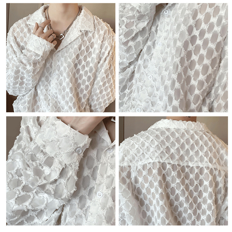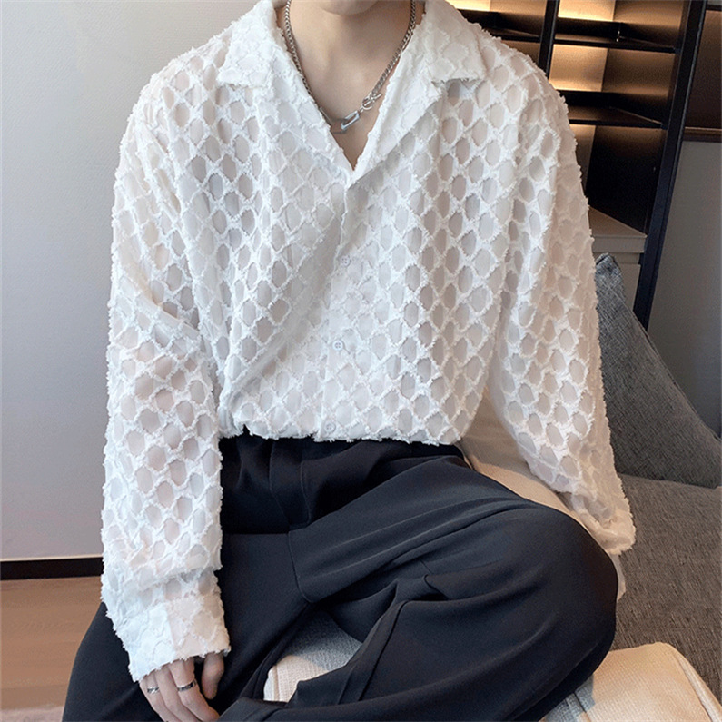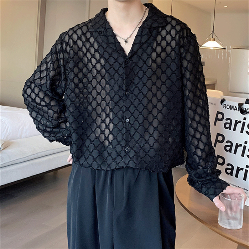メンズ シャツ カジュアルシャツ 長袖 白黒 透け感 公演 ナイトクラブ ブラック スタイリッシュ 菱形 ダンスウェア 発表会 春秋 男子トップス 上着