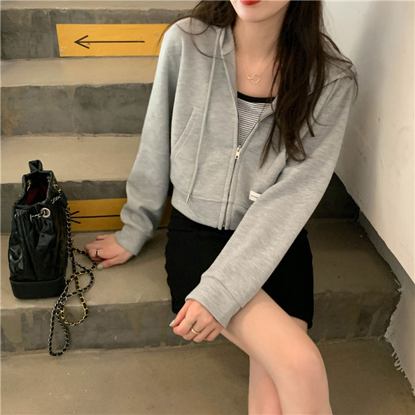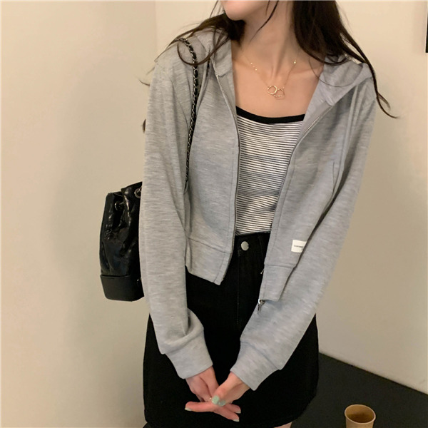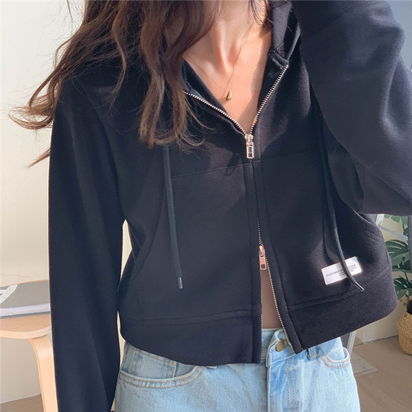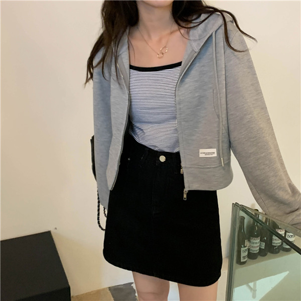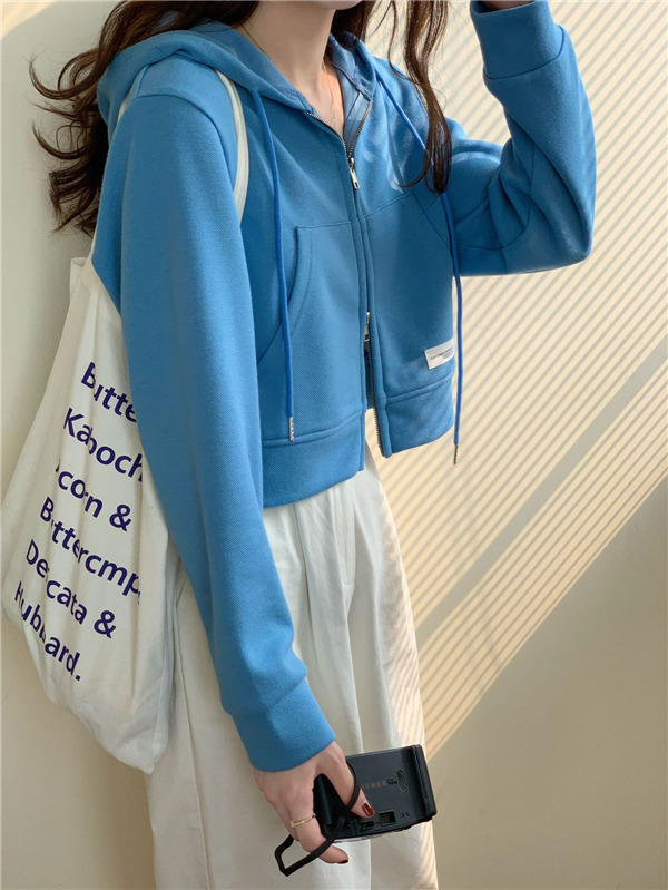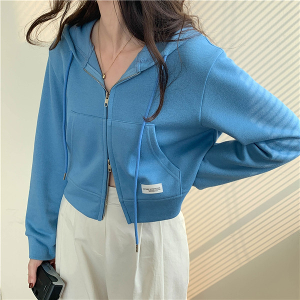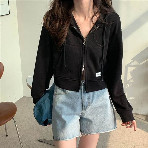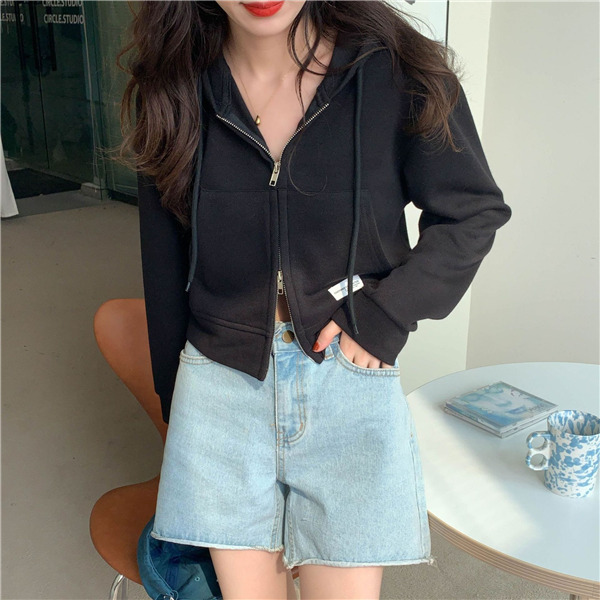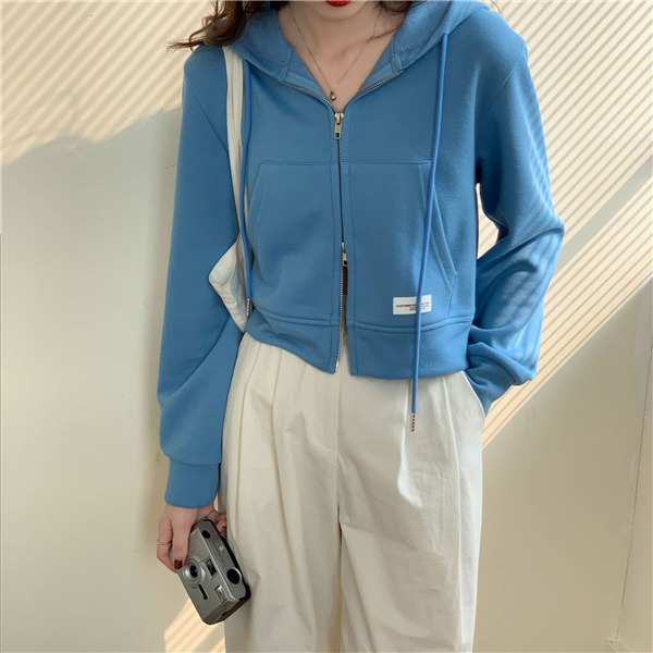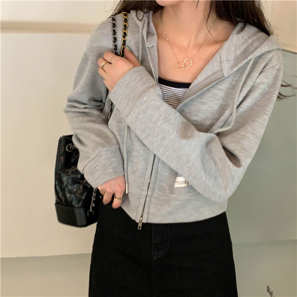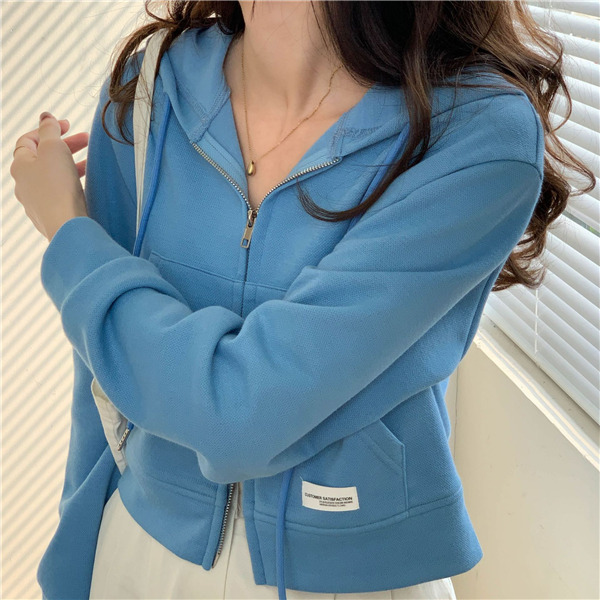 ジップアップ レディース スウェットショート丈 春秋 前開き 長袖 無地 カジュアル フード付 体型カバー 羽織