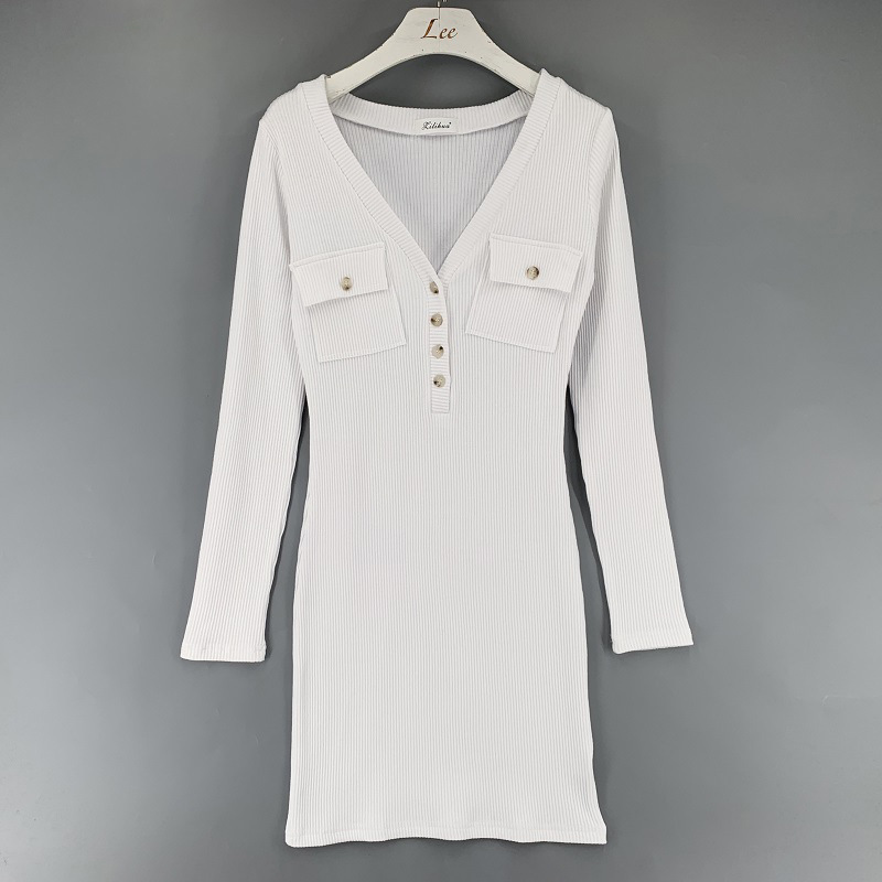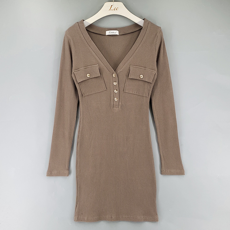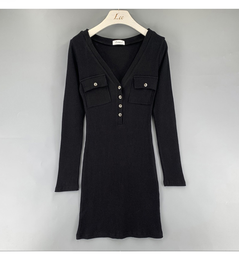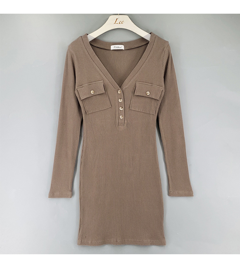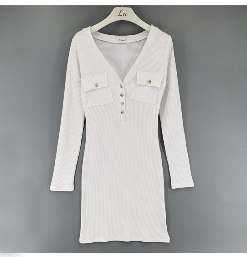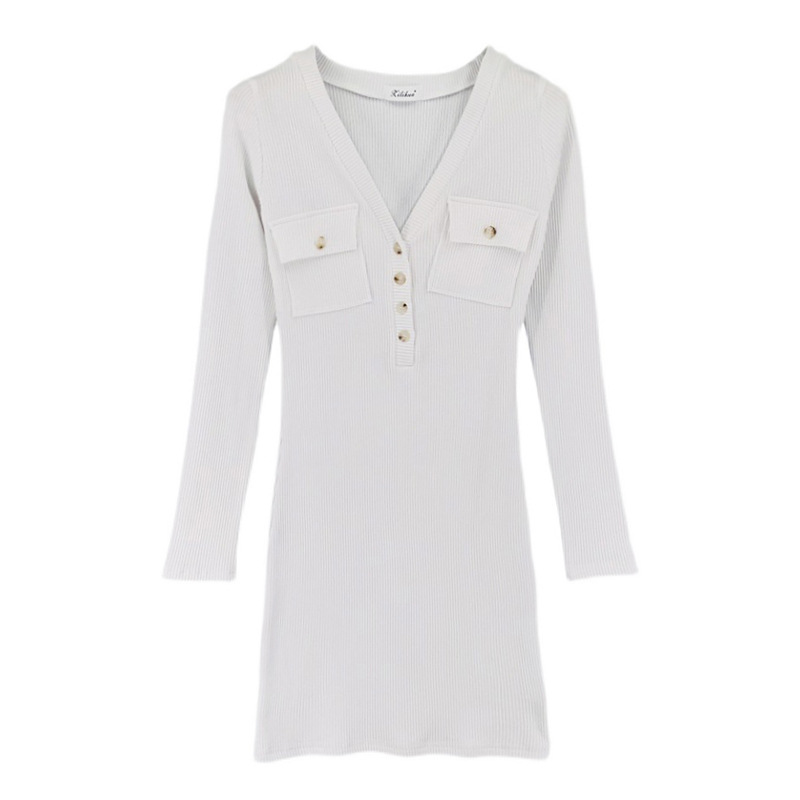 ニットワンピース タイト ストレッチ レディース 長袖 Vネック ボタン 両ポケット付き ミニ丈 セクシー ボディコン きれいめ おしゃれ インナーワンピース