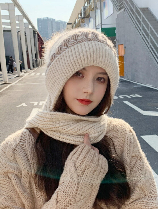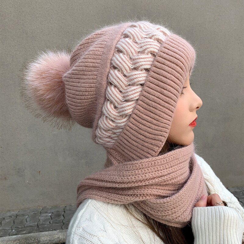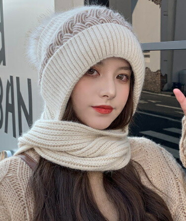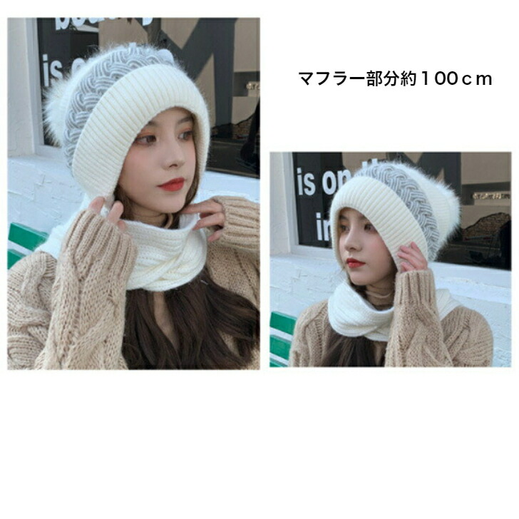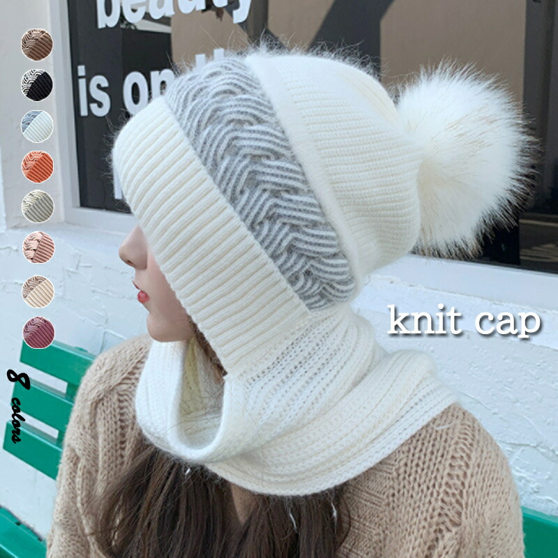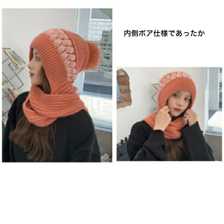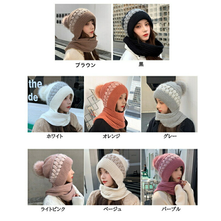 帽子 マフラー一体型ポンポンニット帽 新発売セール