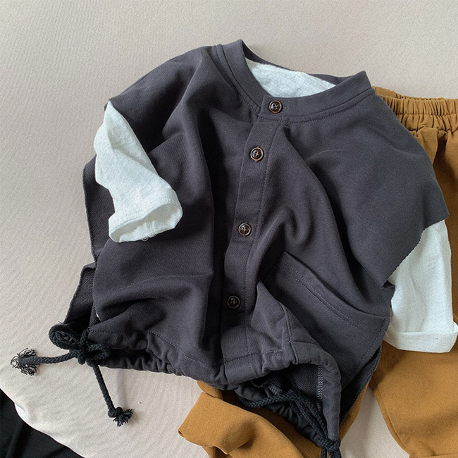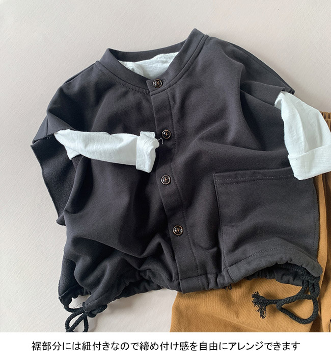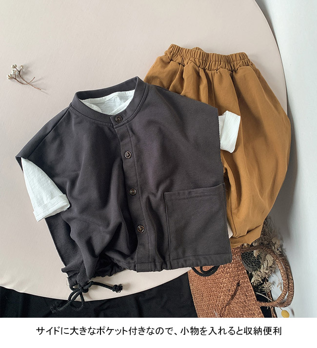 ベスト キッズ ライトアウター 無地 クルーネック 前開き ノースリーブ 紐付き トップス カジュアル 前ボタン ポケット付き ゆったり 動きやすい シンプル 春秋 子供服 男児 女児 ジュニア ユニセックス コットン 普段着 アウトドア