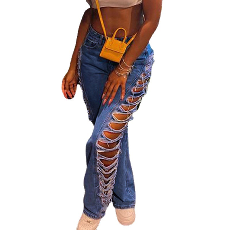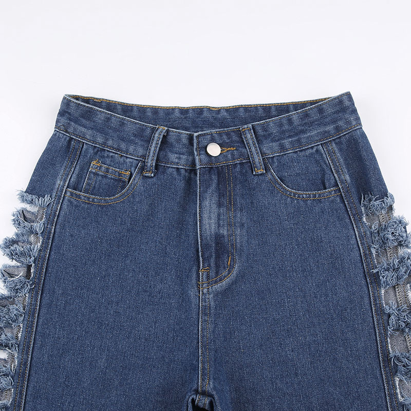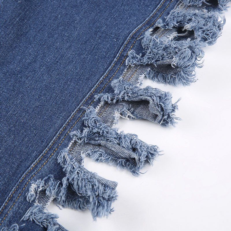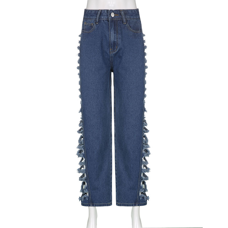 サイドスリット ダメージ フリンジ デニム パンツ ジーンズ 原宿系 Y2K K-POP スリム 韓国 ストリート レディース 衣装 ダンス HIPHOP セクシー
