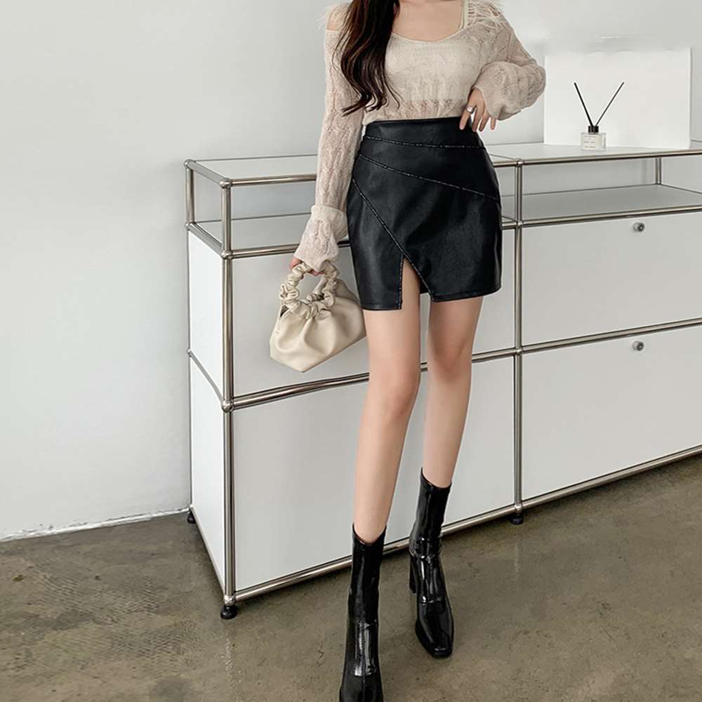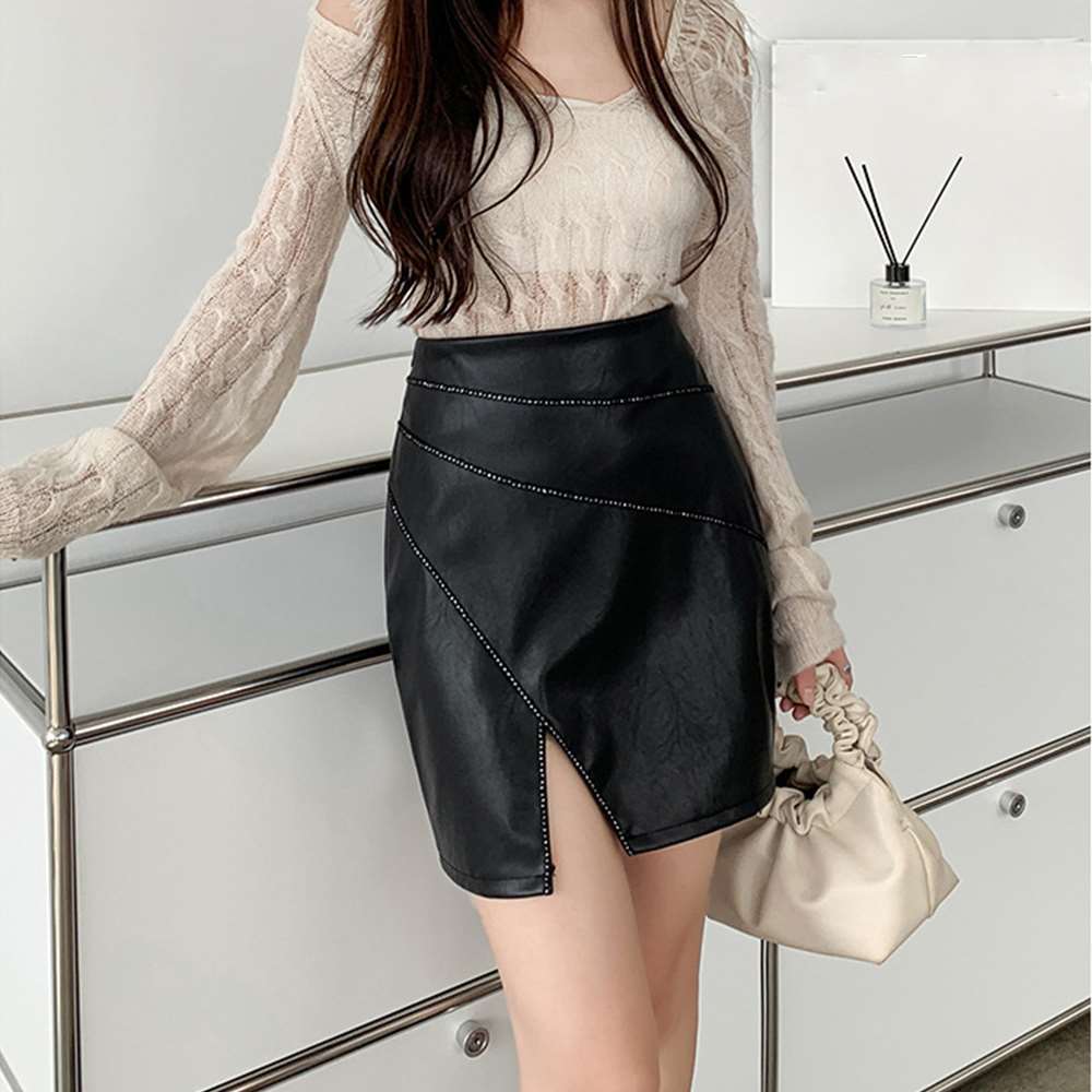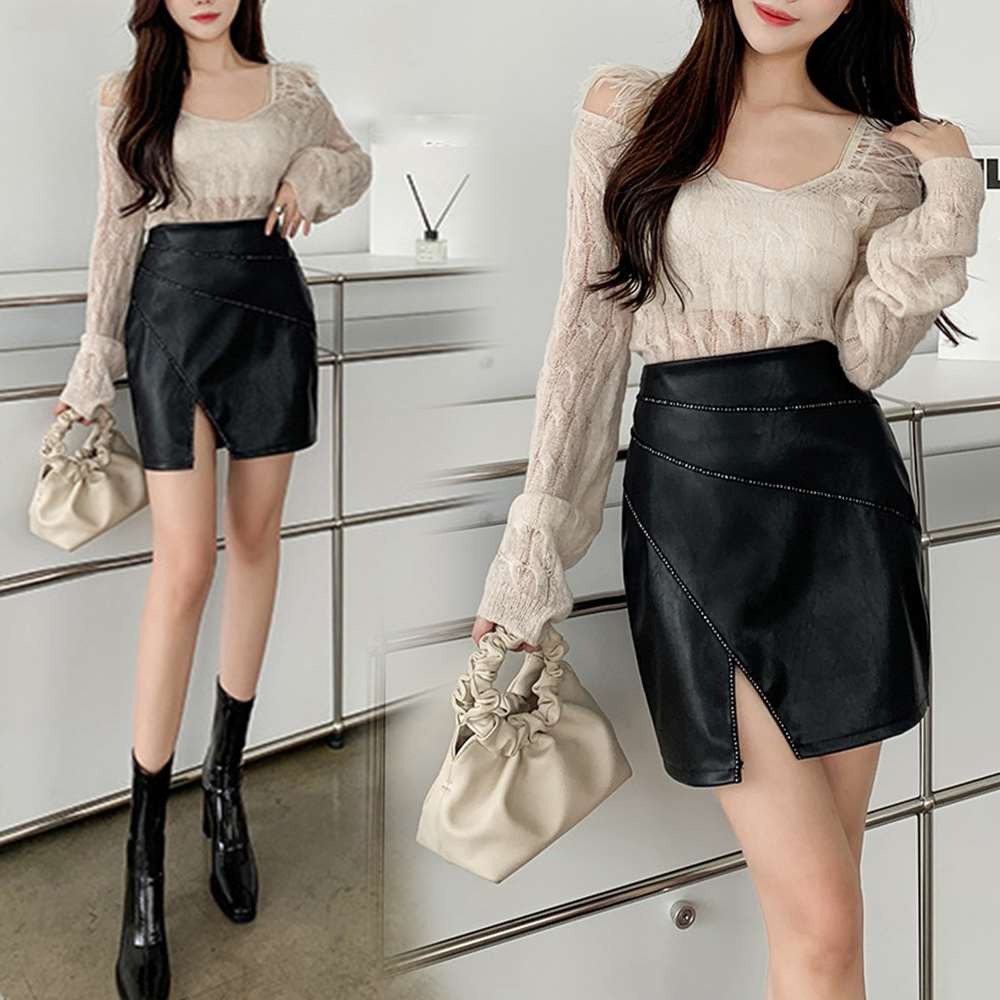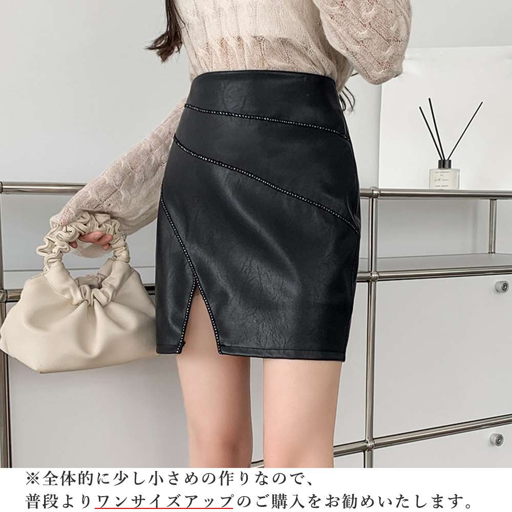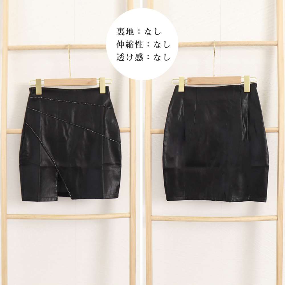 タイトなシルエットが大人な女性らしさをアピールするレザー調ミニスカート