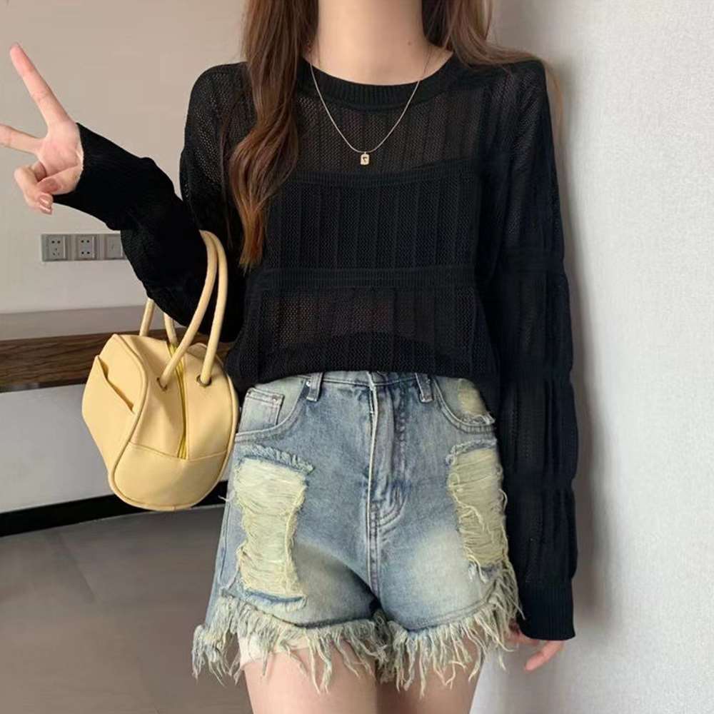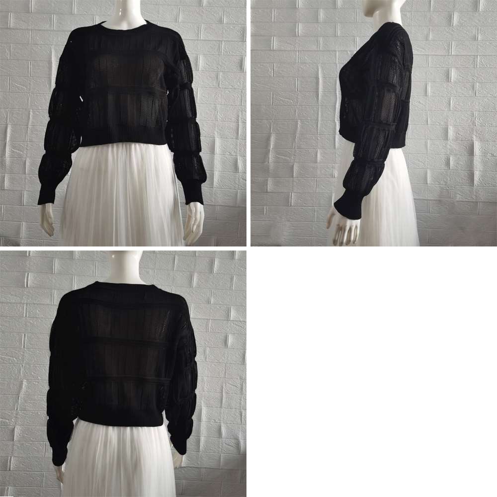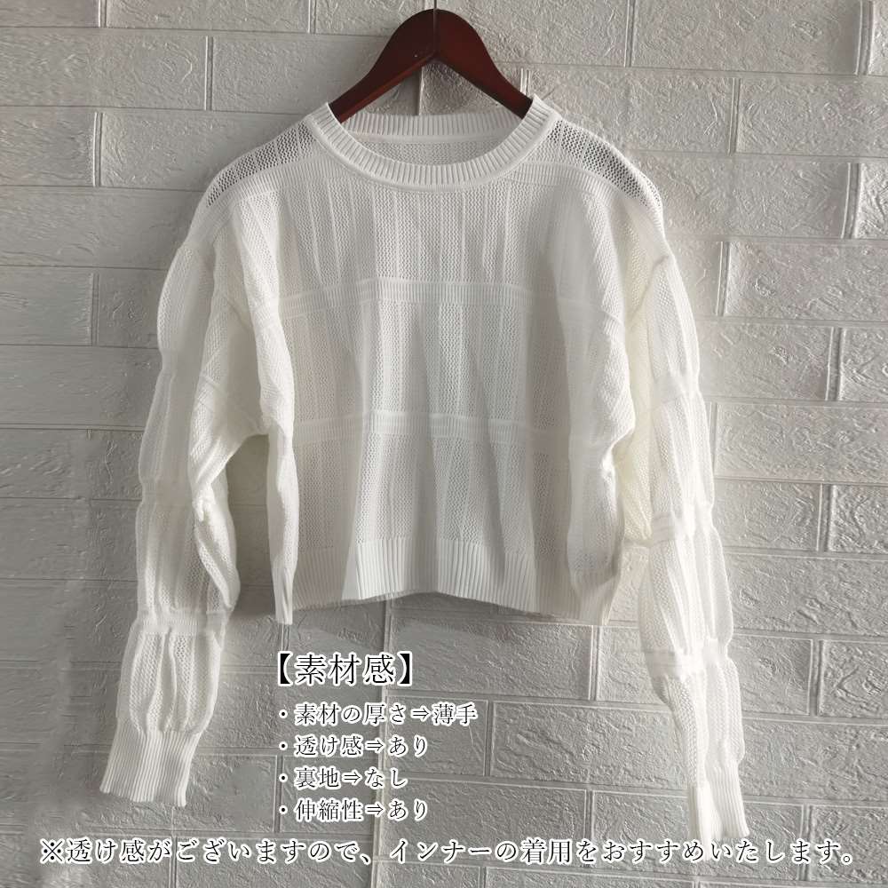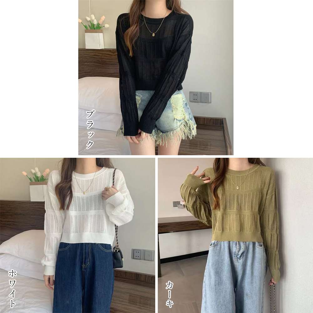 透かし編みのデザインが、レイヤードコーデにぴったりの一枚