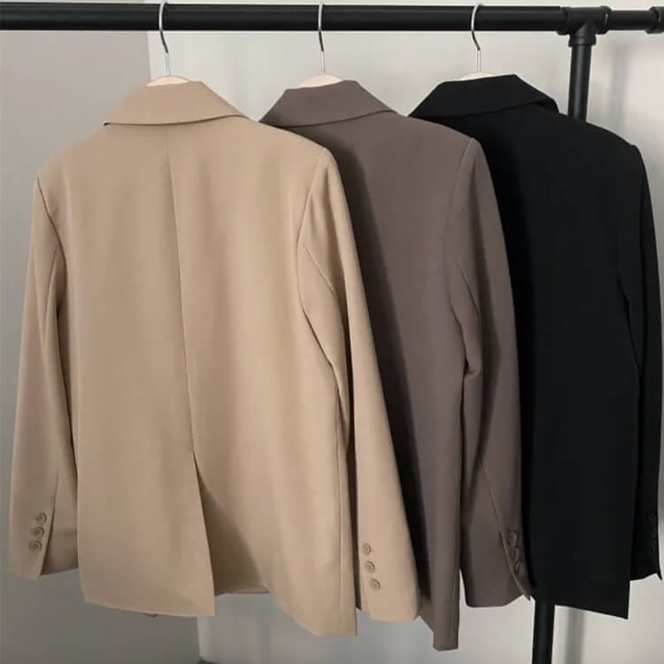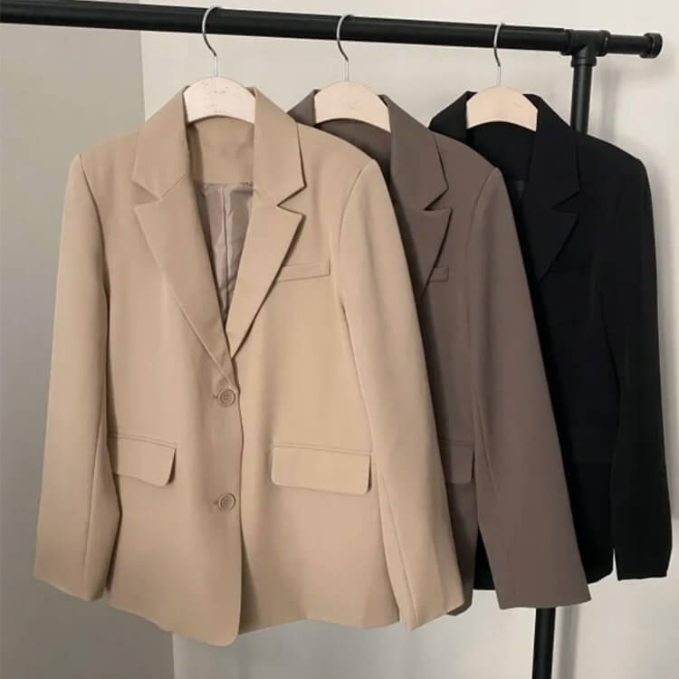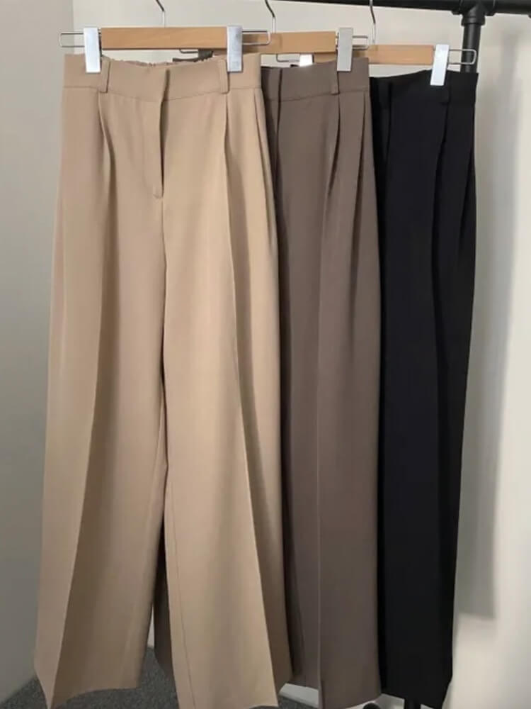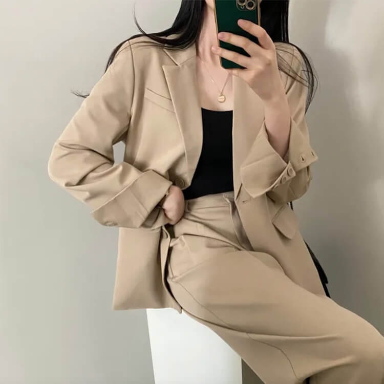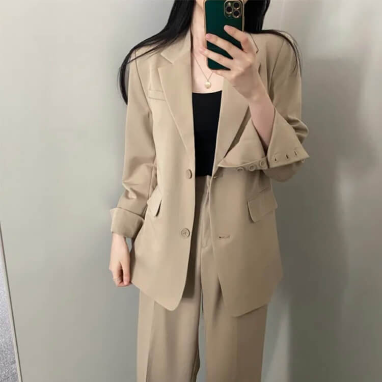 韓国デザインのカジュアルなセミロング丈ジャケットとタック入りワイドパンツのセットアップ。