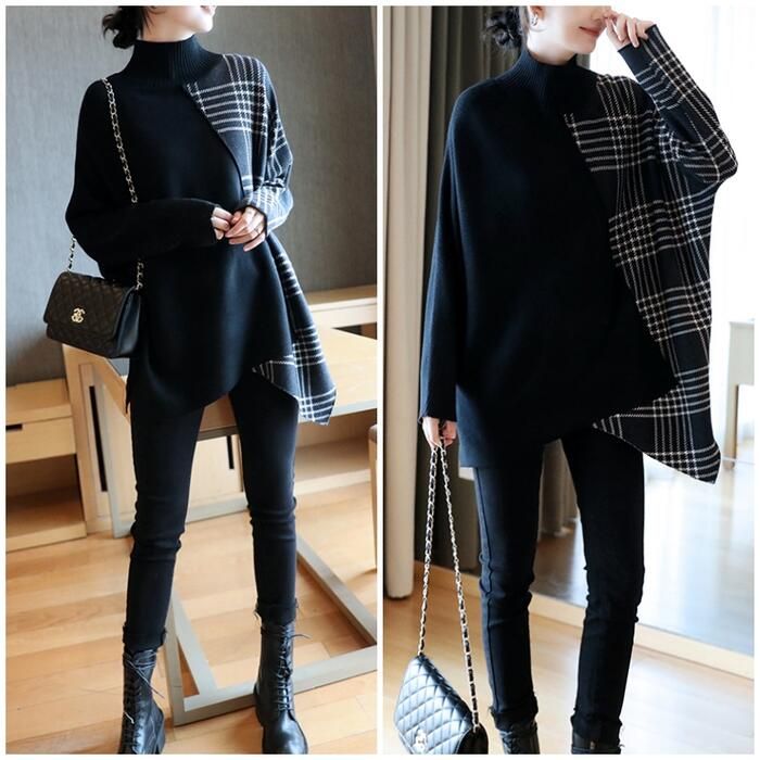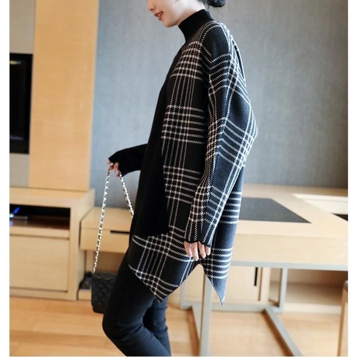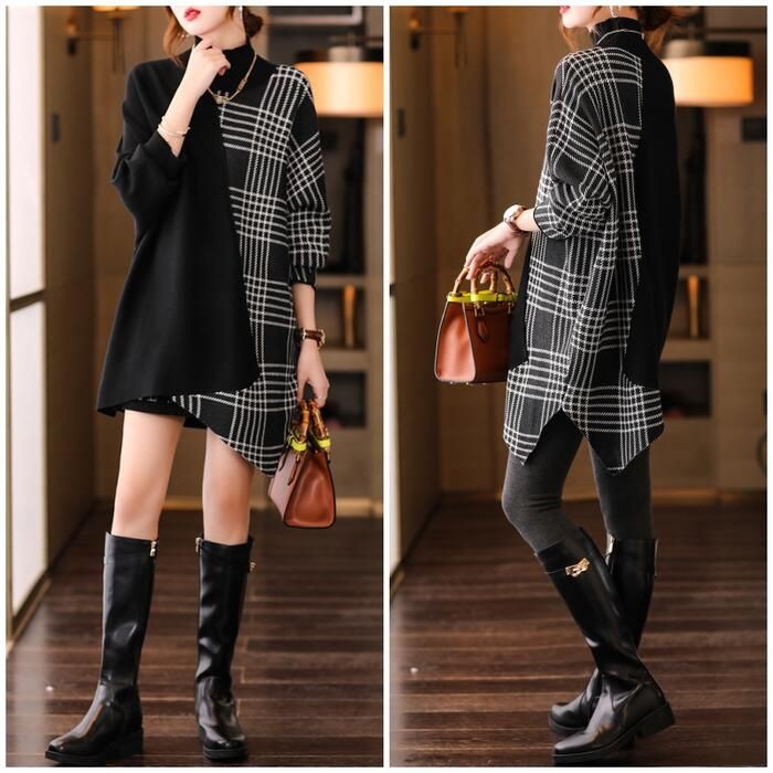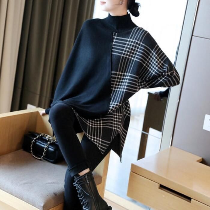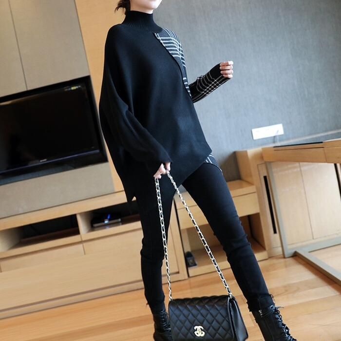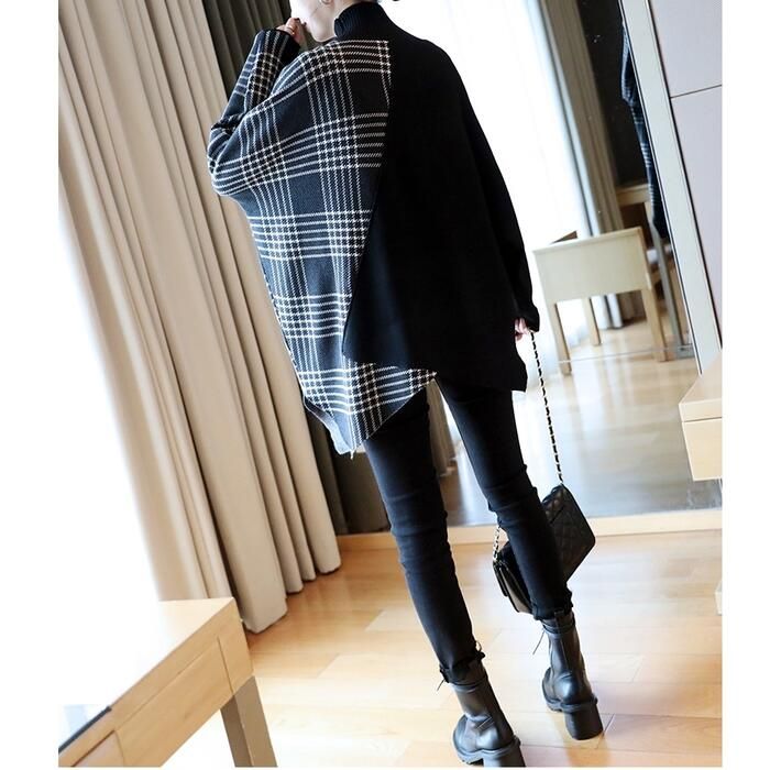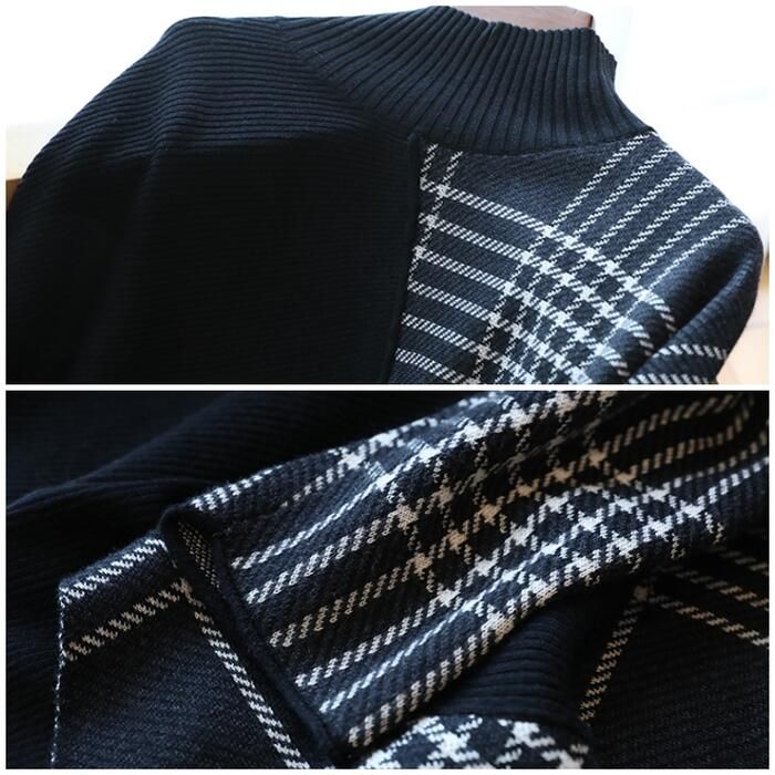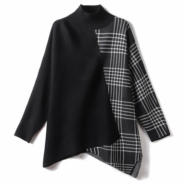 ニット トップス ハイネック セーター 切り替え アシンメトチェック おしゃれ カジュアル 長袖 ゆったり フェミニン 体型カ きれいめ レディース ロング丈