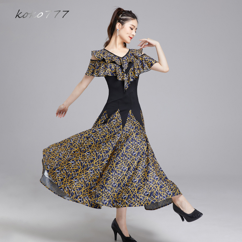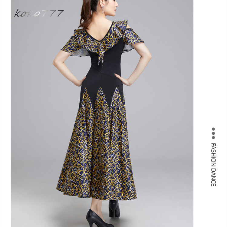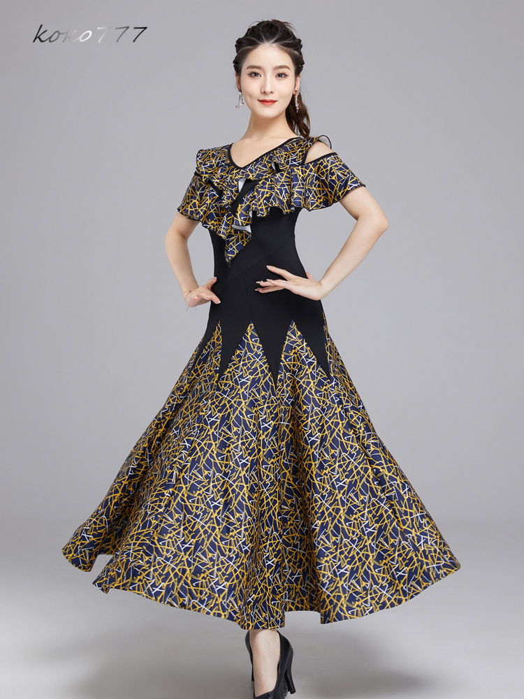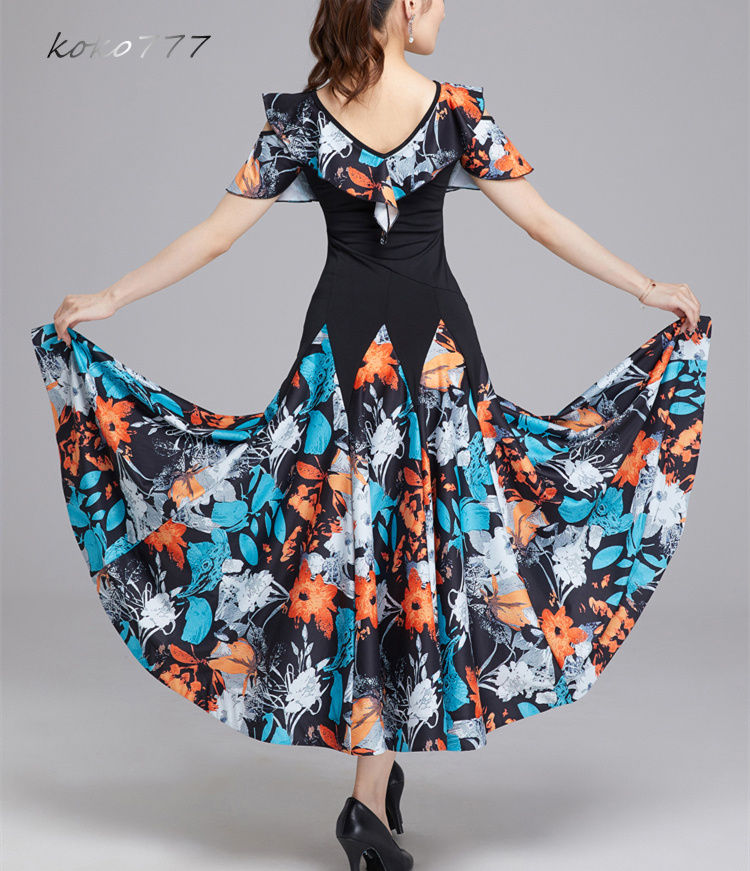 ロングドレス レディース ワンピース ラテンダンス 柄物 パーティー 洋服 コスチューム 社交ダンス 発表会 モダンダンス ナショナルダンス ワルツ 舞台衣装