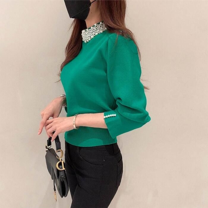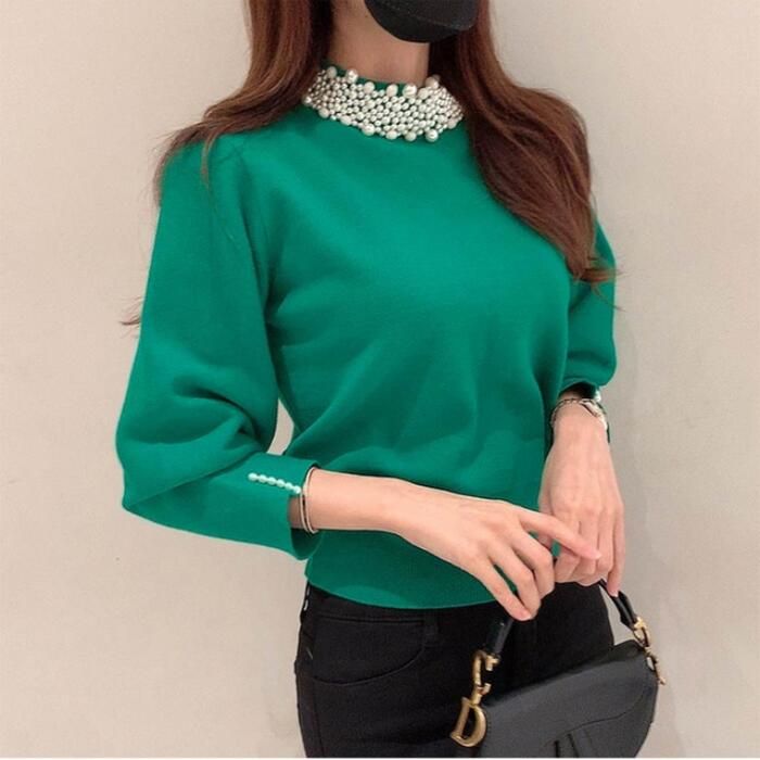 トップス ニット ビジュー セーター カットソー ハイネック お呼ばれ エレレディース 七分袖 デー きれいめ フェミニン おしゃれ 大人可愛い カジュアル