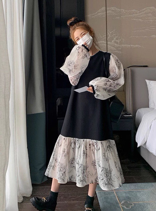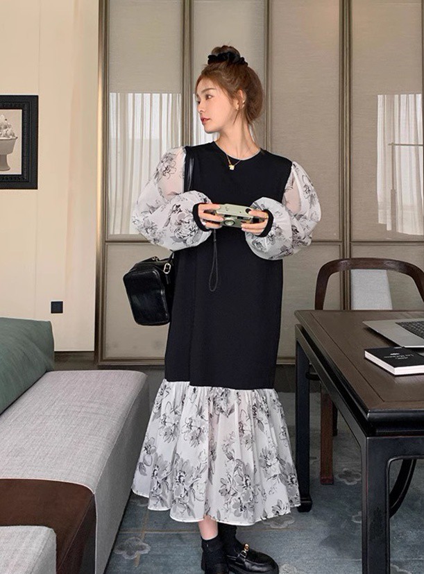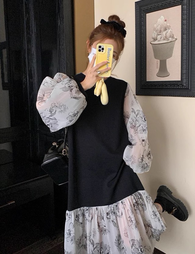 レイヤード風ワンピース レディース ワンピース 長袖 ロング 花柄 ファッション フ重ね着風ワンピース シアー袖 ベスト ニット 秋冬 韓国 大きいサイズ