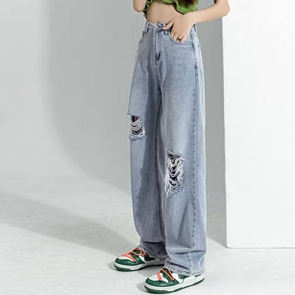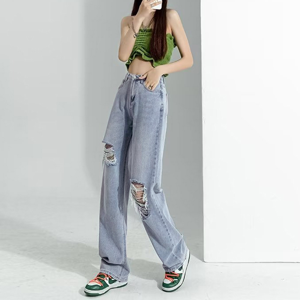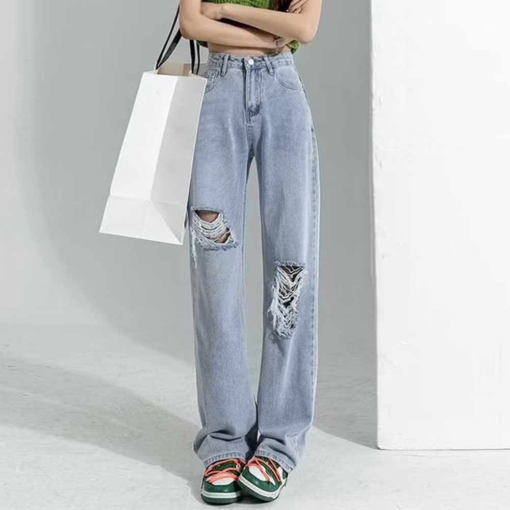 韓国ファッションのトレンドを取り入れたカットダメージデニムパンツ