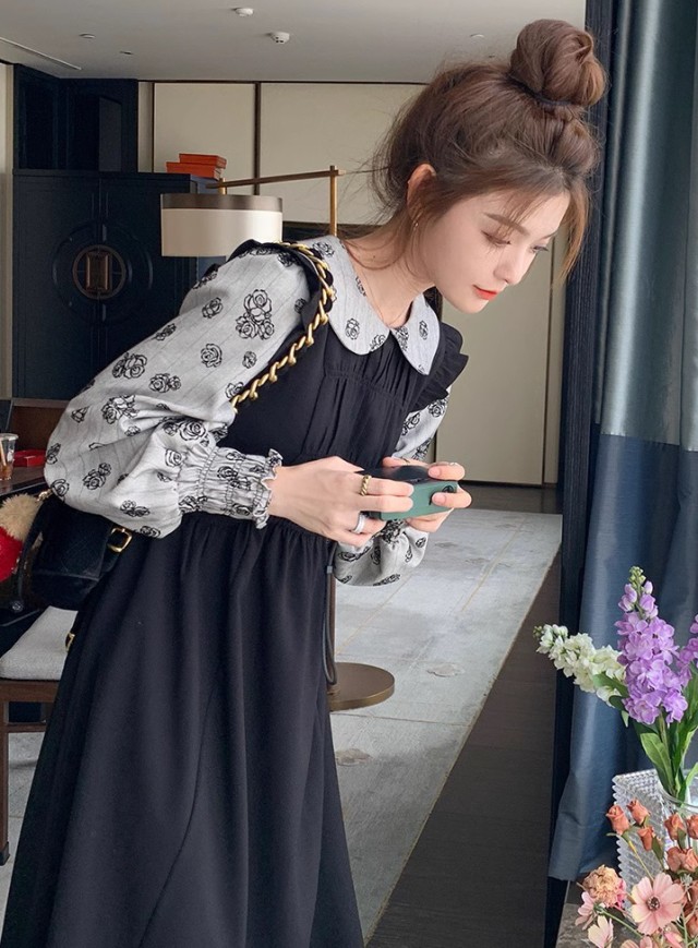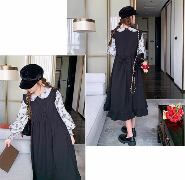 レイヤード風ワンピース レディース ワンピース 長袖 ロング ミモレ丈 花柄 フレア 重ね着風ワンピース ビッグカラー 秋冬 大きいサイズ 韓国 ファッション