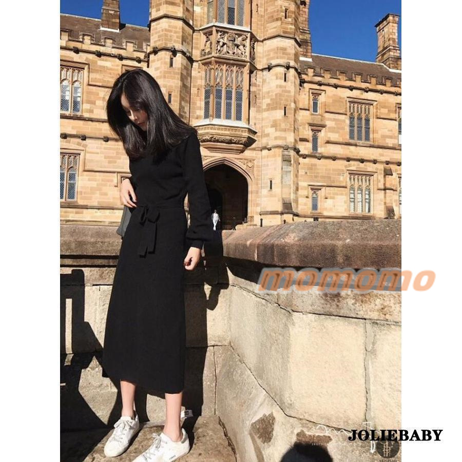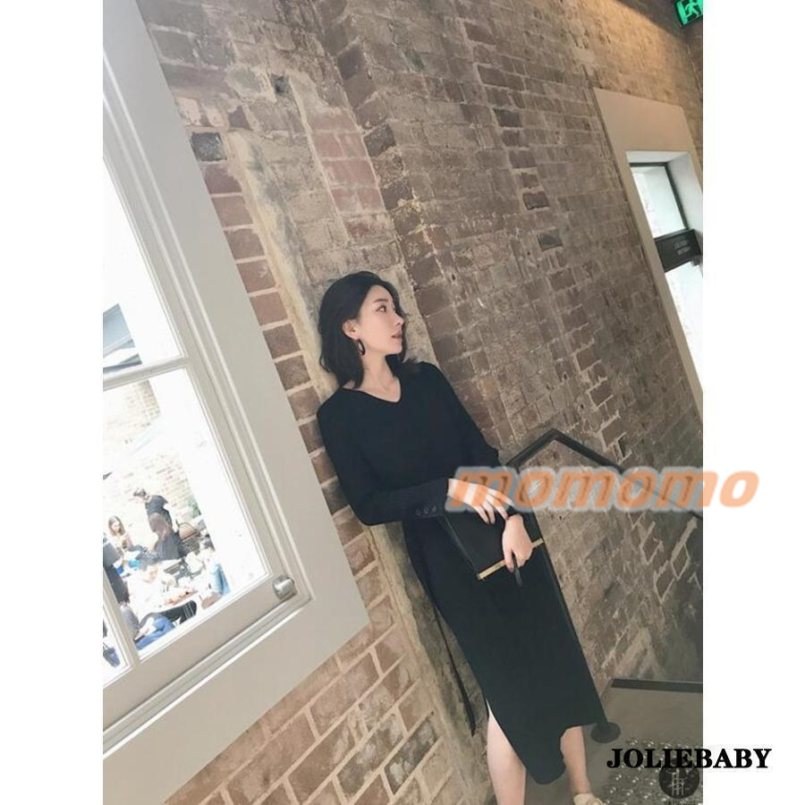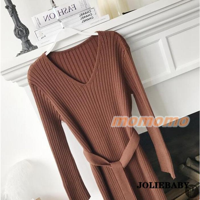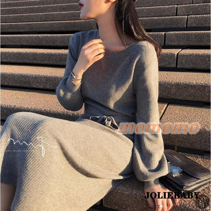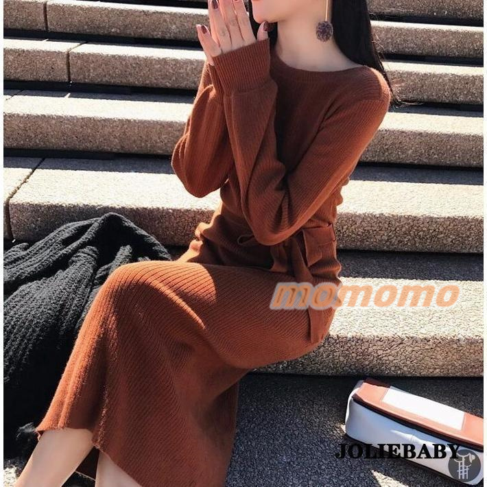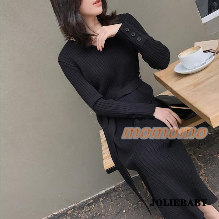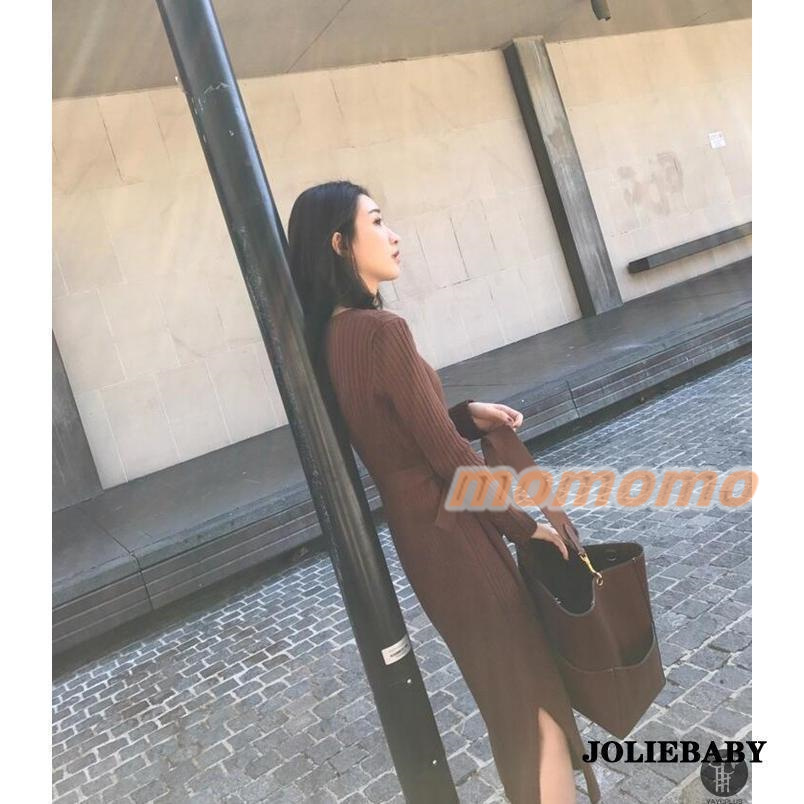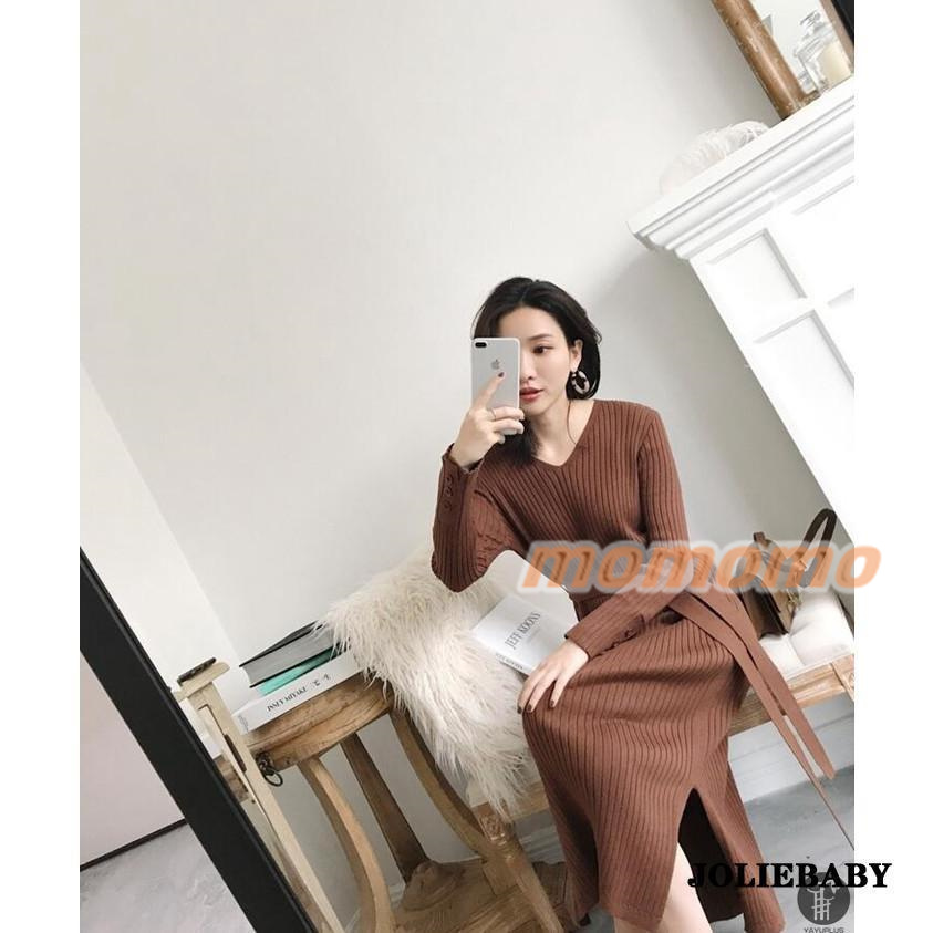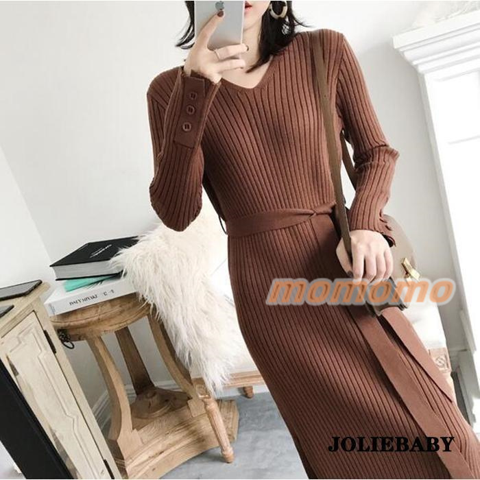ニットワンピース レディース マキシーワンピース リブ スリット 2TYPE Vネック Uネック ニットセーター ロング丈 リボン シンプル 通勤 通学 きれいめ 可愛い 長袖 無地 秋冬 ファッション