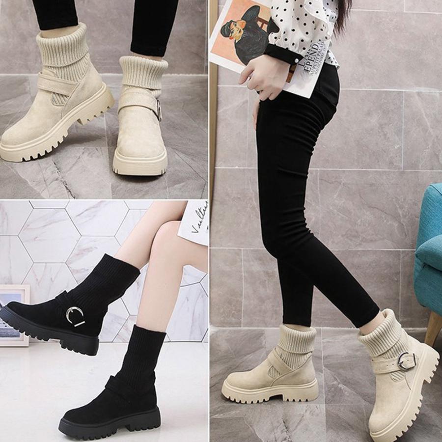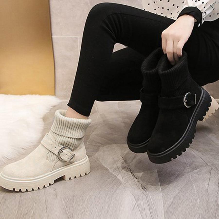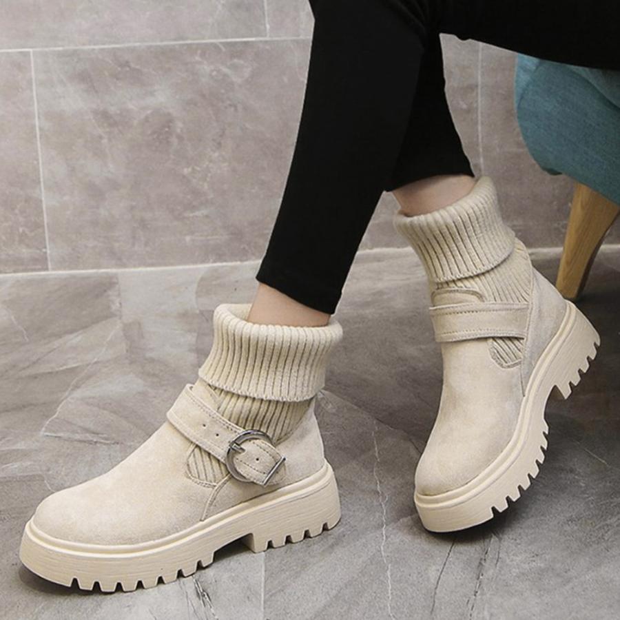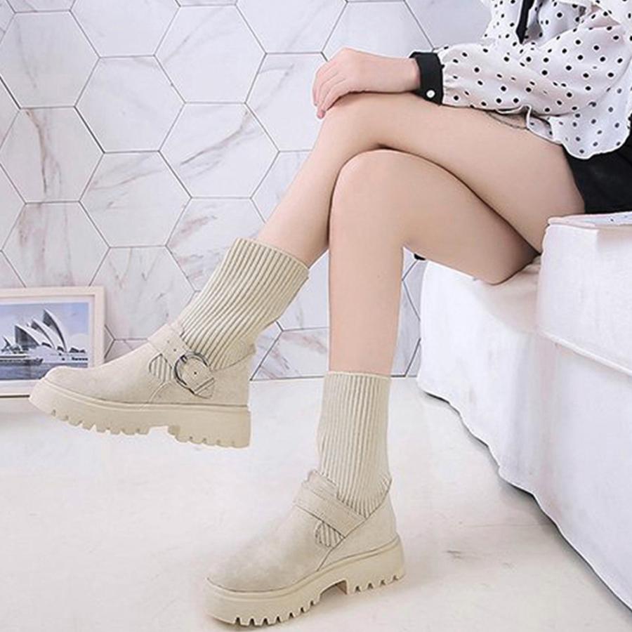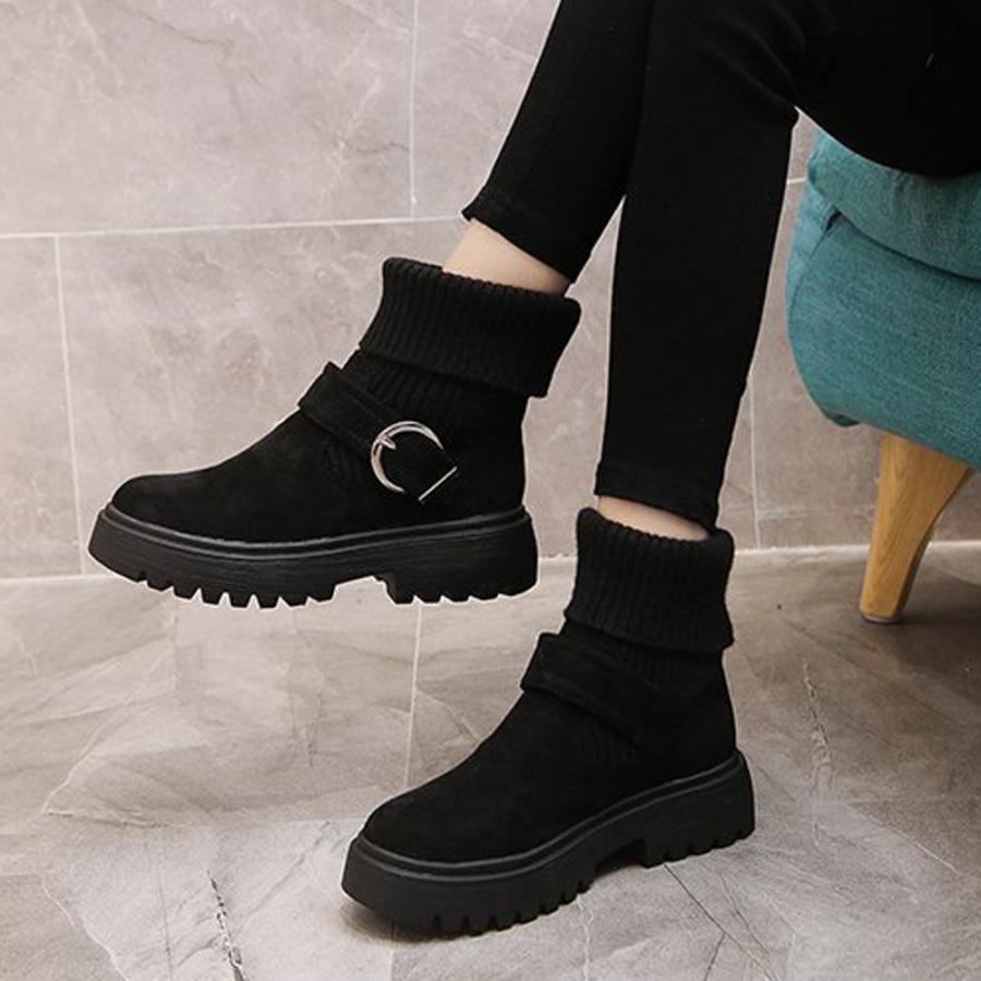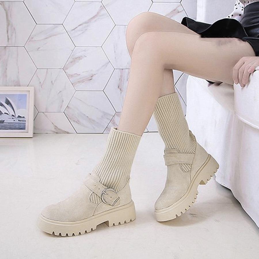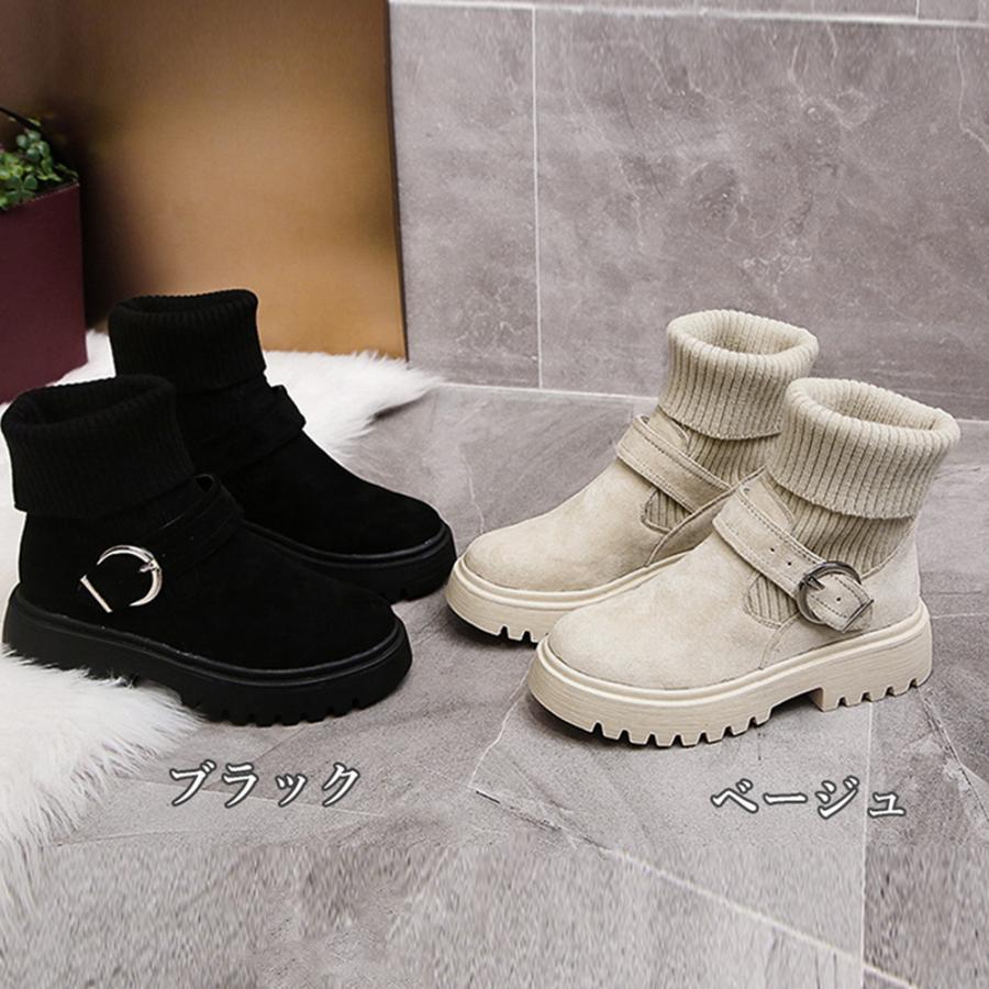 ソックス風 ショートブーツ レディース 2WAYニットブーツ バックルベルト 厚底ブーツ 歩きやすい ハイカット