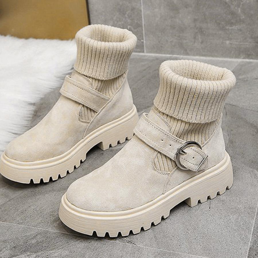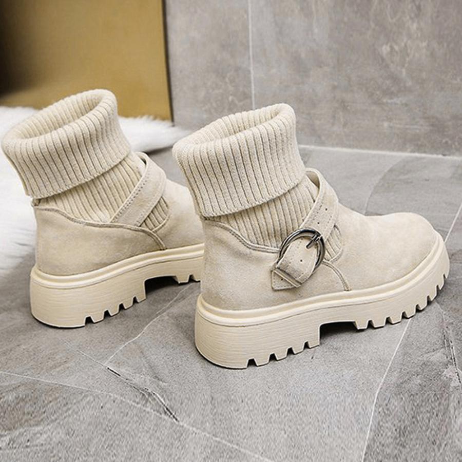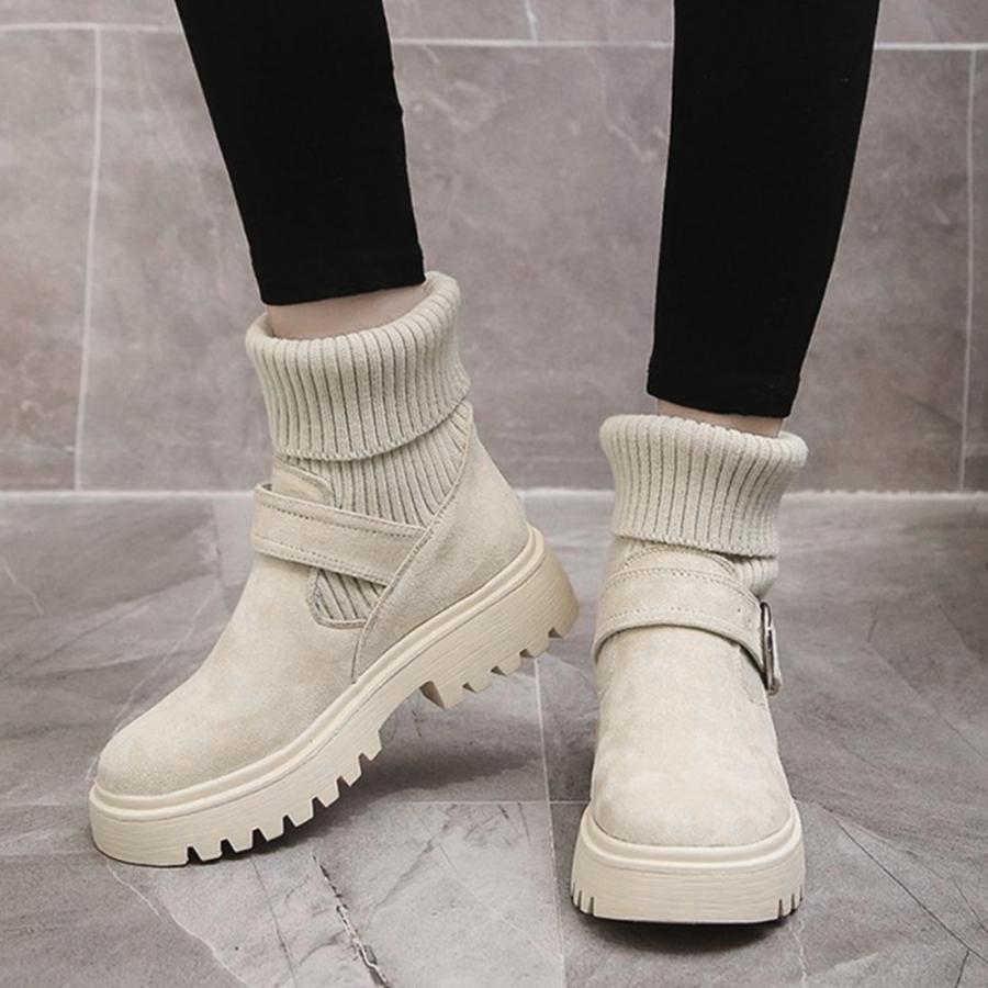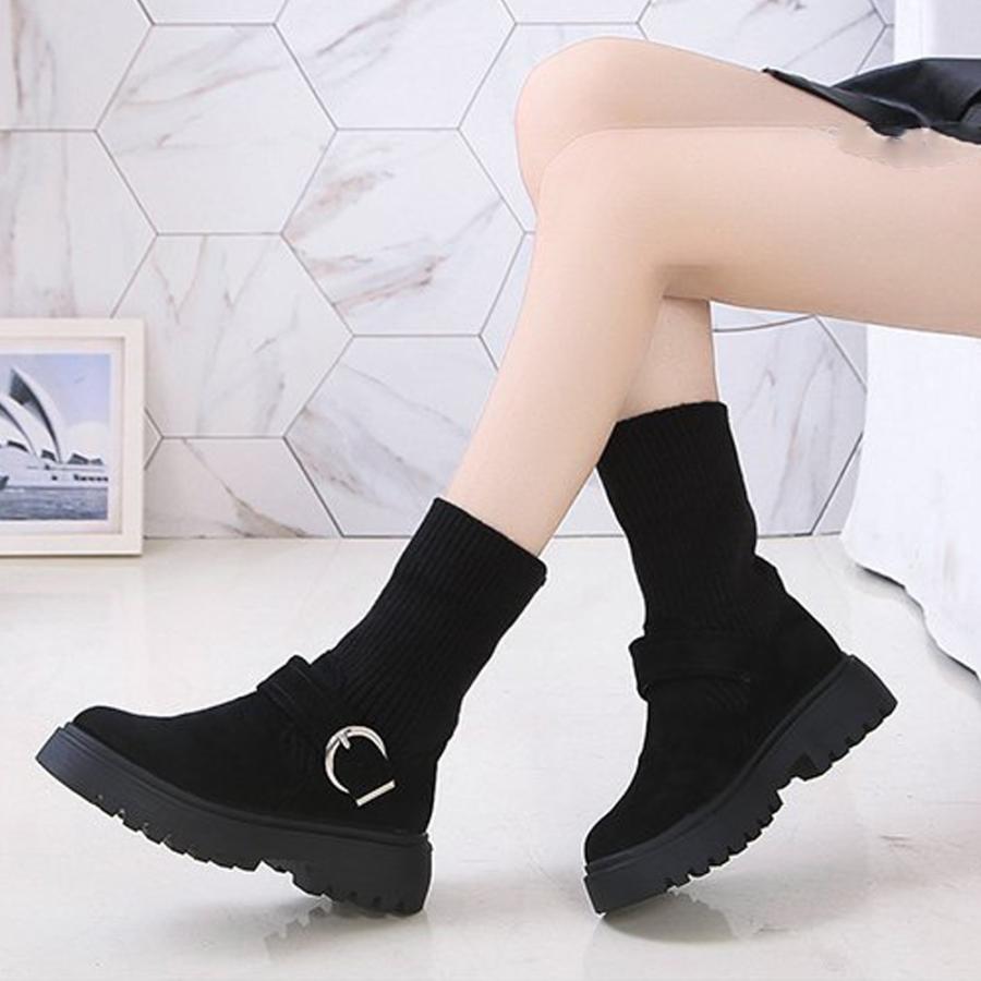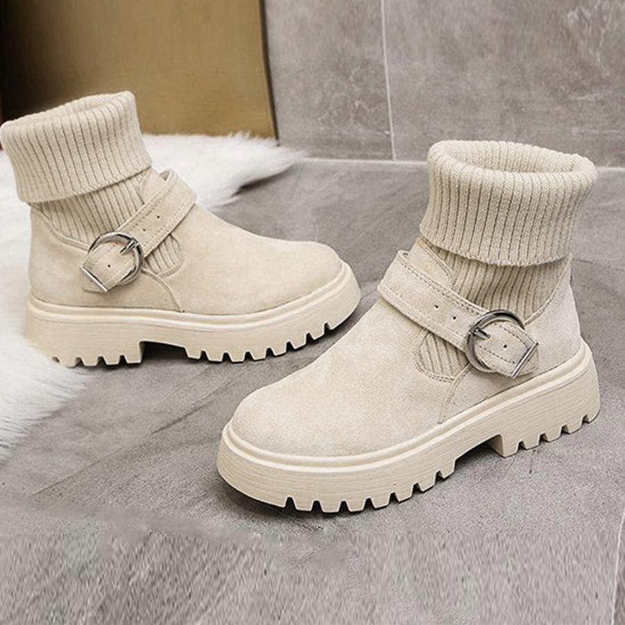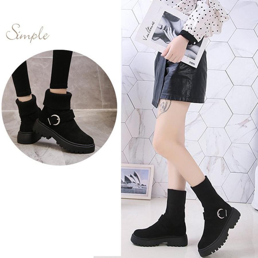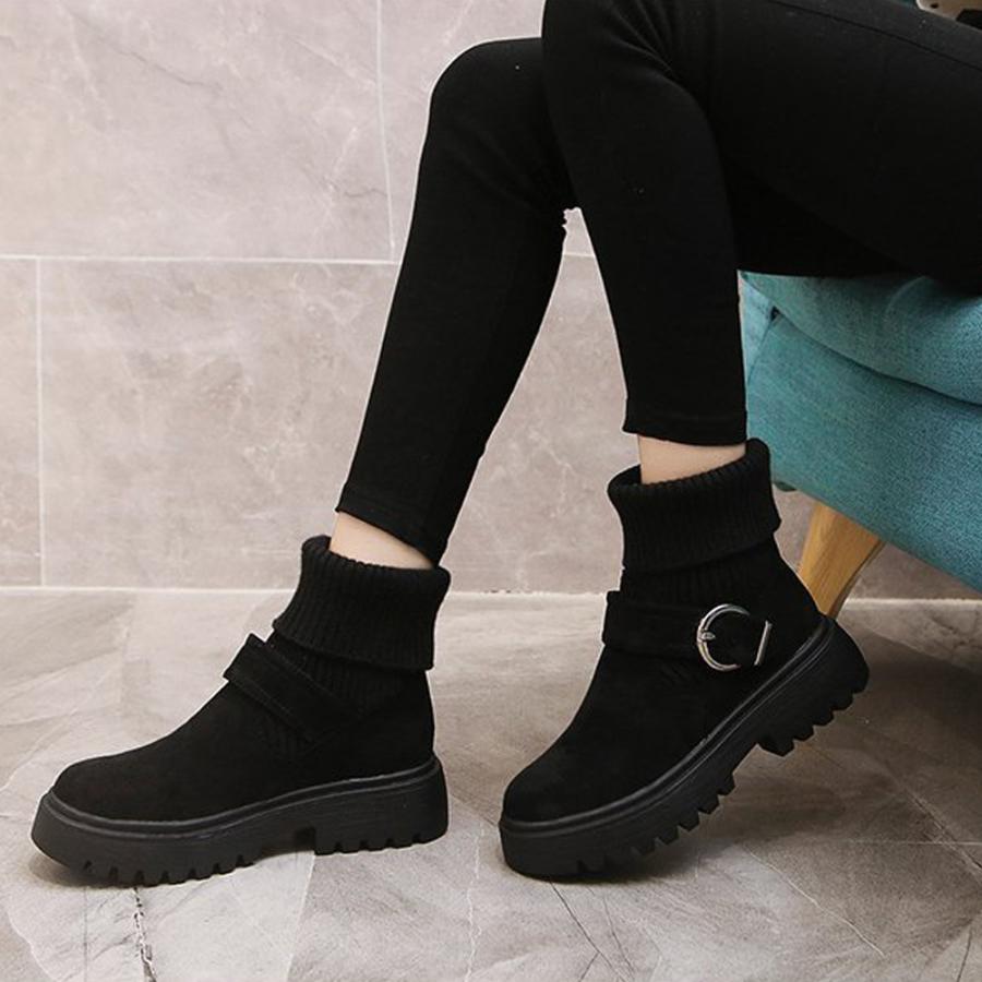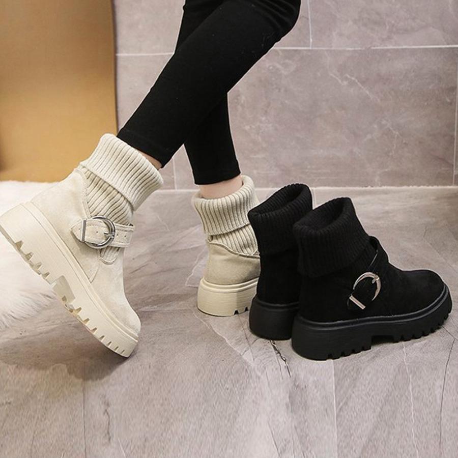 ソックス風 ショートブーツ レディース 2WAYニットブーツ バックルベルト 厚底ブーツ 歩きやすい ハイカット