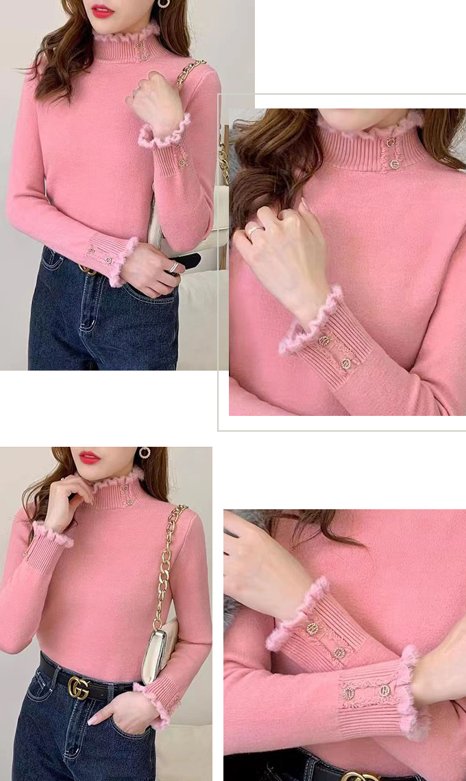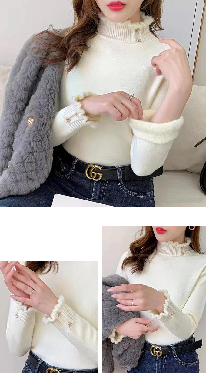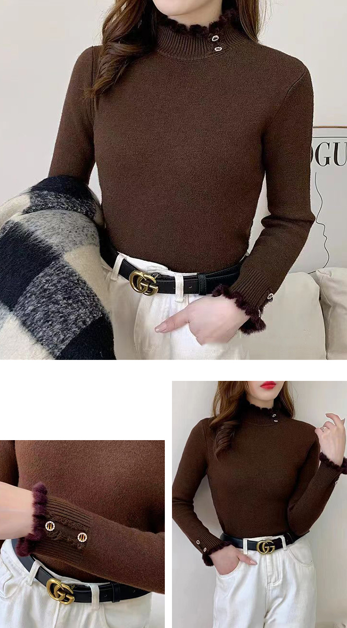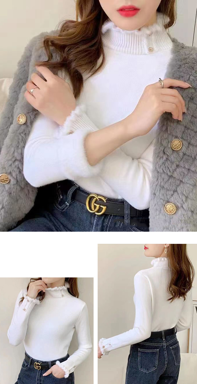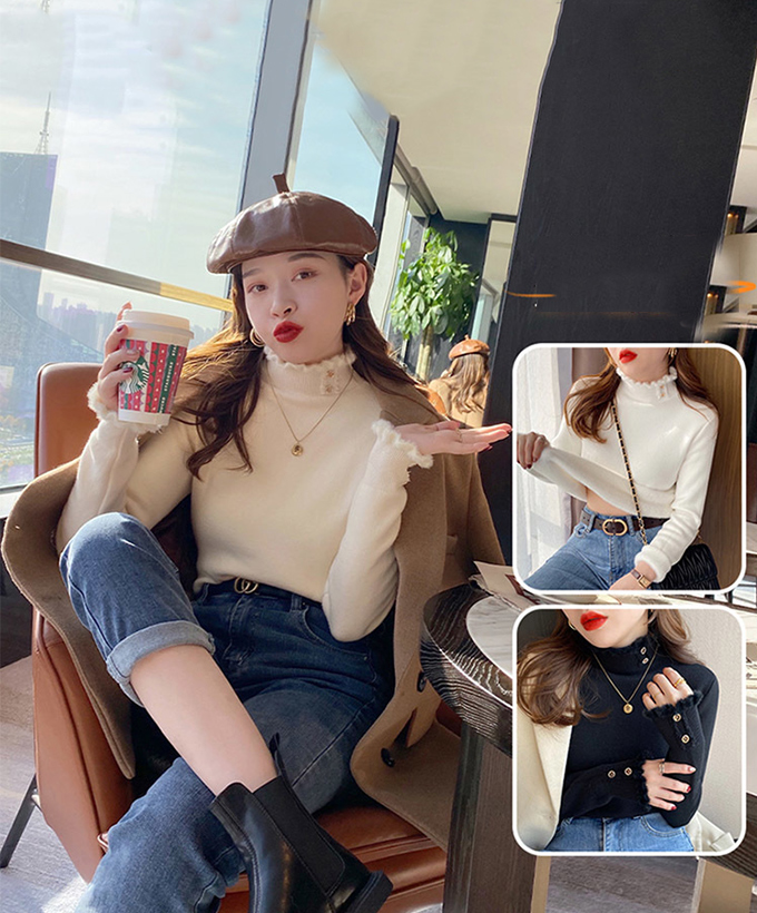 ハイネック裏起毛ニットトップス レディース 暖かい 保温 ふわふわ フェザー フリル