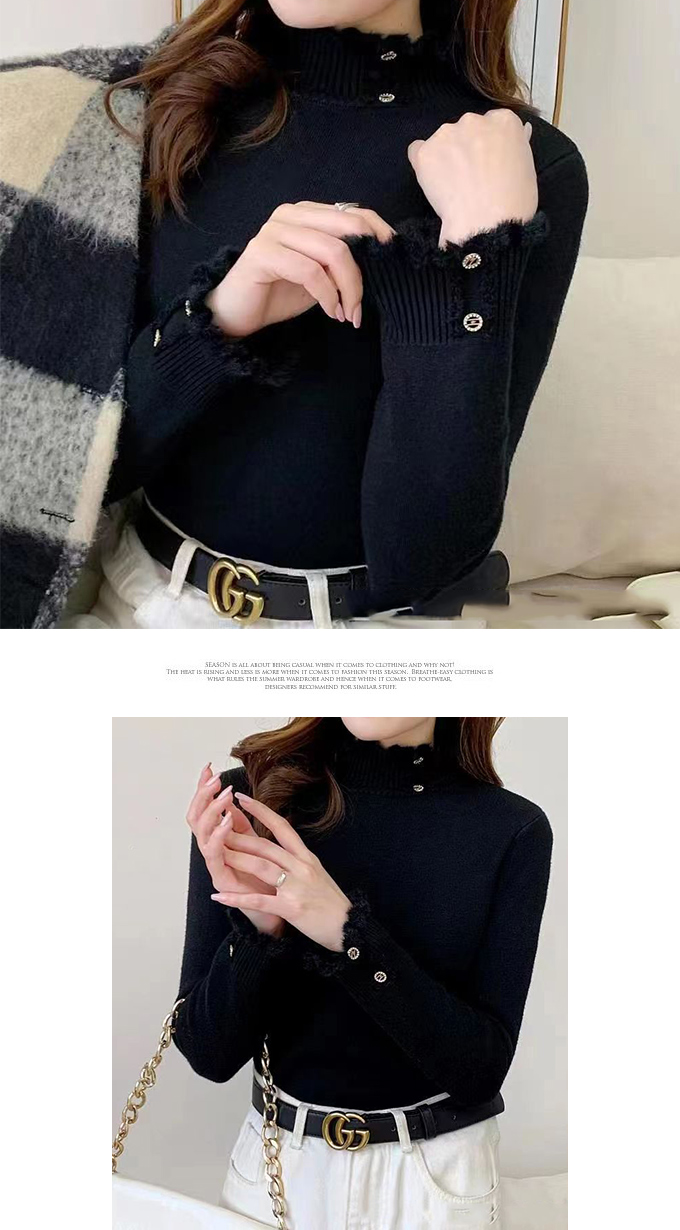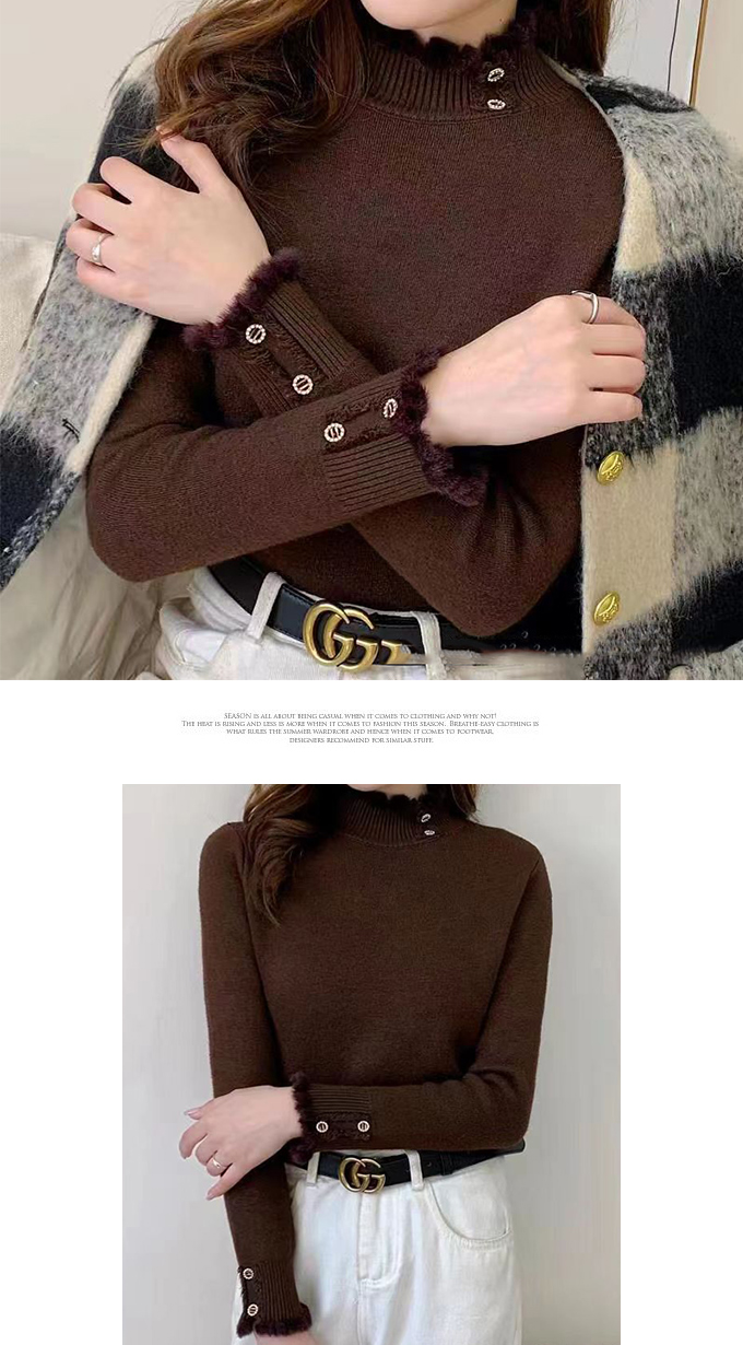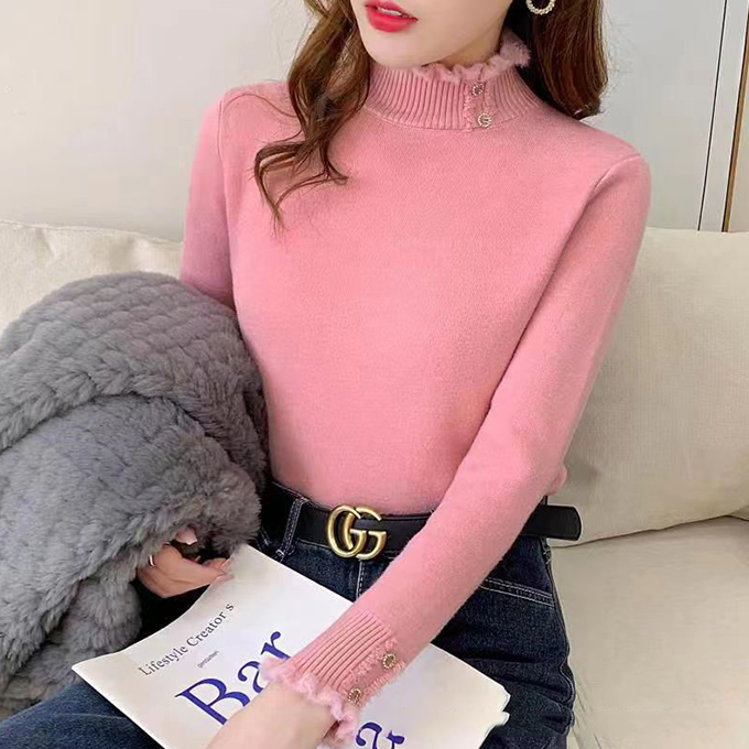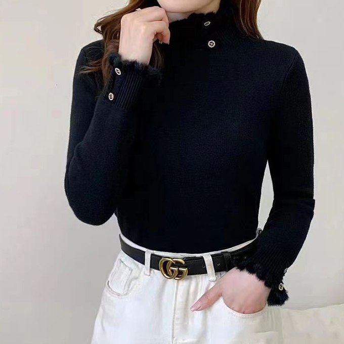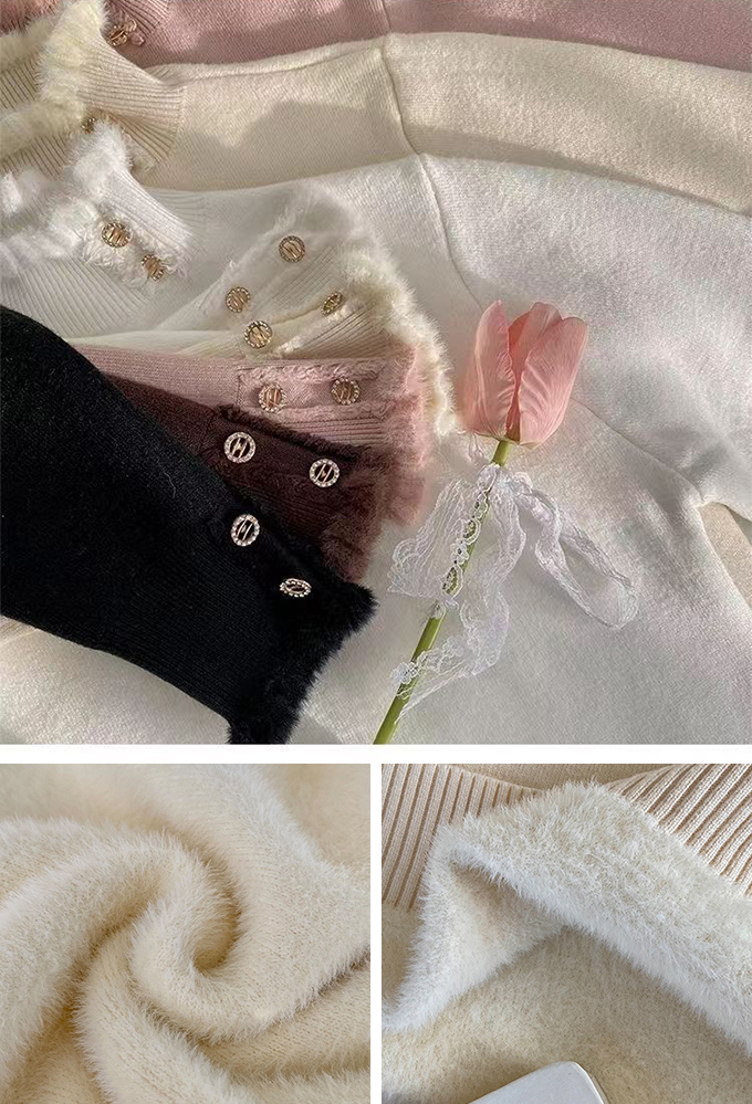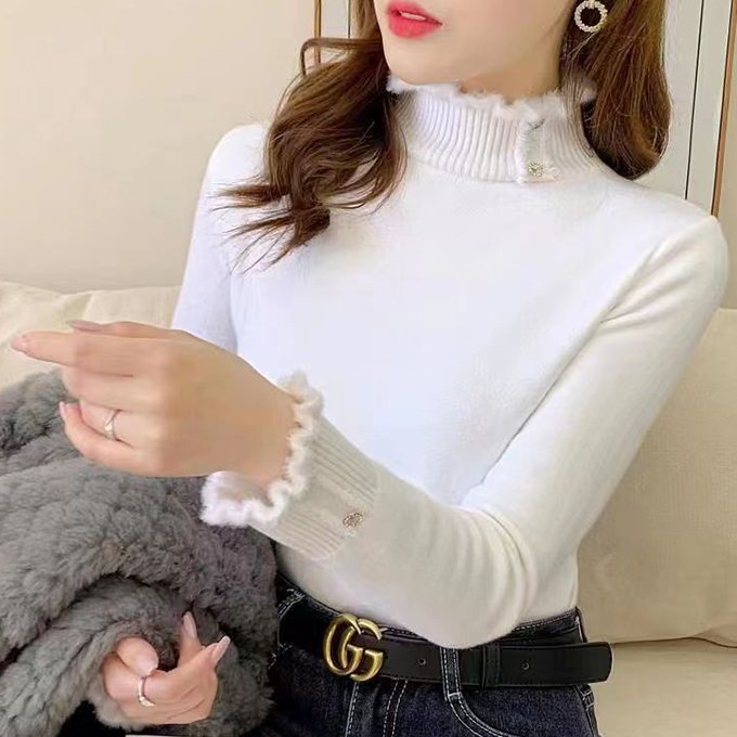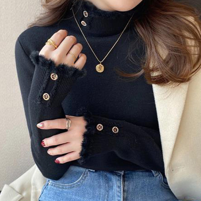ハイネック裏起毛ニットトップス レディース 暖かい 保温 ふわふわ フェザー フリル