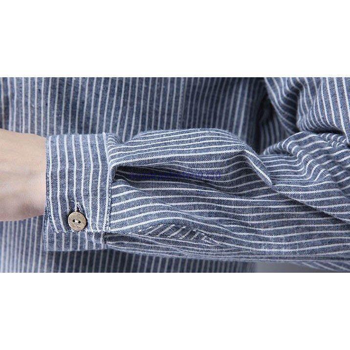 ゆったり楽ちん♪ フロントボタンストライプ柄麻綿混紡シャツワンピ