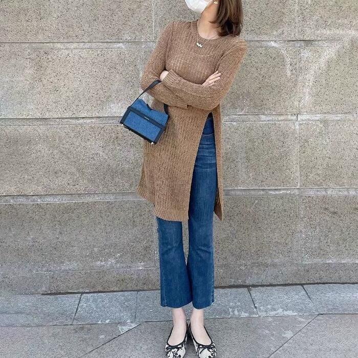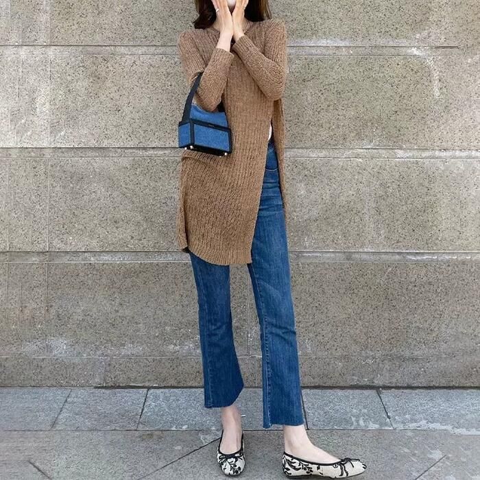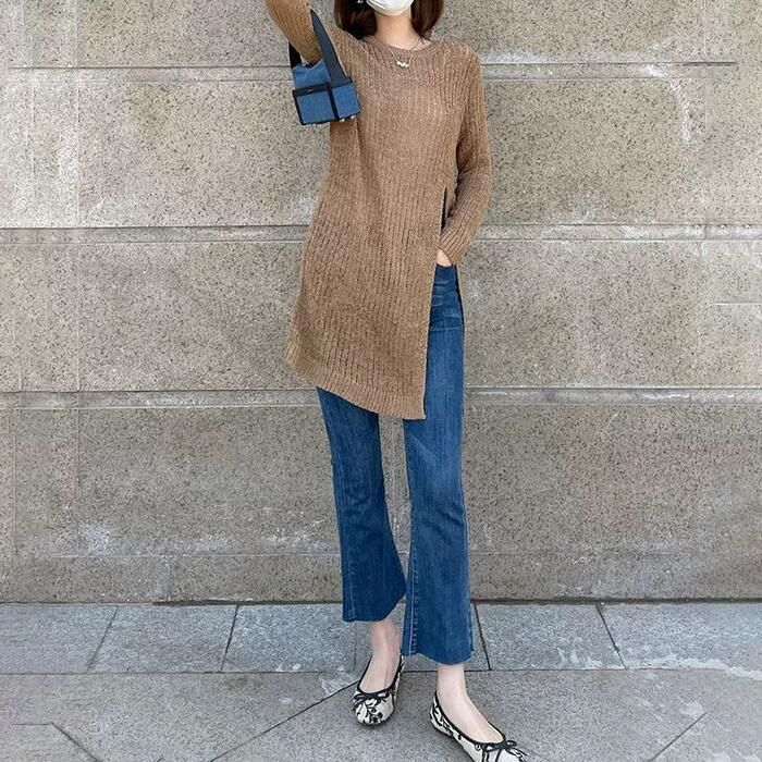 トップス ニット スリット ローゲージ カットソー レディース 長袖 韓国 可愛い 大人 チュニック エレきれいめ ロング丈 透け感 カジュアル レイヤード