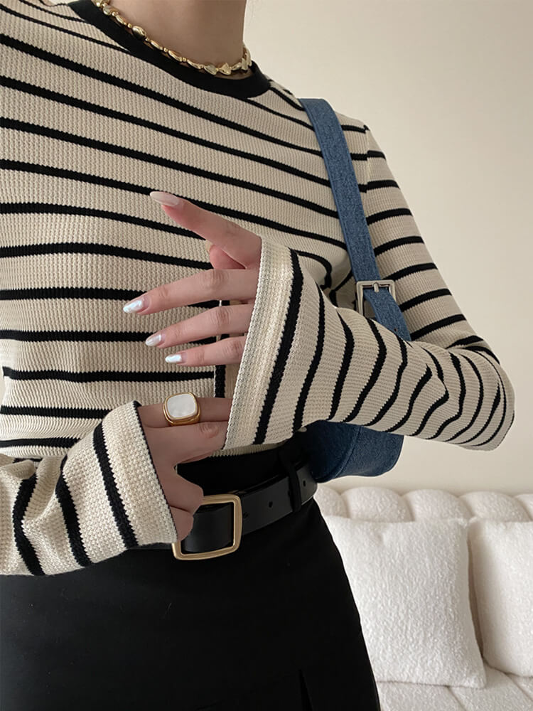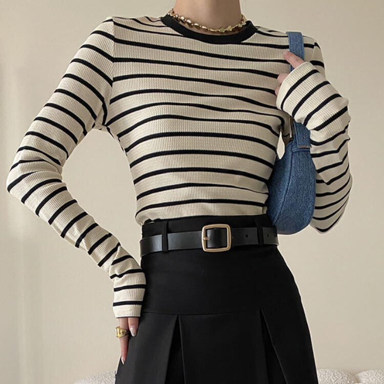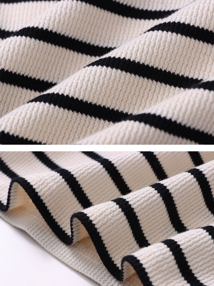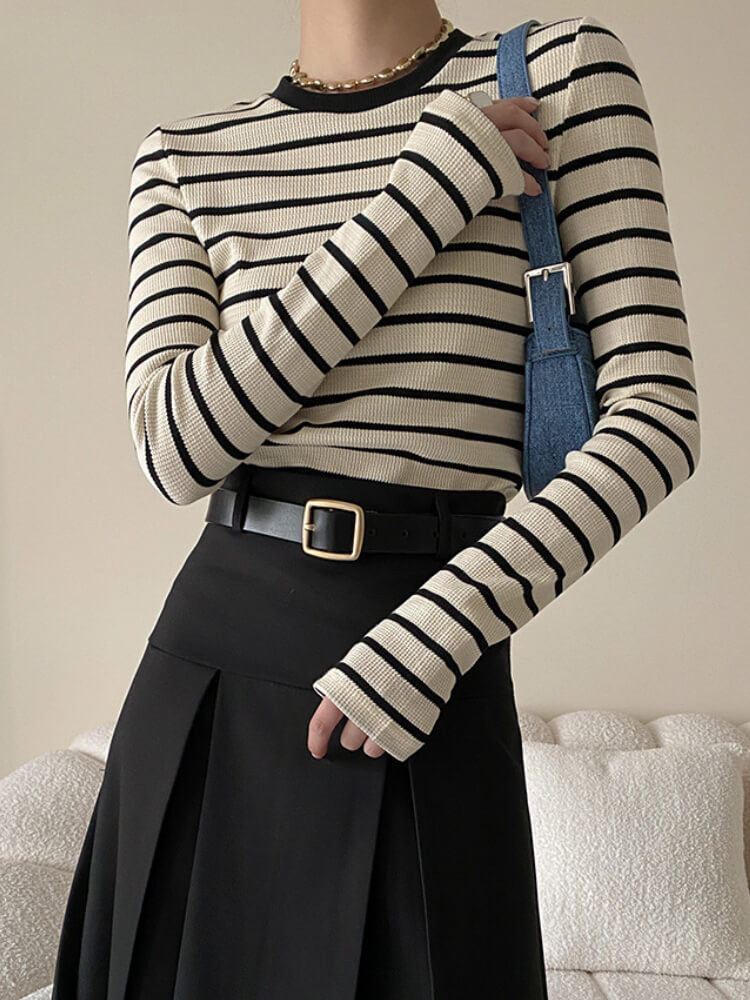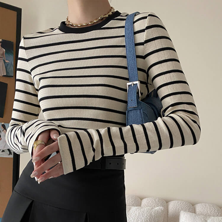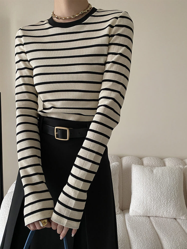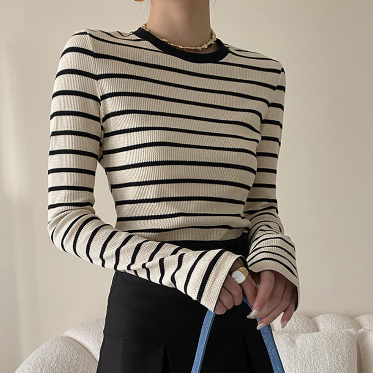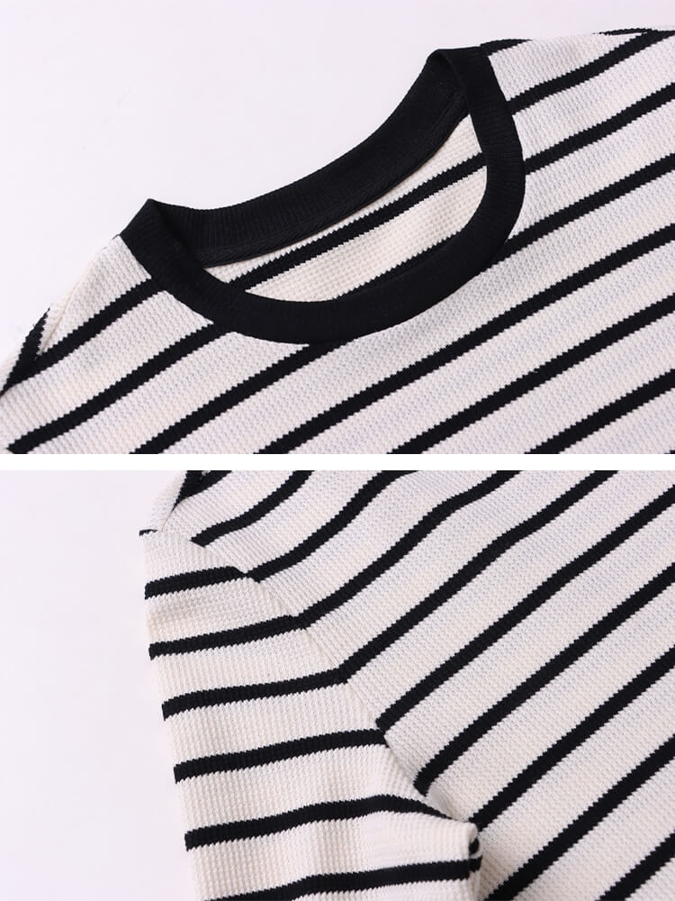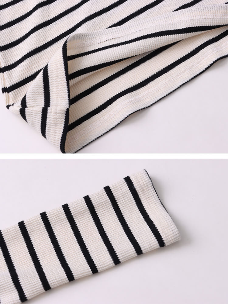 韓国デザインのボーダー柄ワッフルコットン長袖Tシャツトップス。
