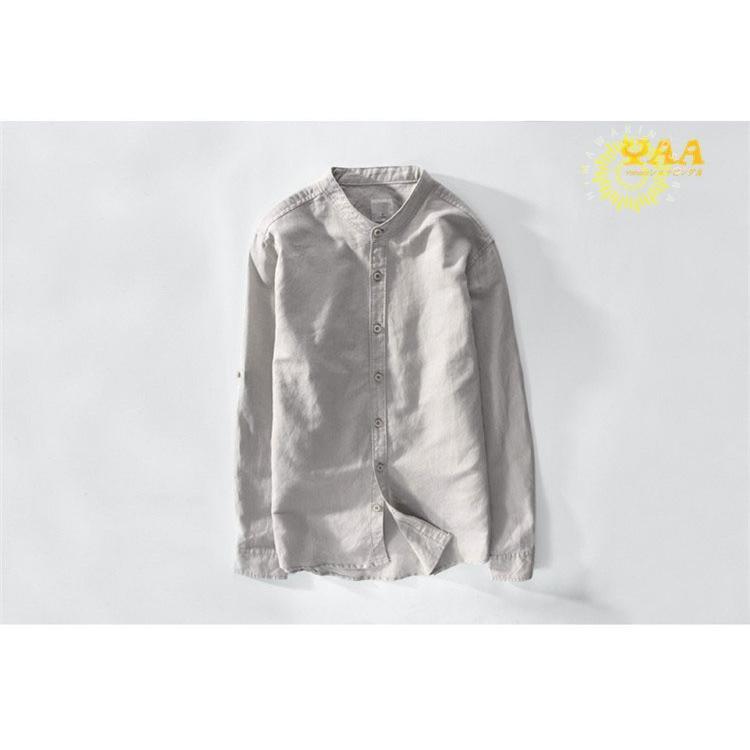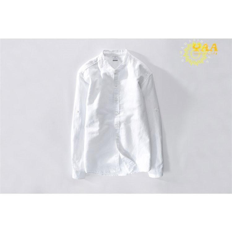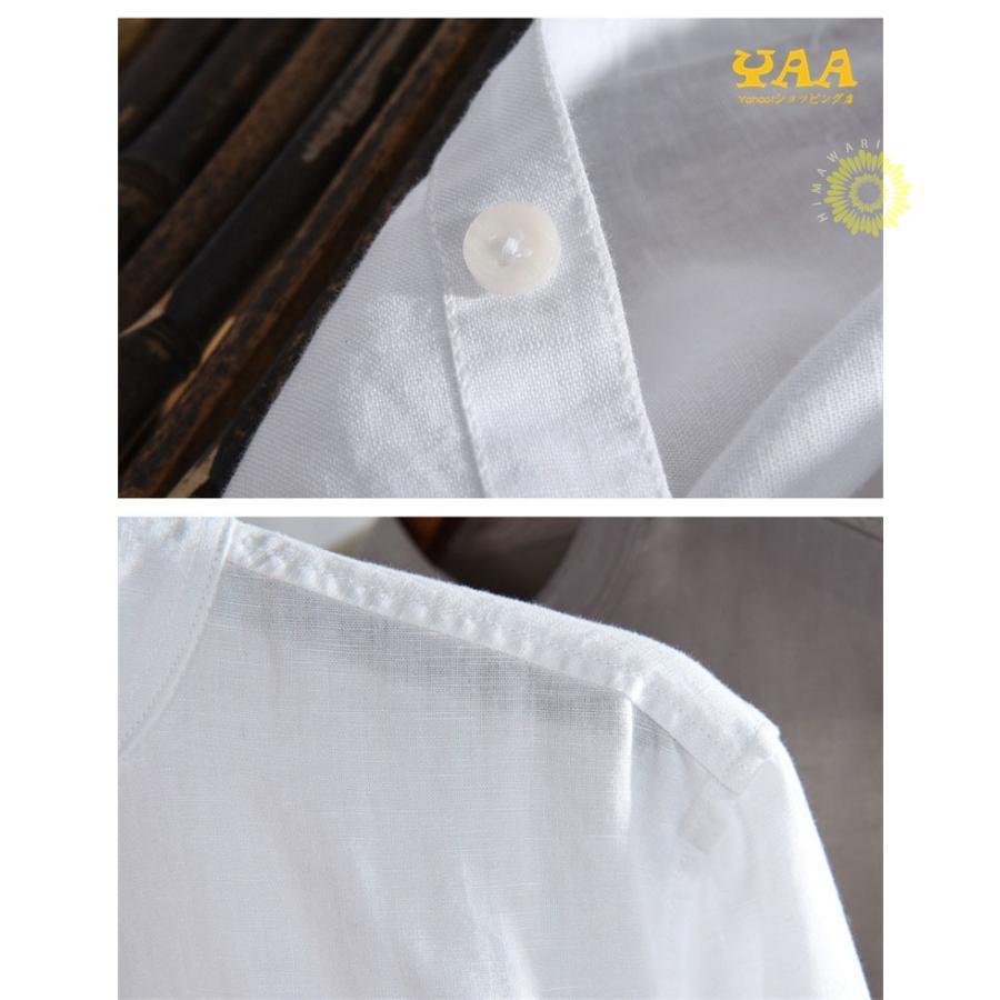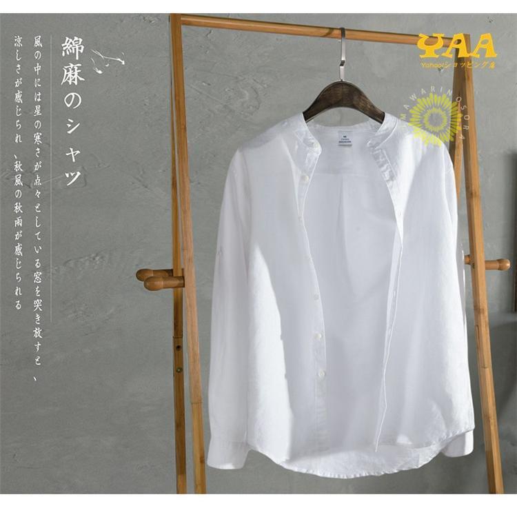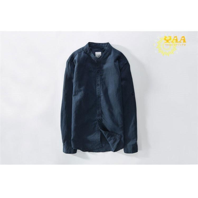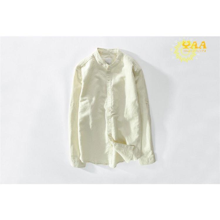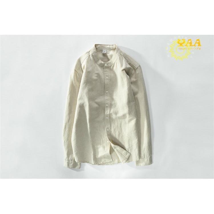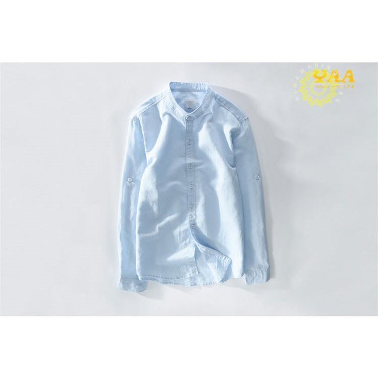 カジュアルシャツ メンズ シャツ 長袖 綿麻シャツ リネンシャツ 白シャツ ホワイトシャツ ワイシャツ バンドカラー ロールアップ 父の日
