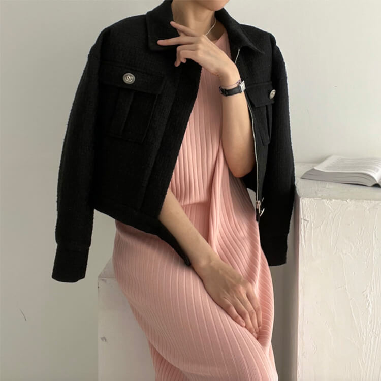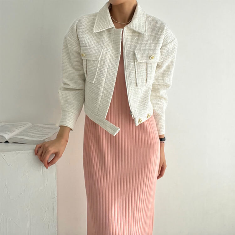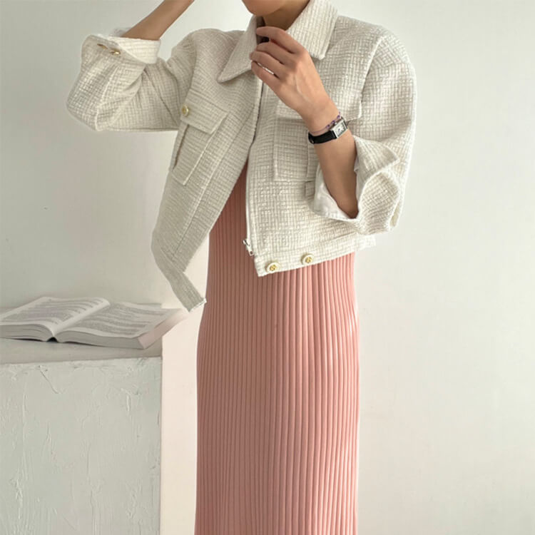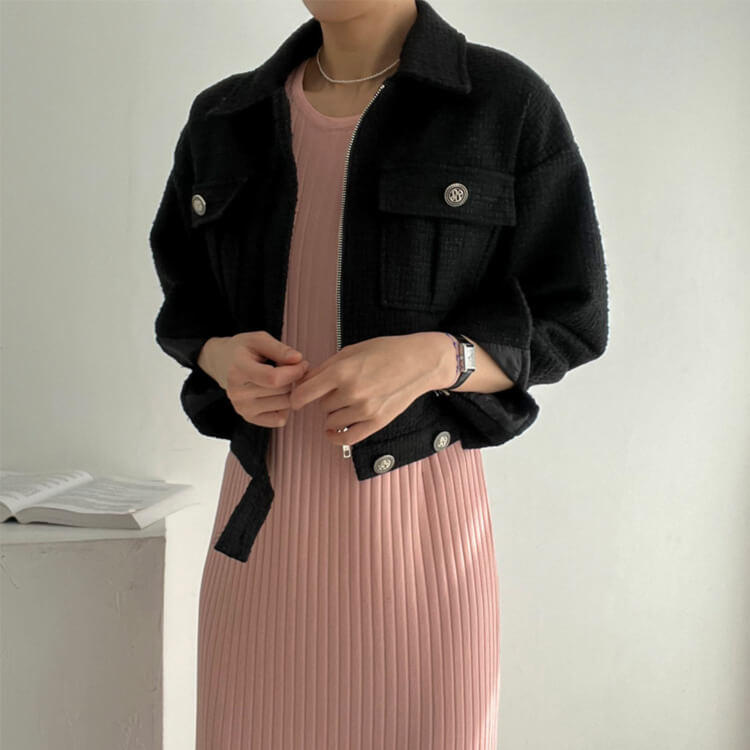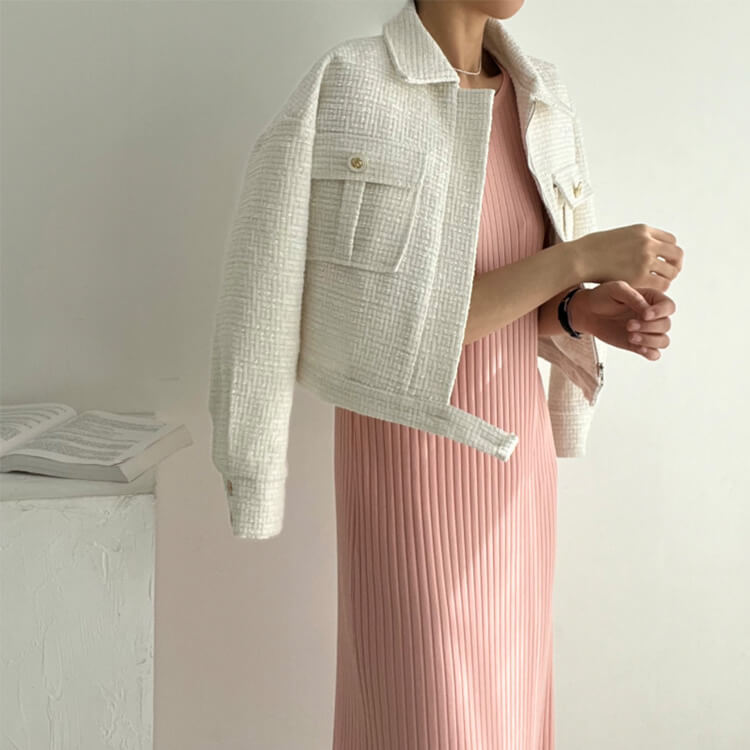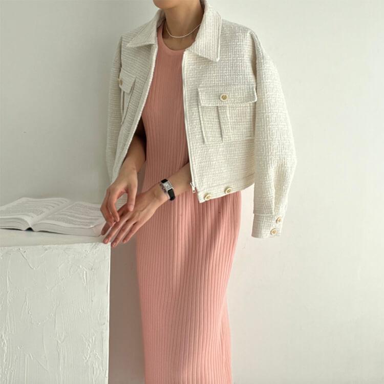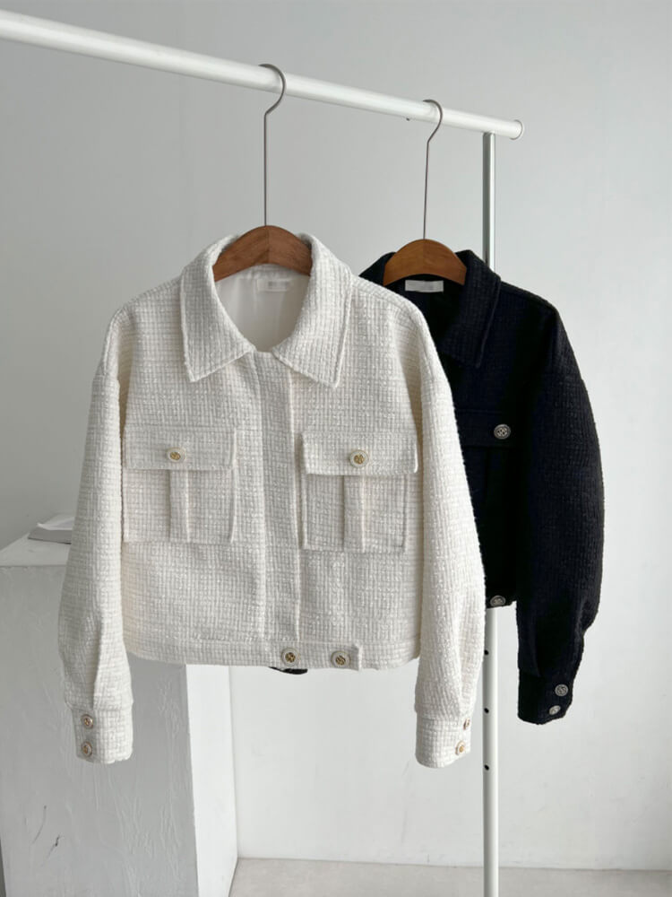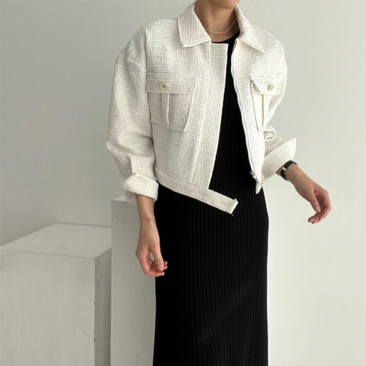 韓国デザインのキレイめカジュアルなベルト付きツイードジャケットアウター。