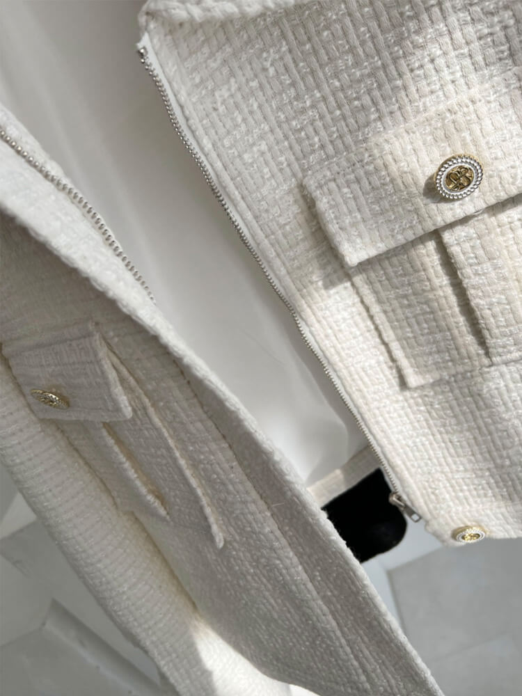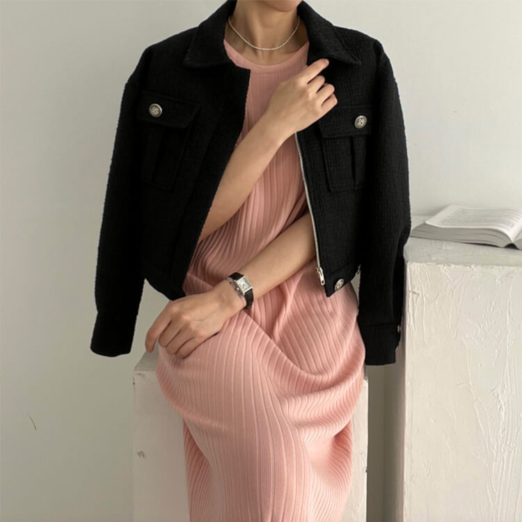 フェミニンなツイード素材をあわせた感がおしゃれなブルゾン。
