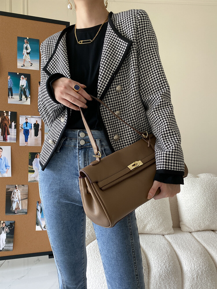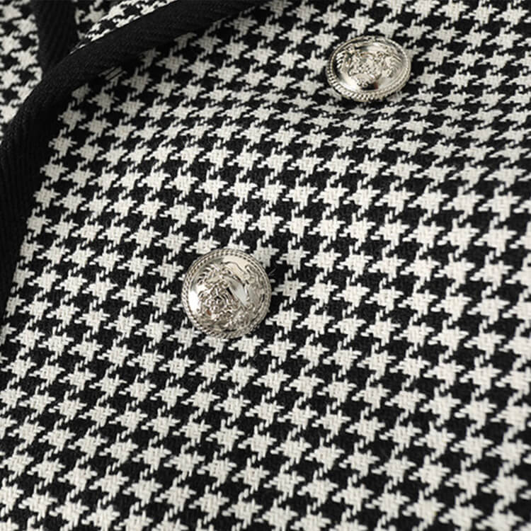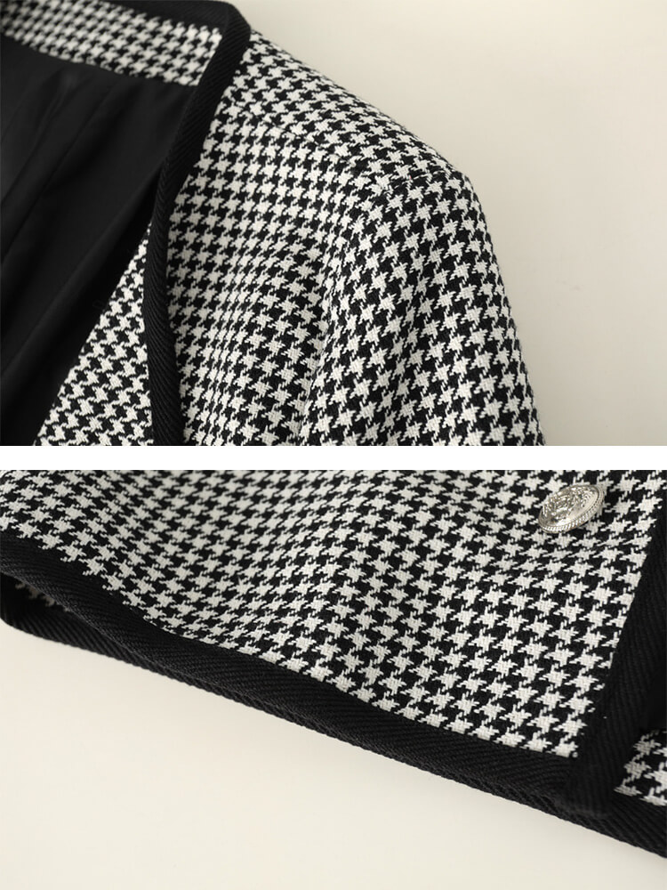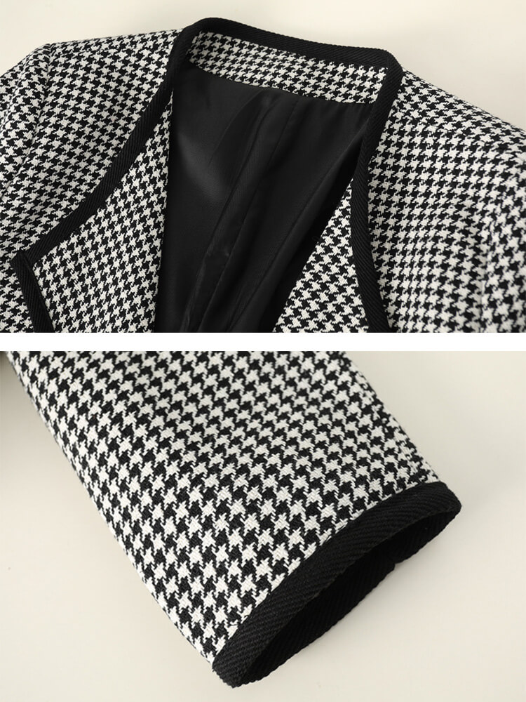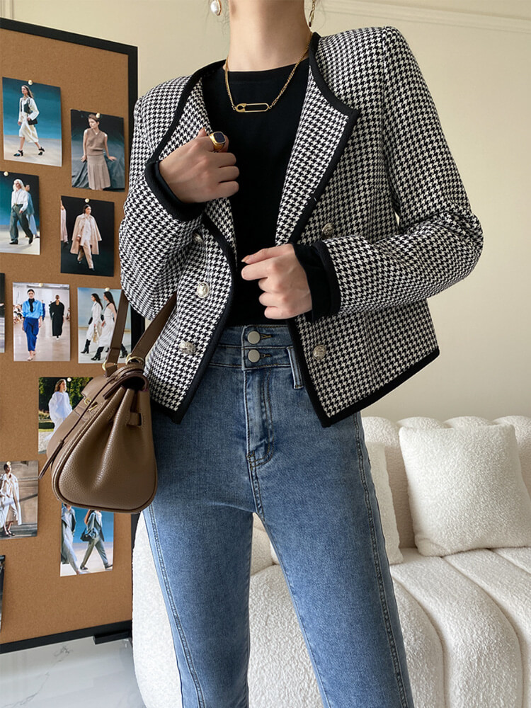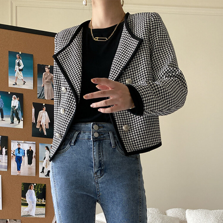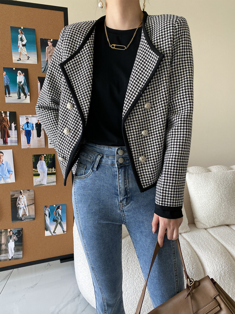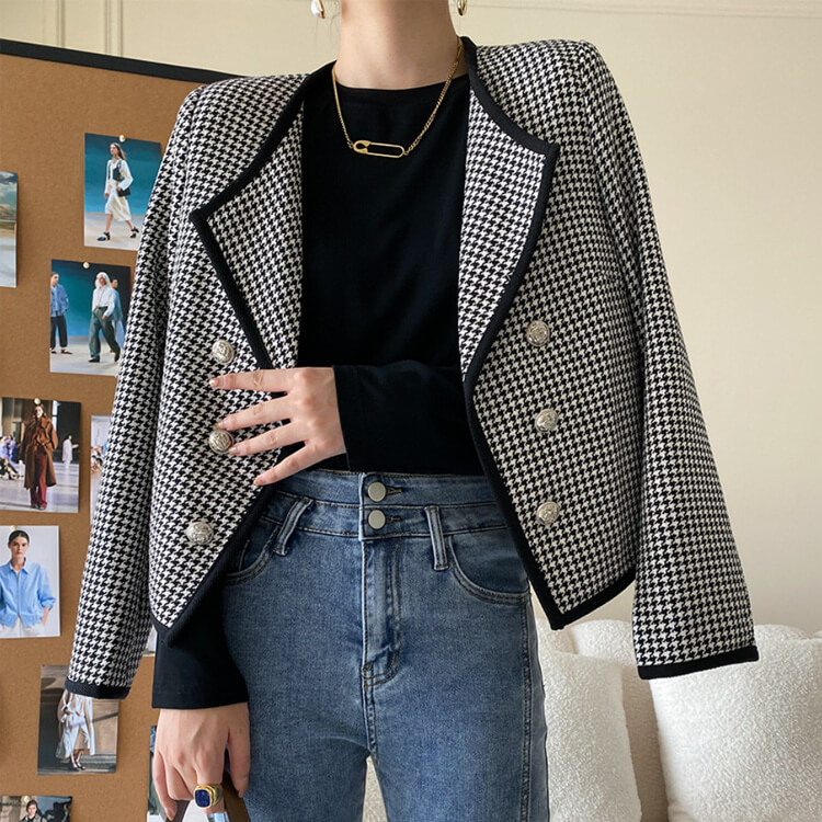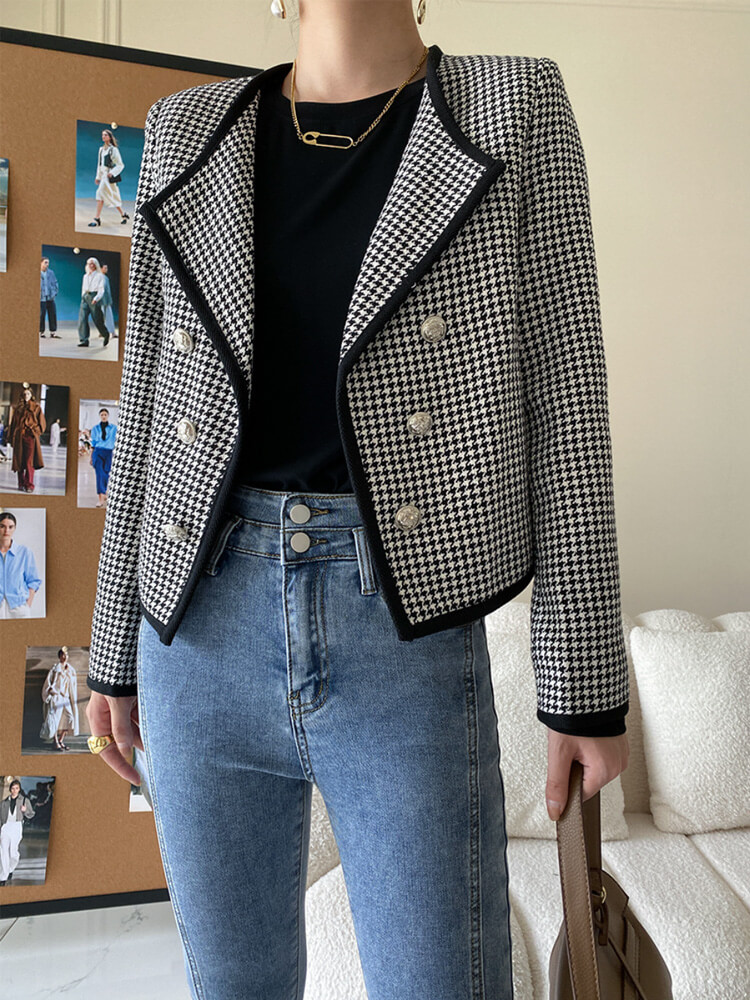黒+白の千鳥格子デザインにダブルボタンがおしゃれなオープンカラージャケット。
