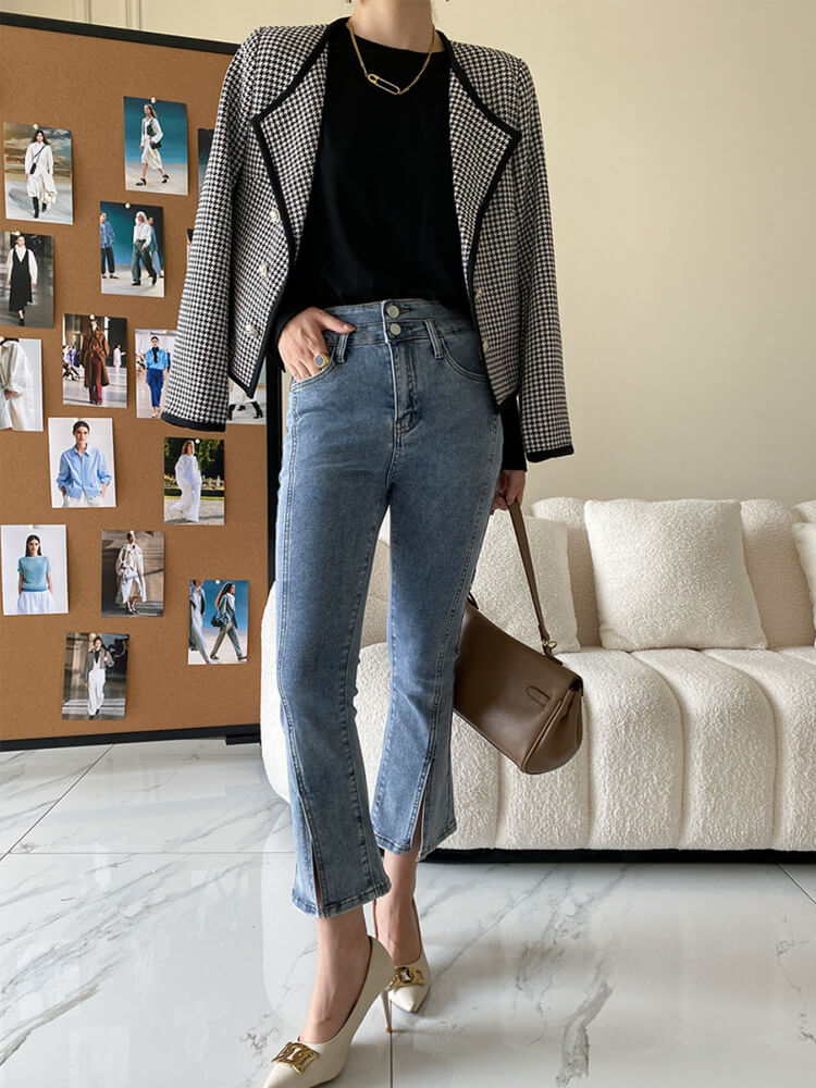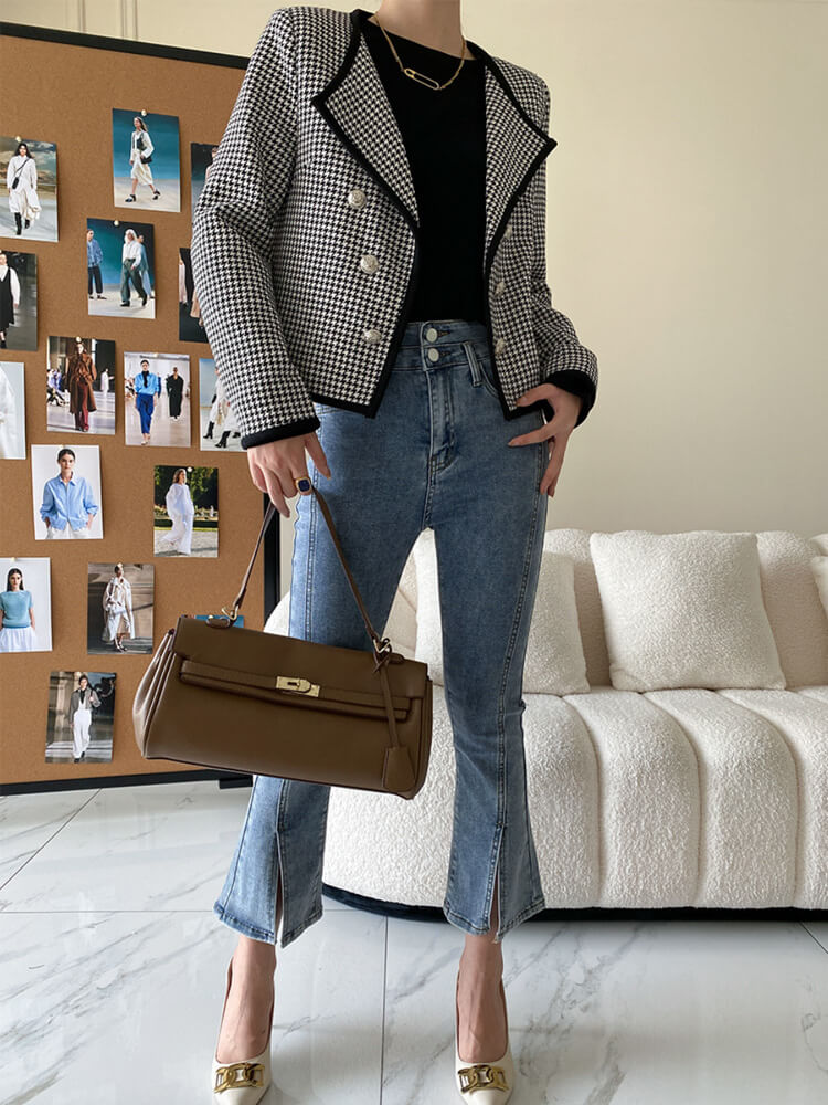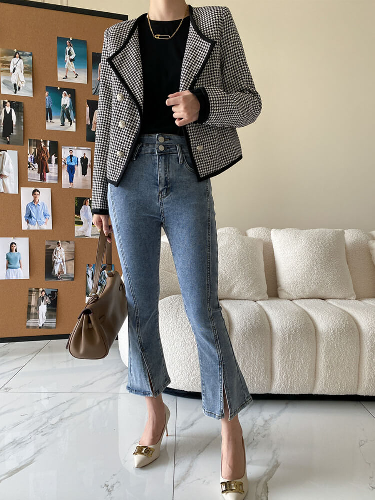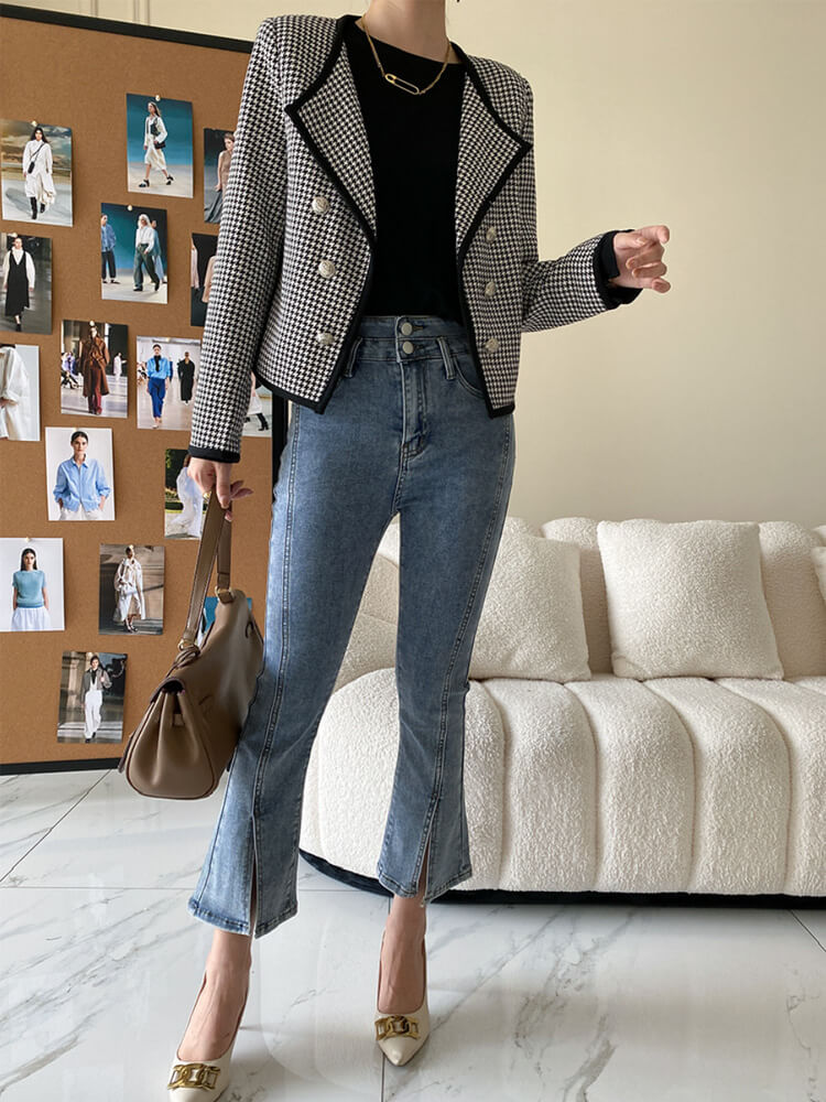 韓国デザインのロンドン風エレガントな千鳥格子柄ジャケットアウター。