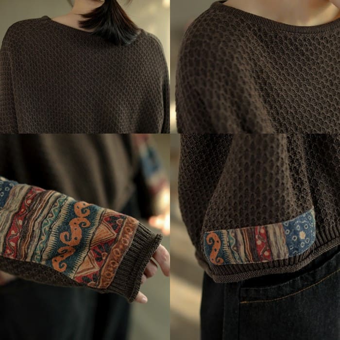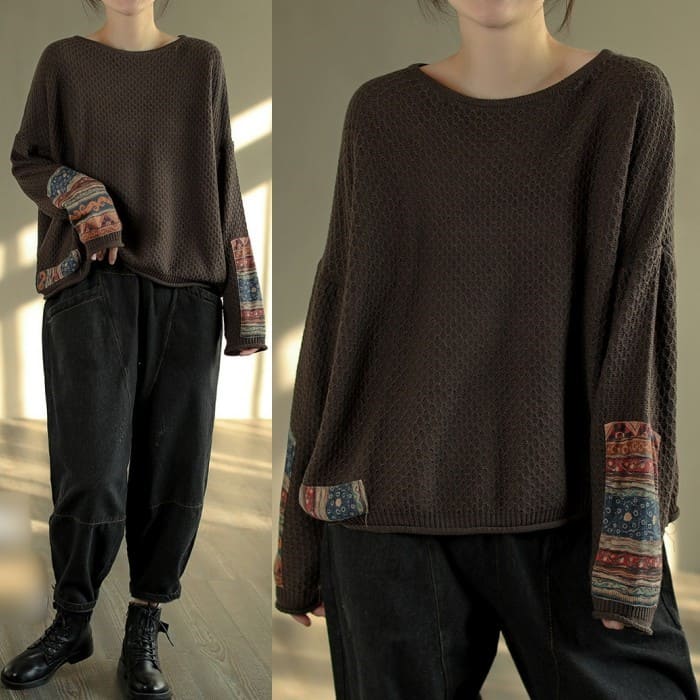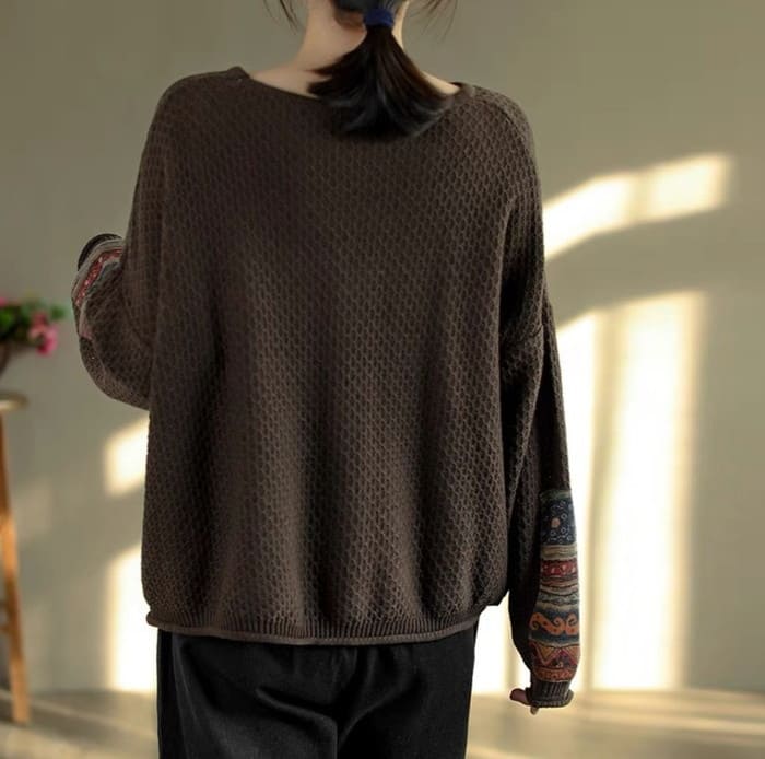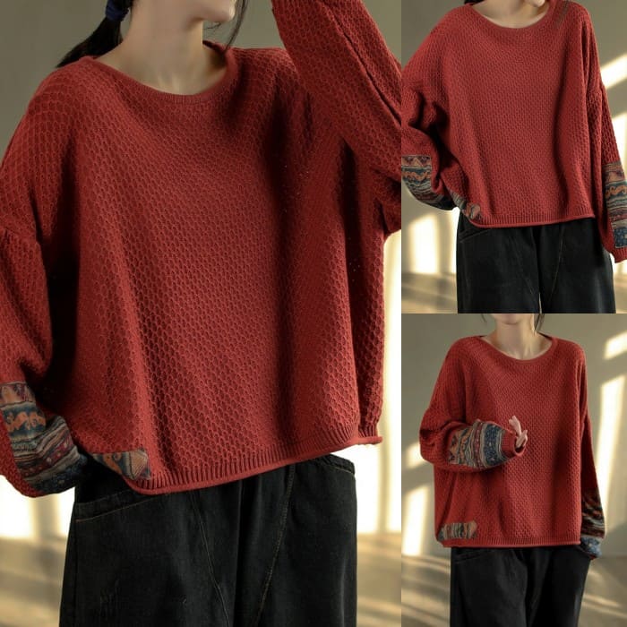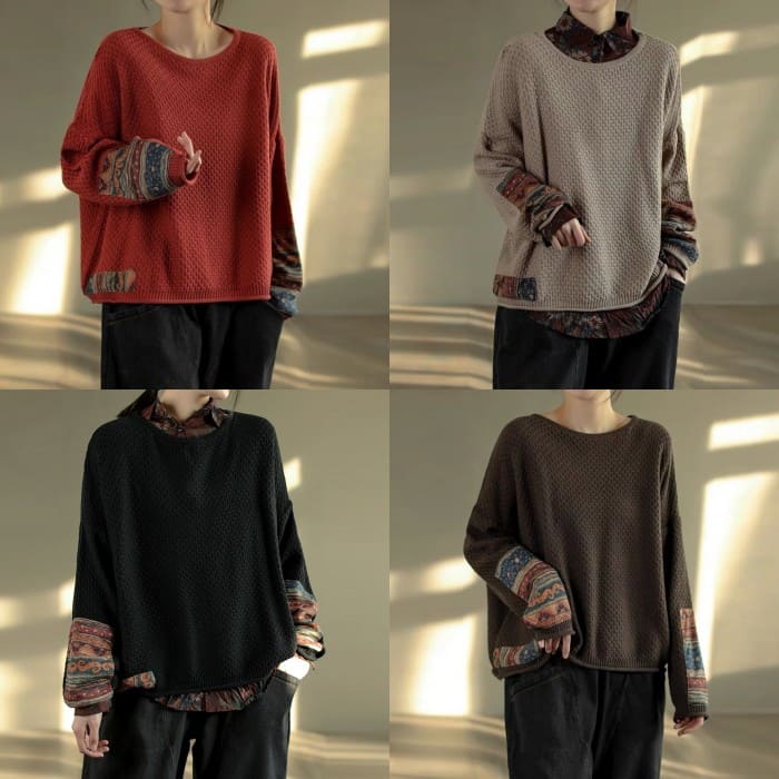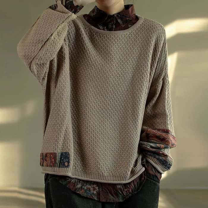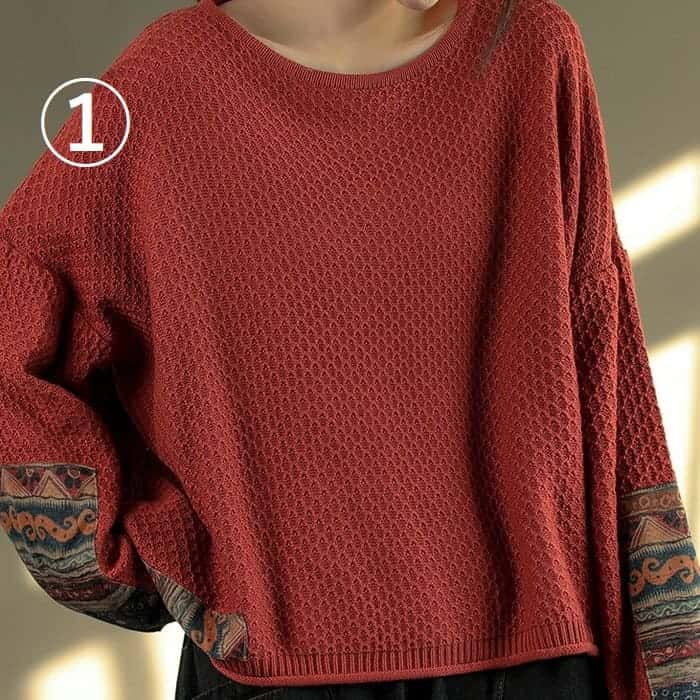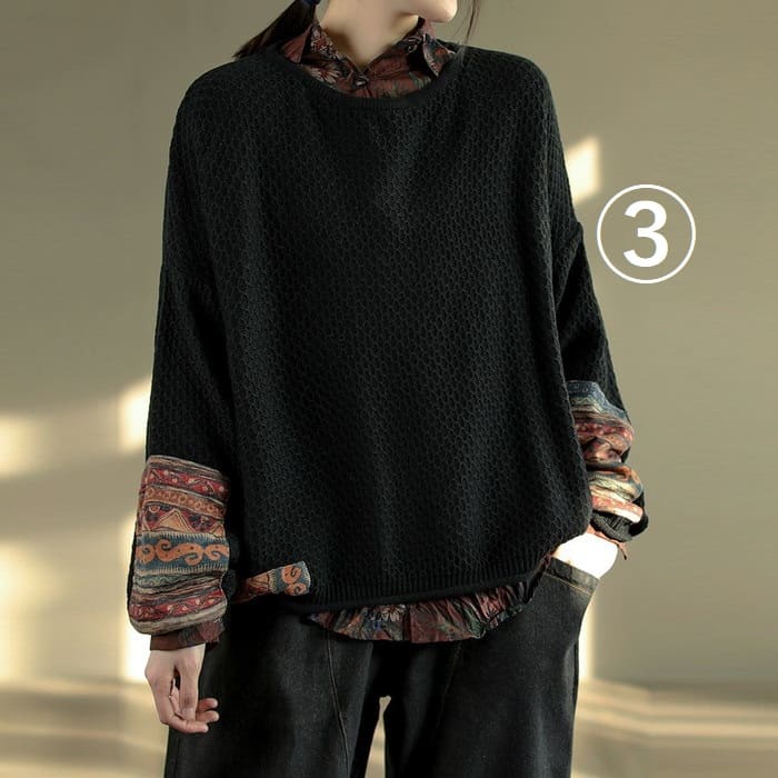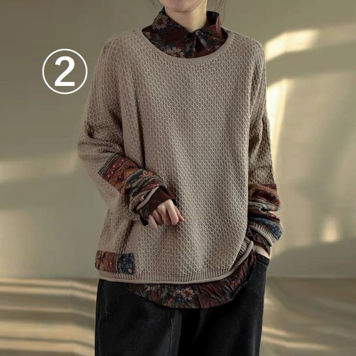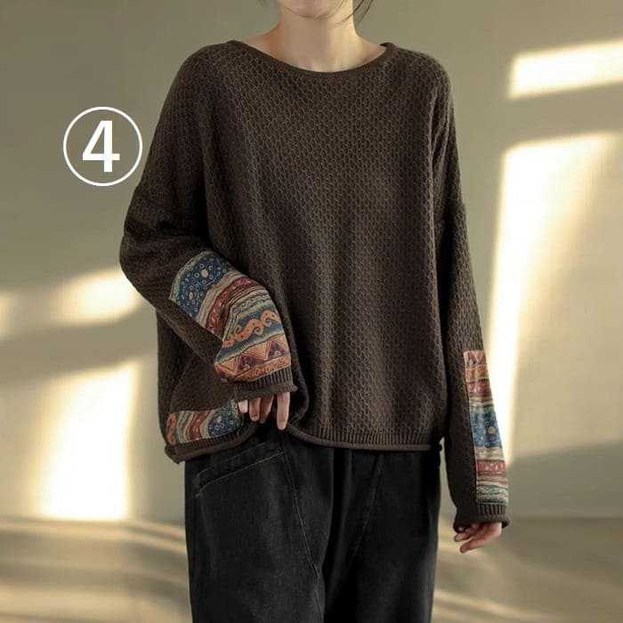 綿ニット プルオーバー レディース 鹿の子編み プリント切替 春秋 50代 お出かけ トップス オシャレ シニア 30代 60代 40代 カジュアル 旅行 長袖