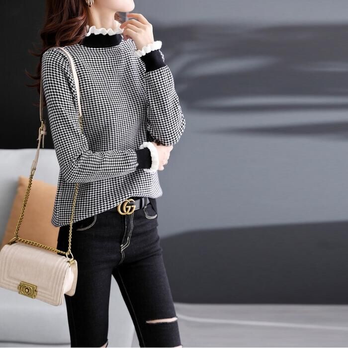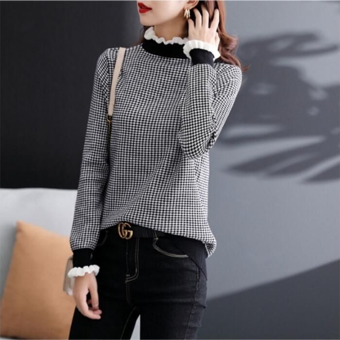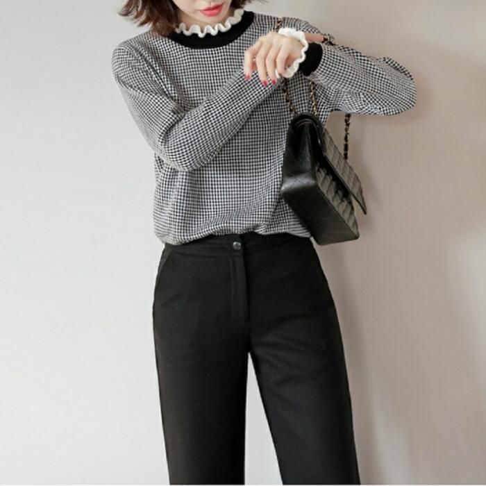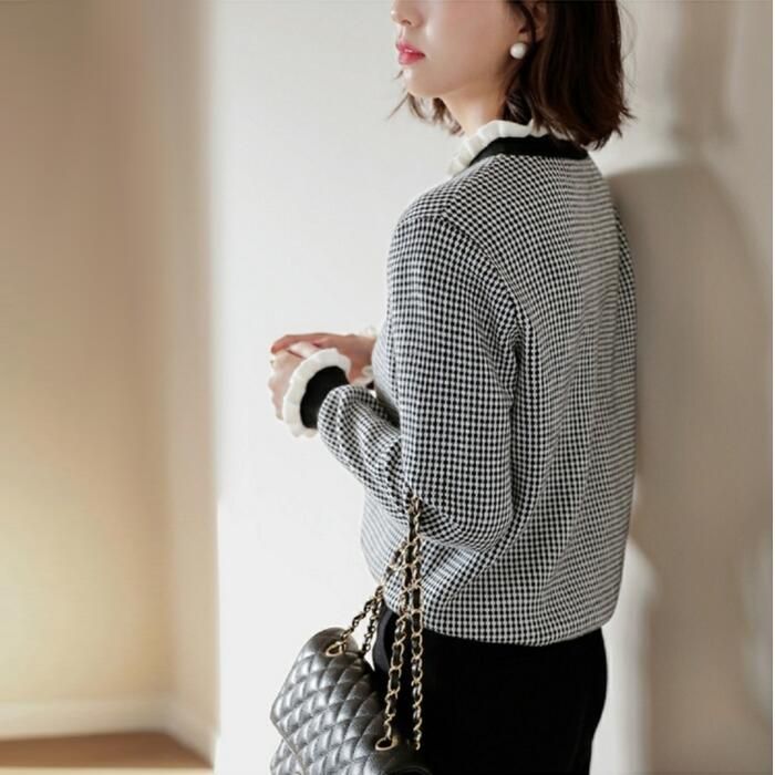 トップス ニット フリル カットソー セーター レディース エレきれいめ 可愛い おしゃれ カジュアル キレカジ 長袖 大人 バイカラ チェック フェミニン