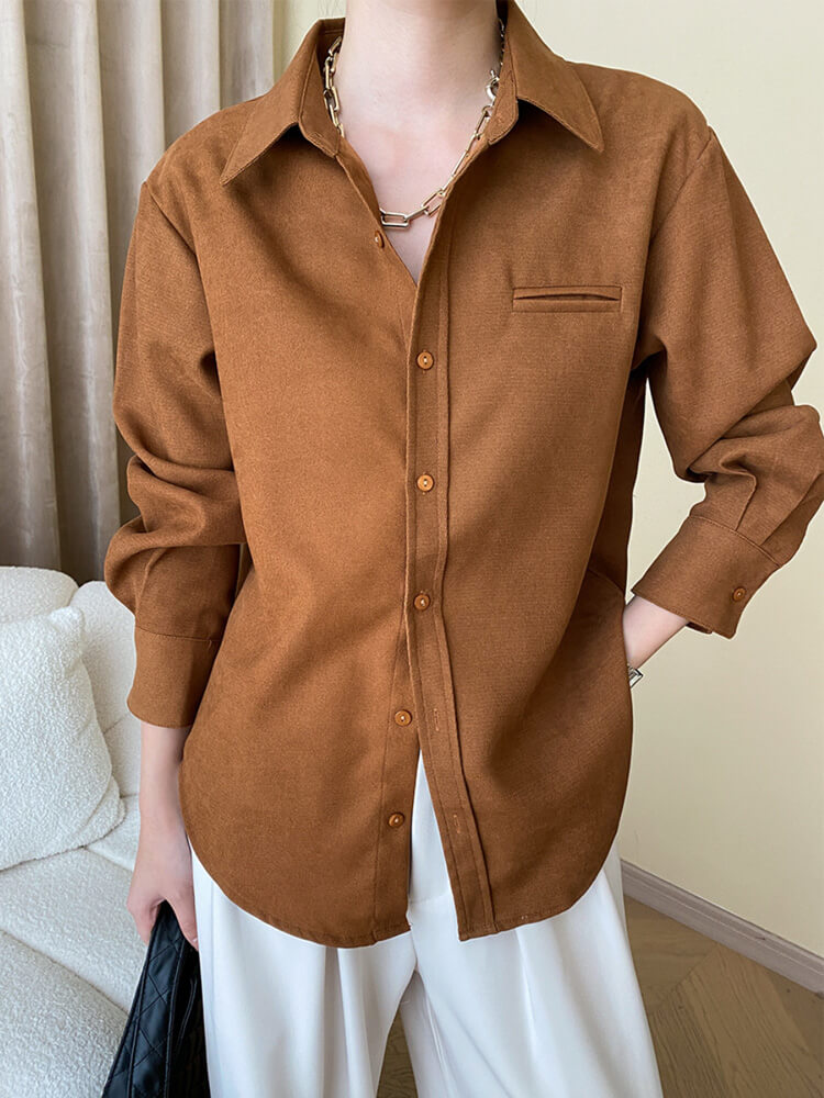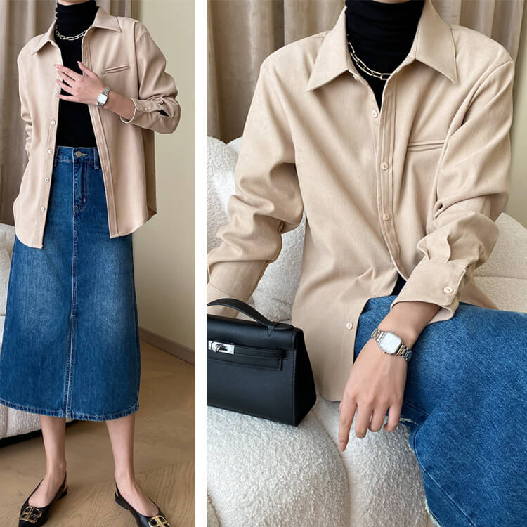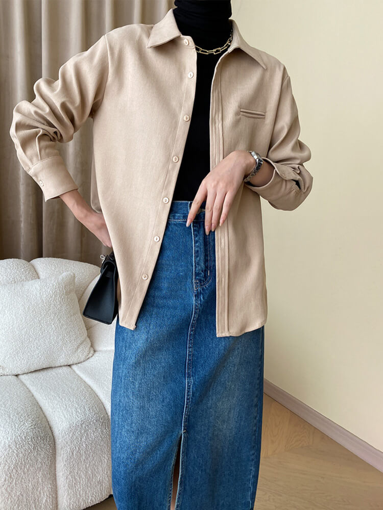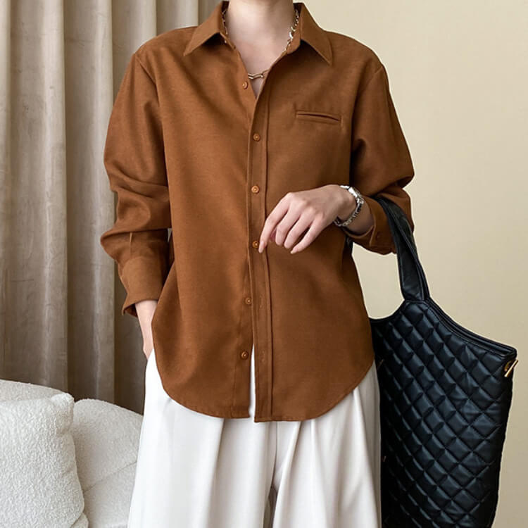 しっかりとした素材感がゆったりと着つつもスタイリッシュな印象のシャツブラウス。