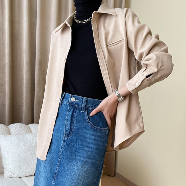 ゆったりとしたフィット感で体系カバーしつつ、シャツとしてシングルで着ても、インナーと合わせてシャツアウターとしてもおしゃれ。