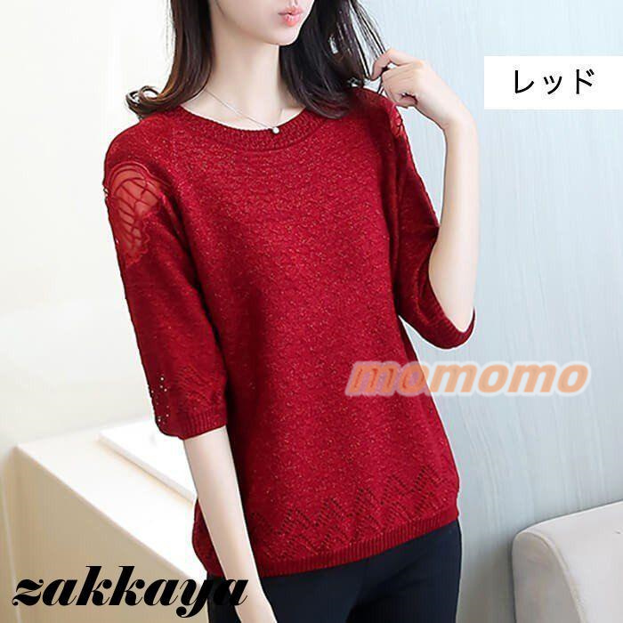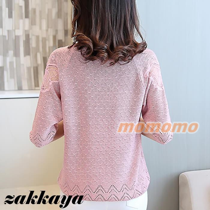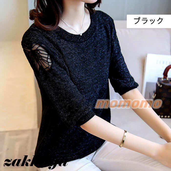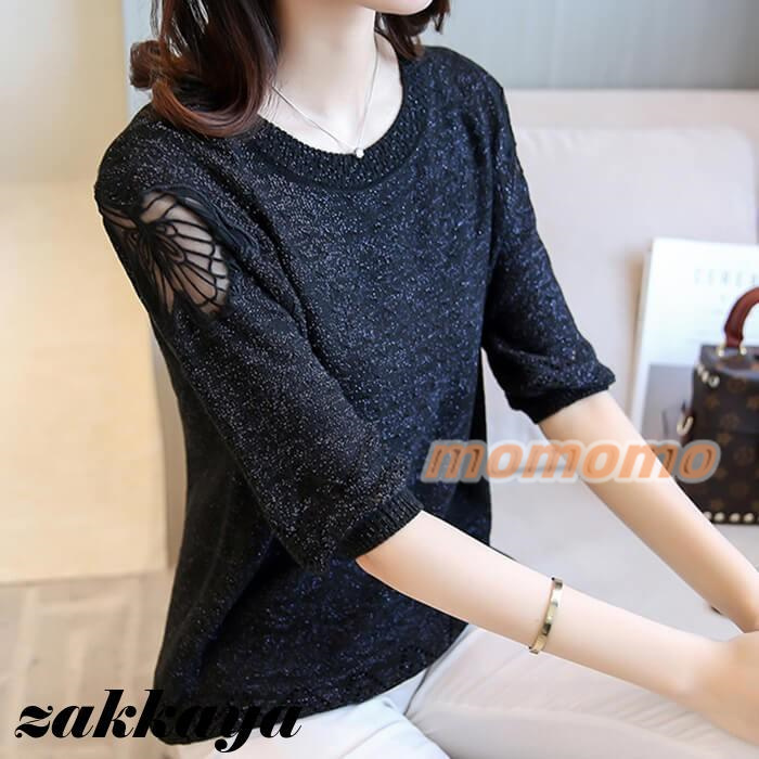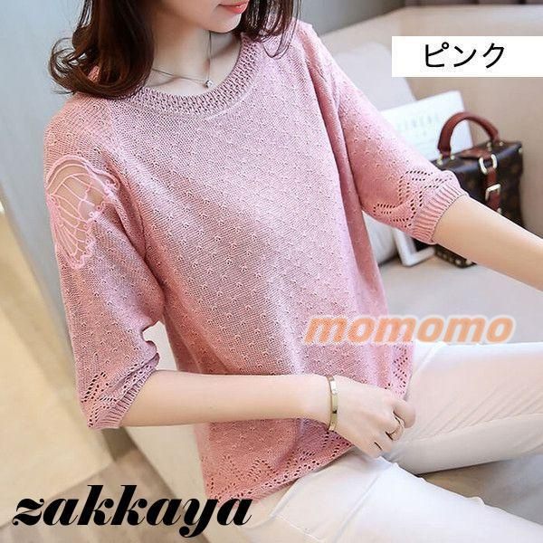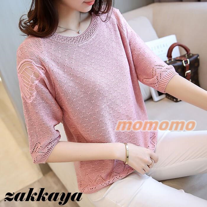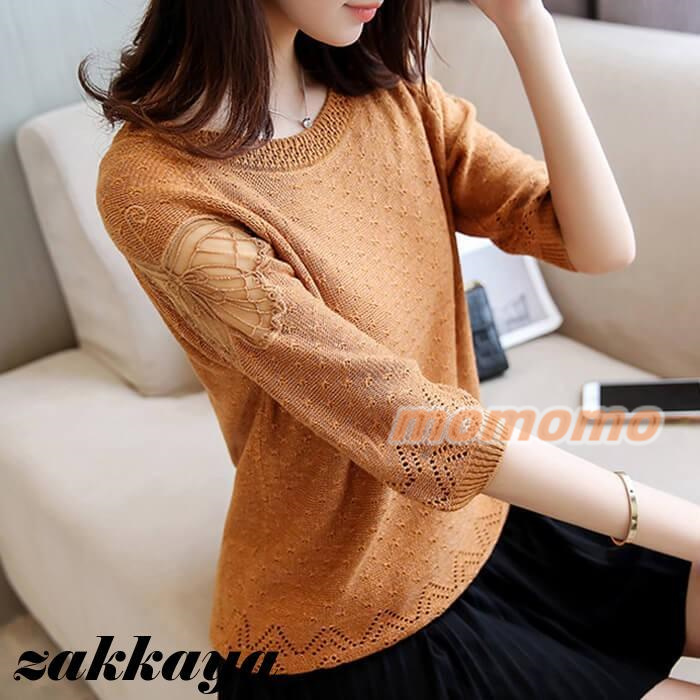 ニット セーター 七分袖 レディース 薄手 春 夏 秋 丸首 ボートカラー レース 編み 蝶々 可愛い 無地 おしゃれ カジュアル