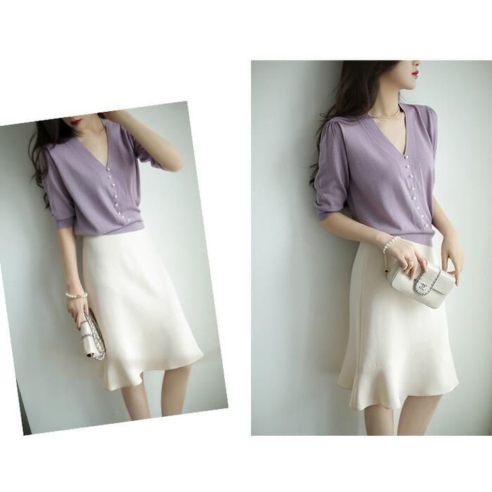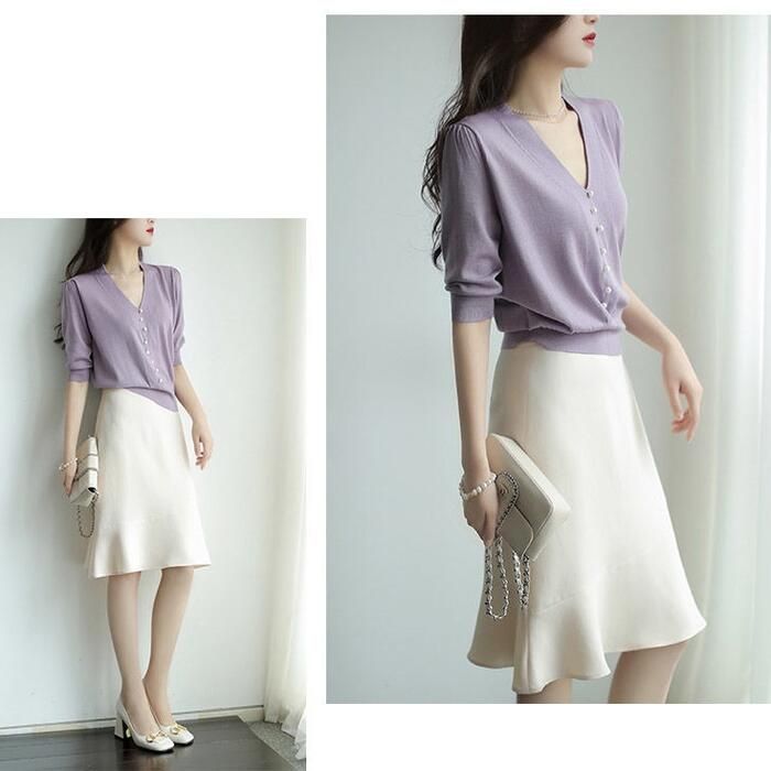 トップス サマーニット レディース きれいめ カジュアル 薄手 大人 上品 Vネック パープ カットソー パール カーディガンオフィス おしゃれ 七分袖 可愛い 半袖